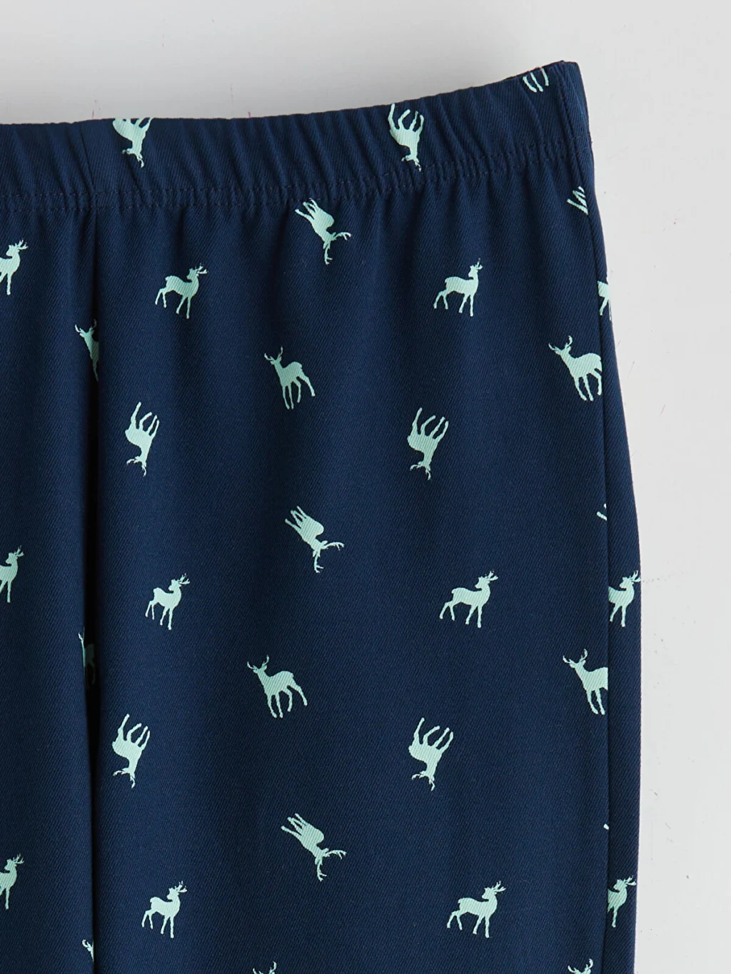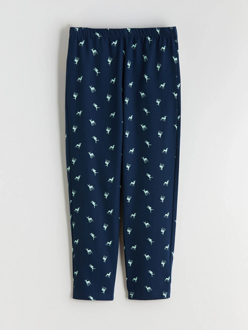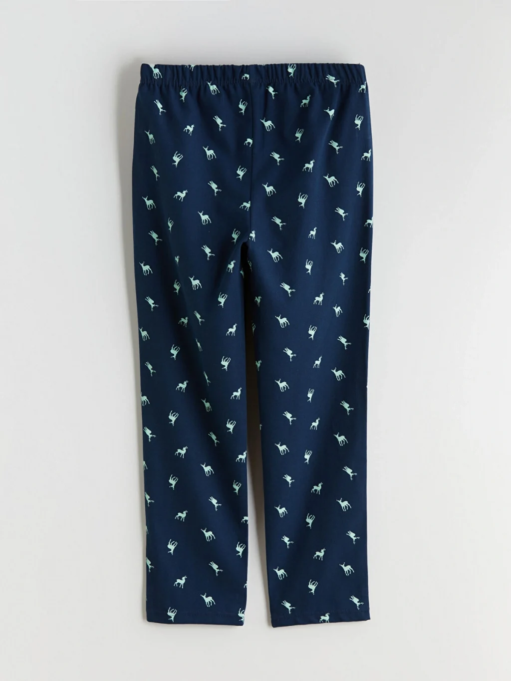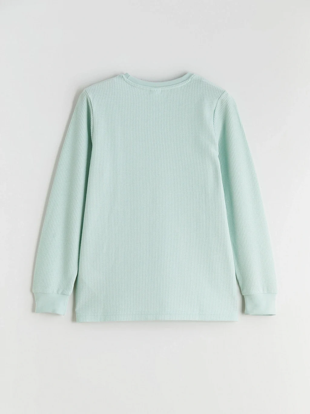 %100 pamuk waffle kumaştan üretilen erkek çocuk pijama takımı, bisiklet yaka, uzun kollu üst ve desenli alt parçadan oluşmaktadır.