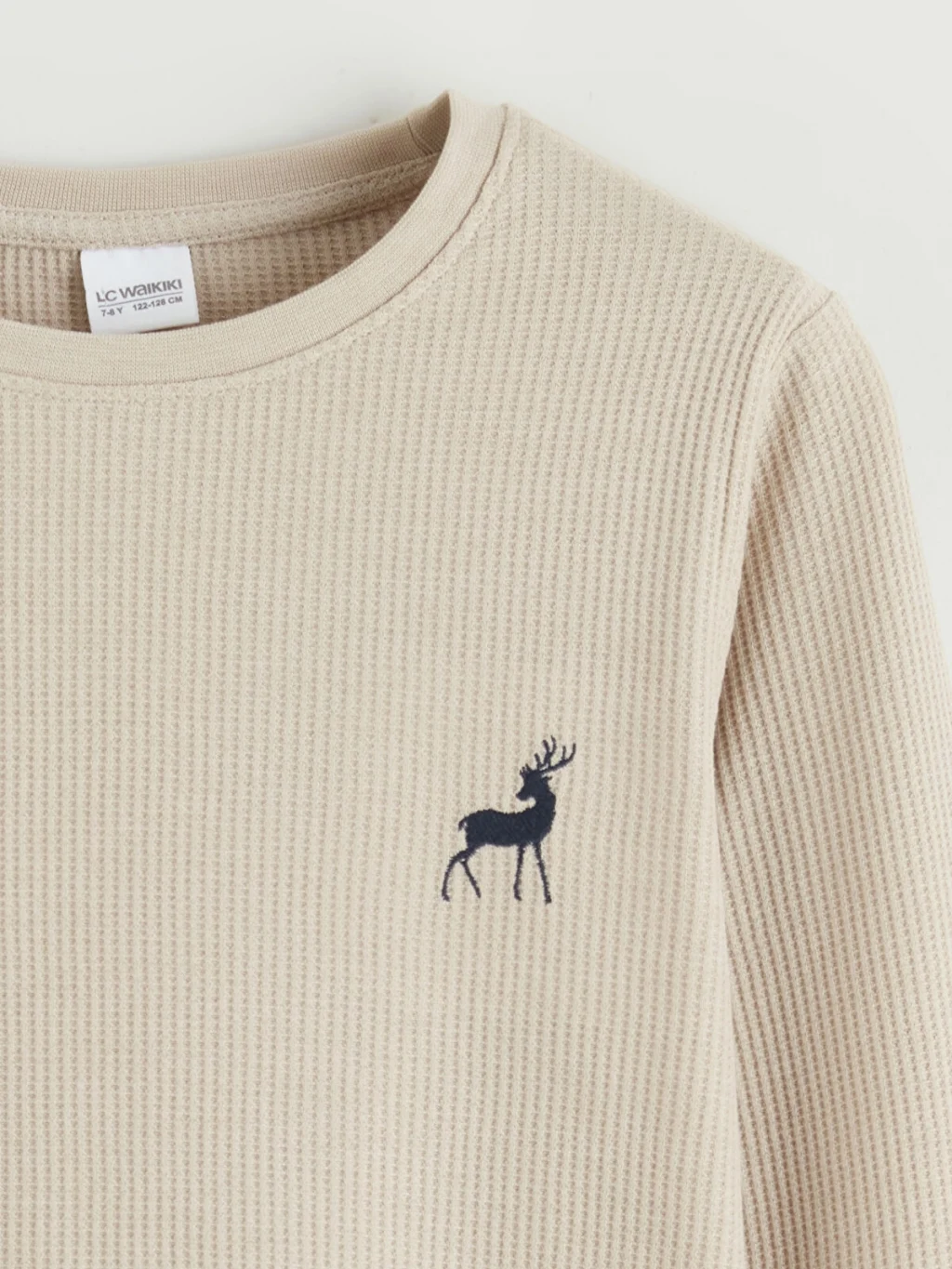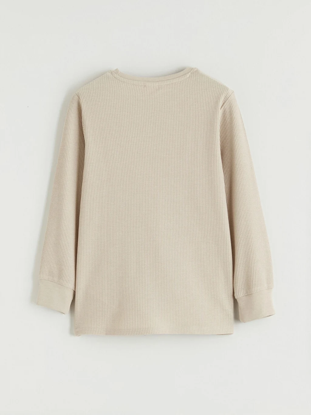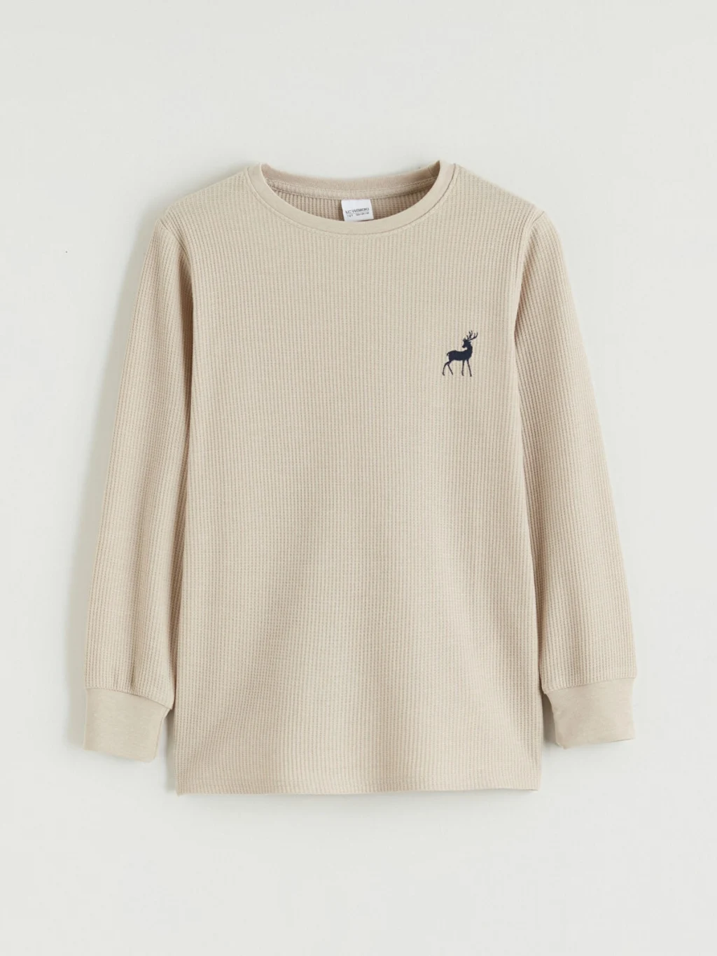 Erkek çocuk pijama takımı, %100 pamuklu waffle kumaştan üretilmiş bisiklet yaka, uzun kollu üst ve desenli alttan oluşur.