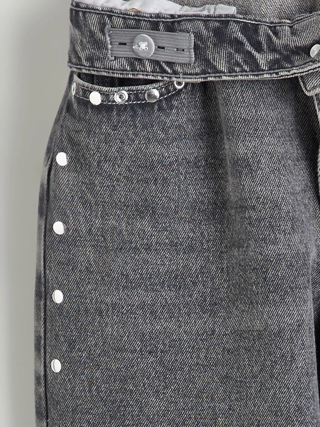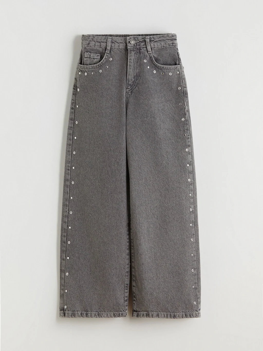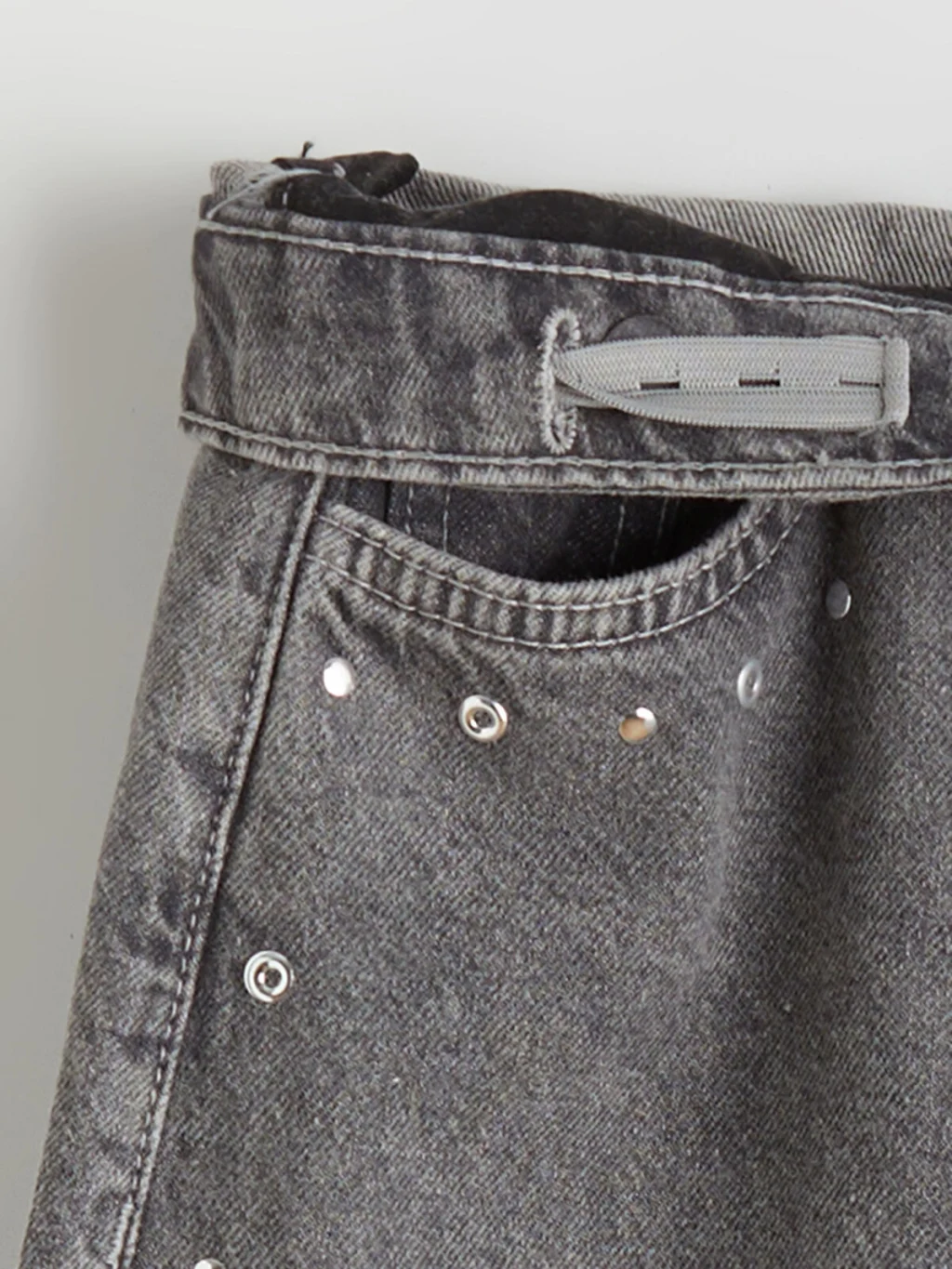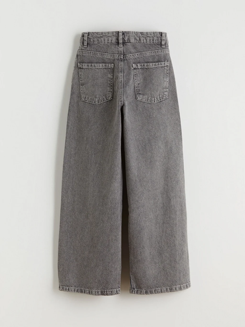 Wideleg kız çocuk denim pantolon, yüksek bel ve geniş paça kesime sahiptir. Beli içten ayarlanabilir lastiklidir.