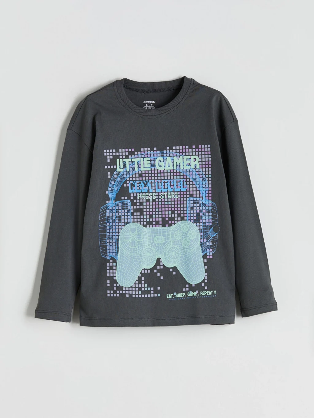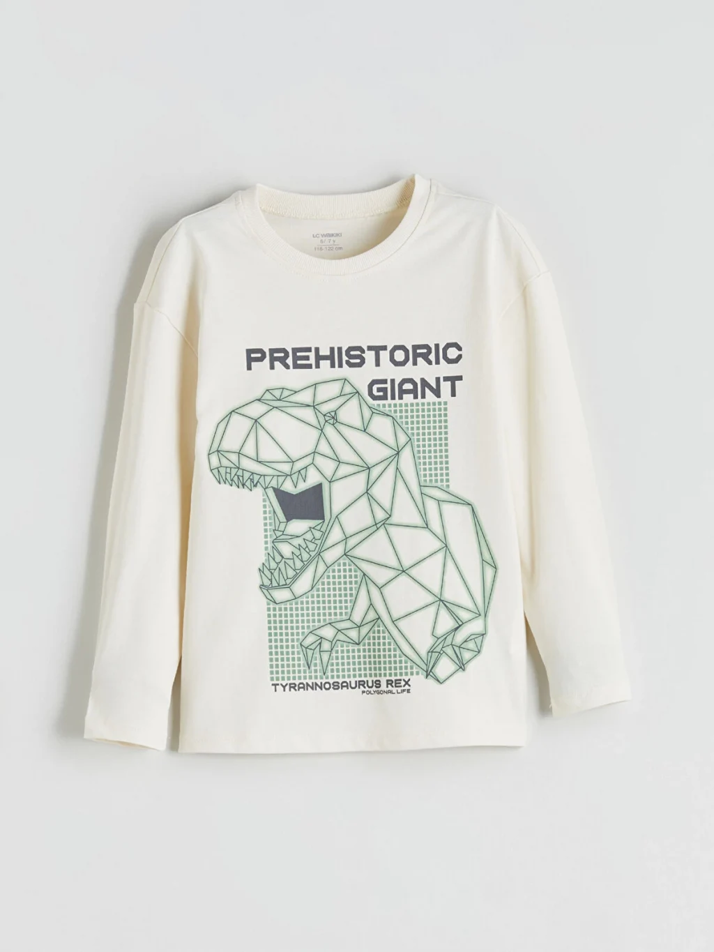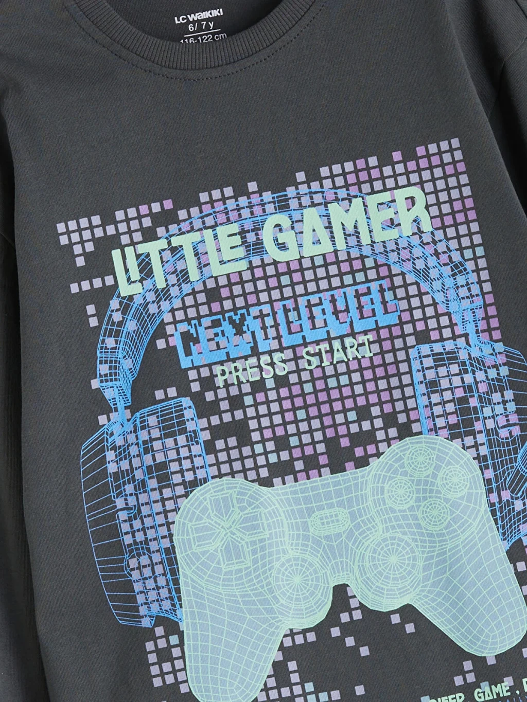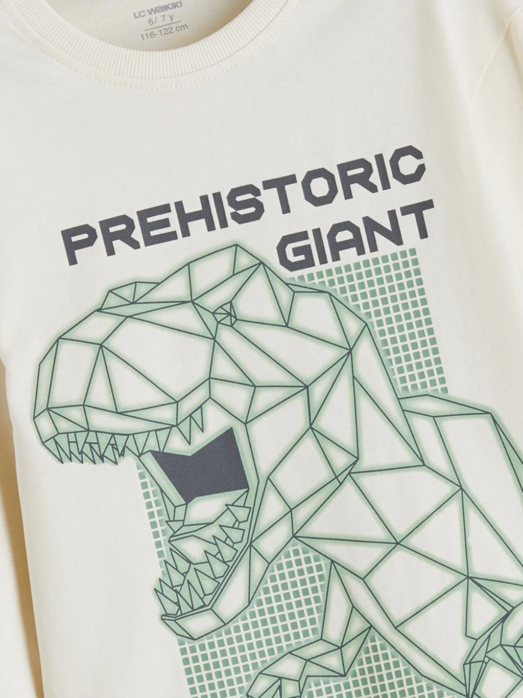 Oversize kalıplı erkek çocuk tişört, penye kumaştan üretilmiştir. Bisiklet yaka, uzun kollu ve önü baskılı tasarıma sahiptir.