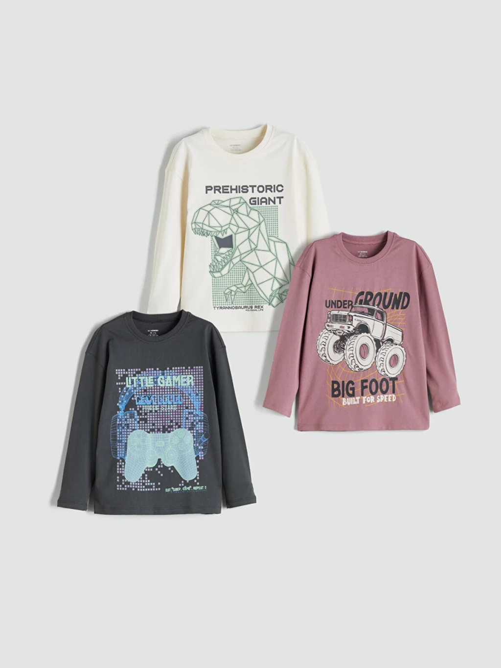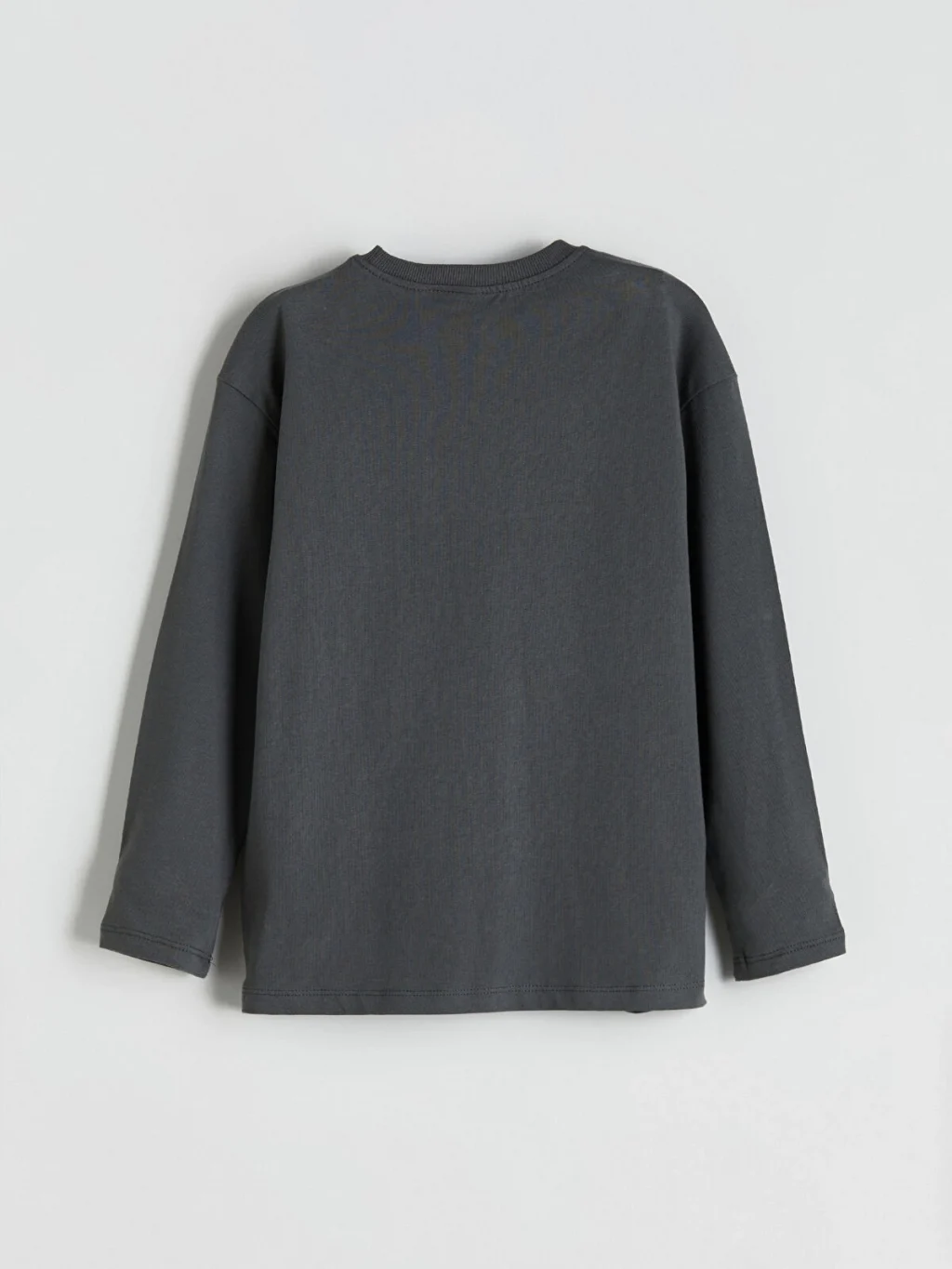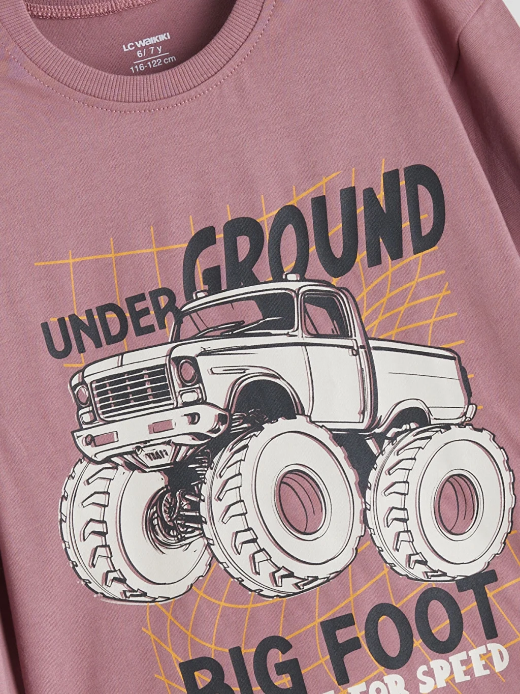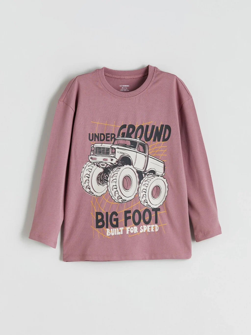 Oversize kalıplı erkek çocuk tişört, penye kumaştan üretilmiştir. Bisiklet yaka, uzun kollu ve önü baskılı tasarıma sahiptir.