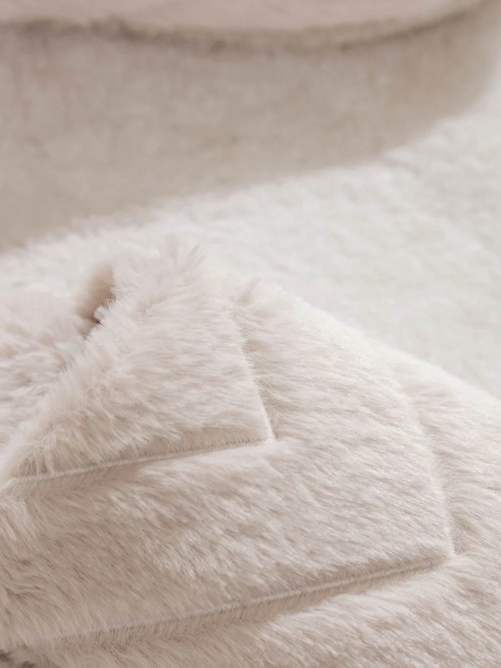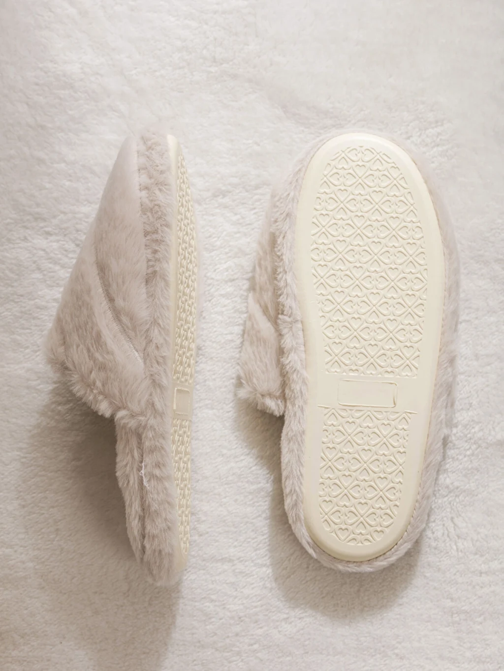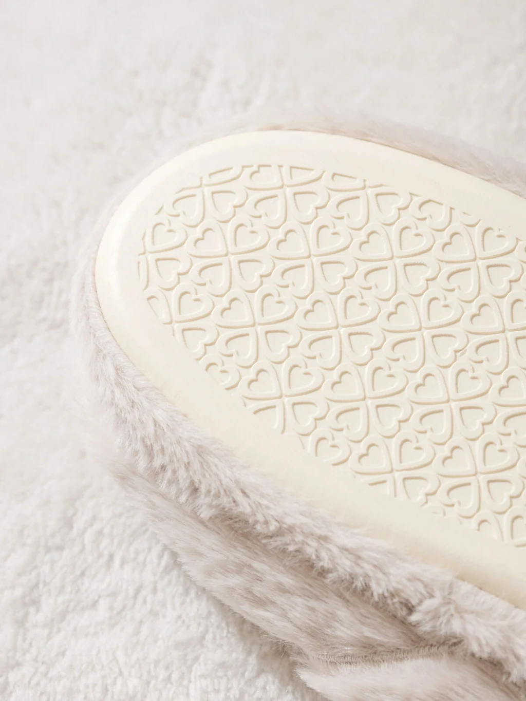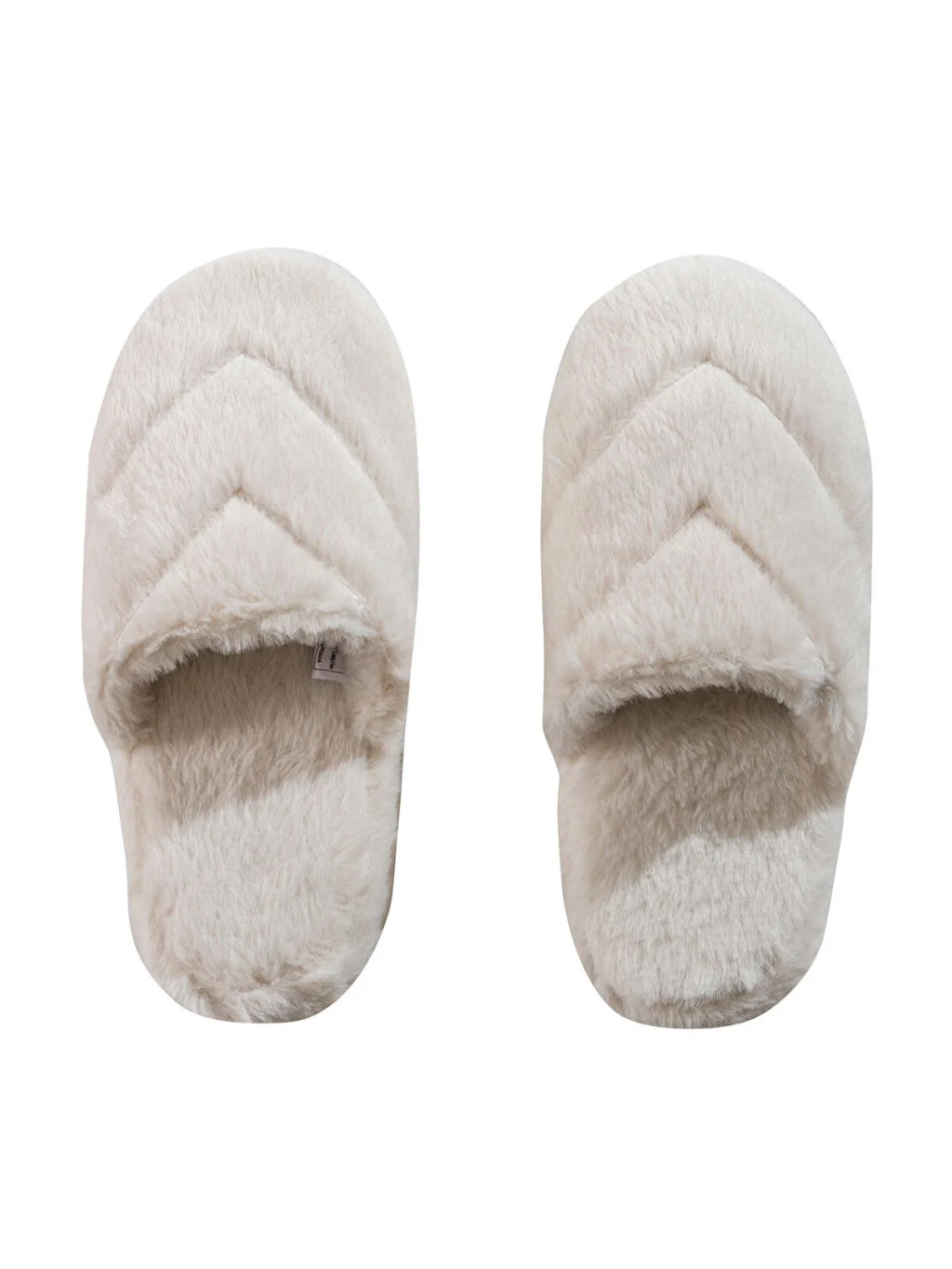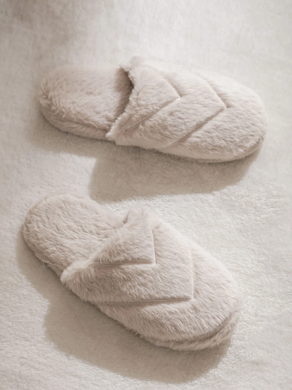 Peluş yüzeyli kadın panduf, üst bandında V şeklinde kapitone dikiş detayına sahiptir. Arkası açık tasarımlıdır.