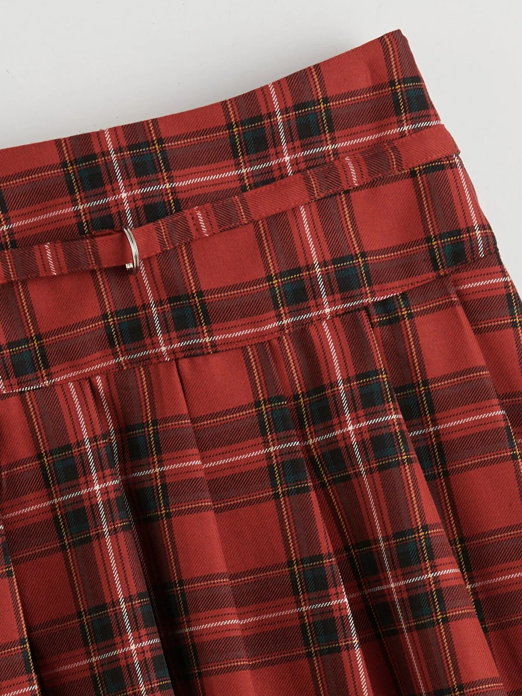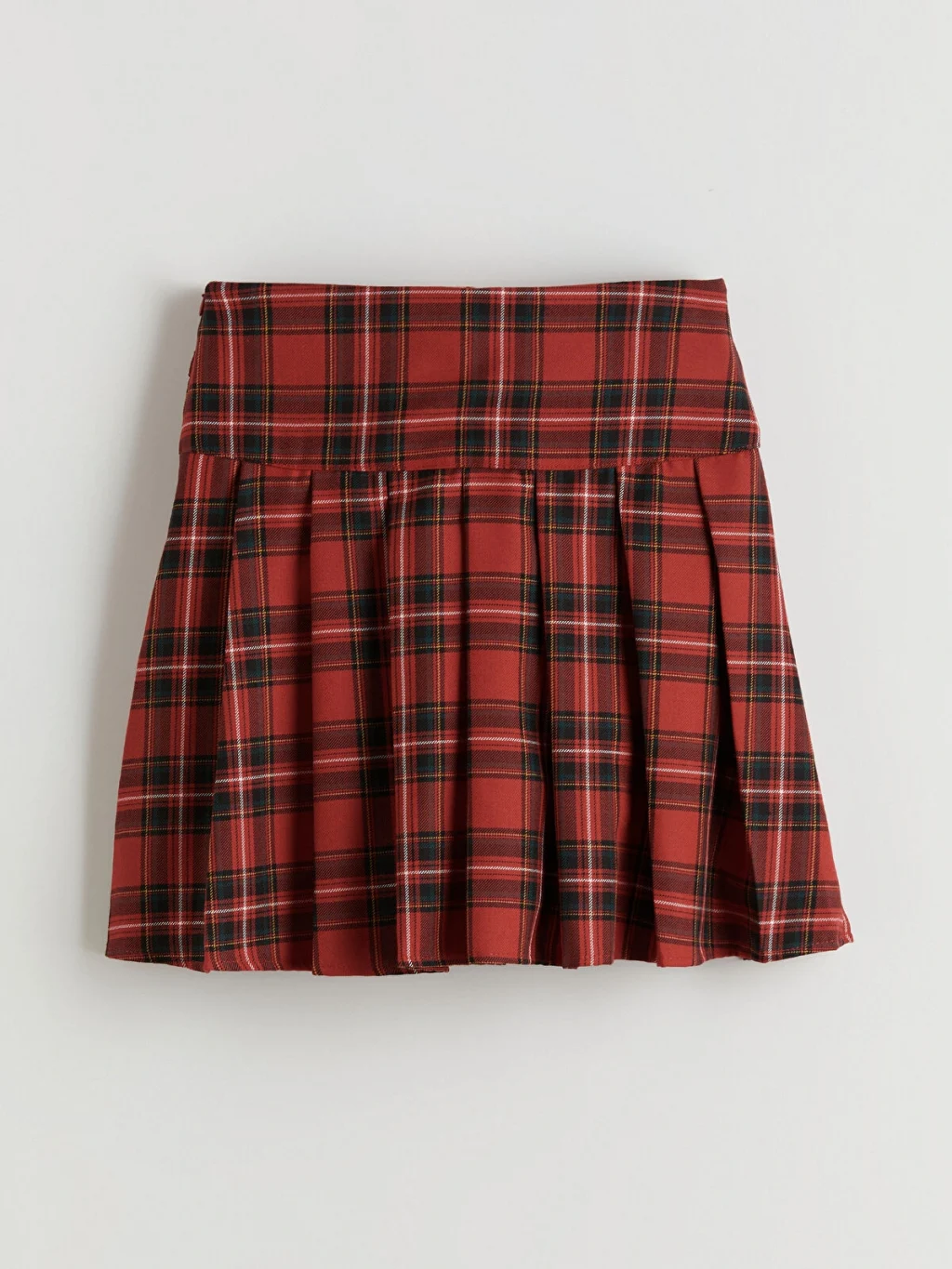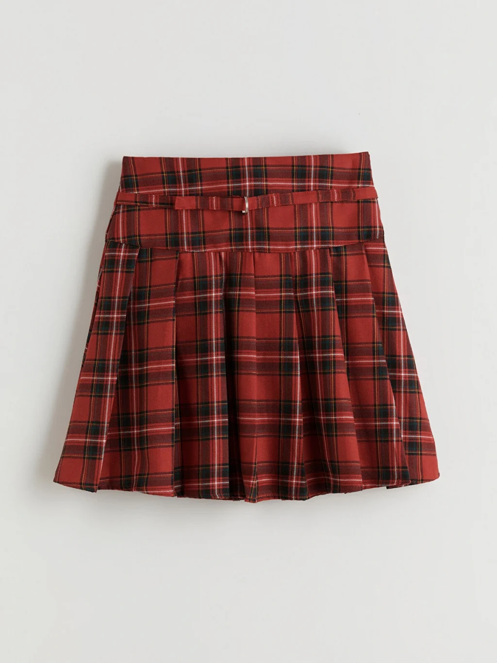 Poliviskon kumaştan üretilen ekose desenli kız çocuk etek, pili detaylıdır. Kısa boylu ve astarsız modelin beli kemerlidir.