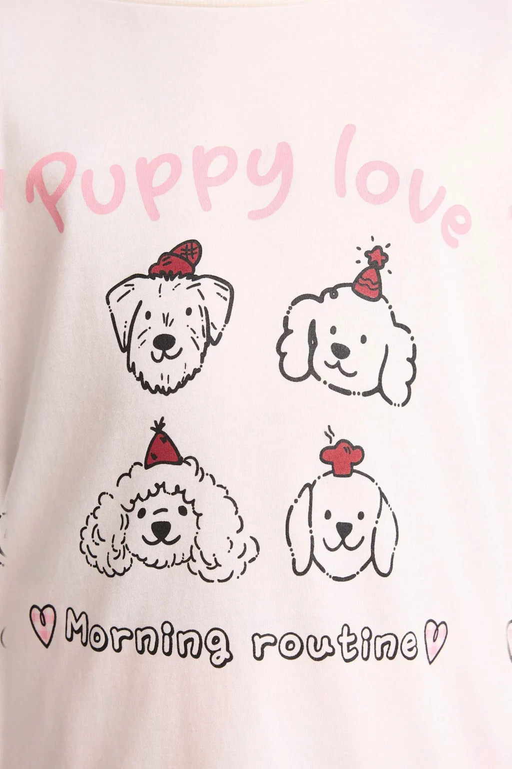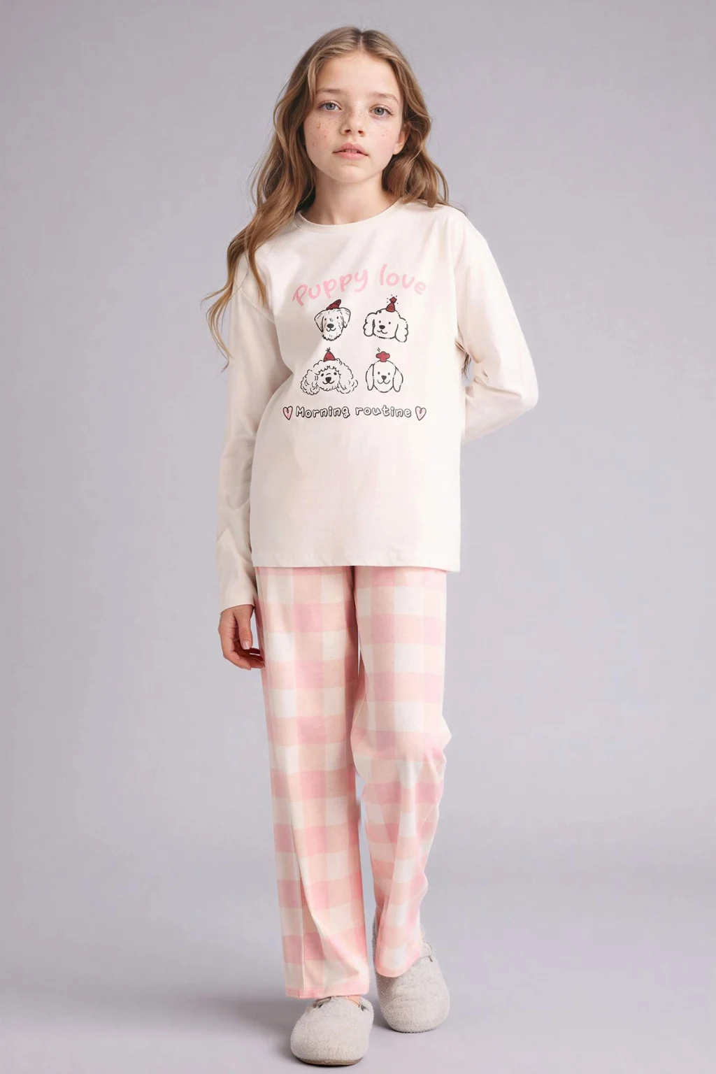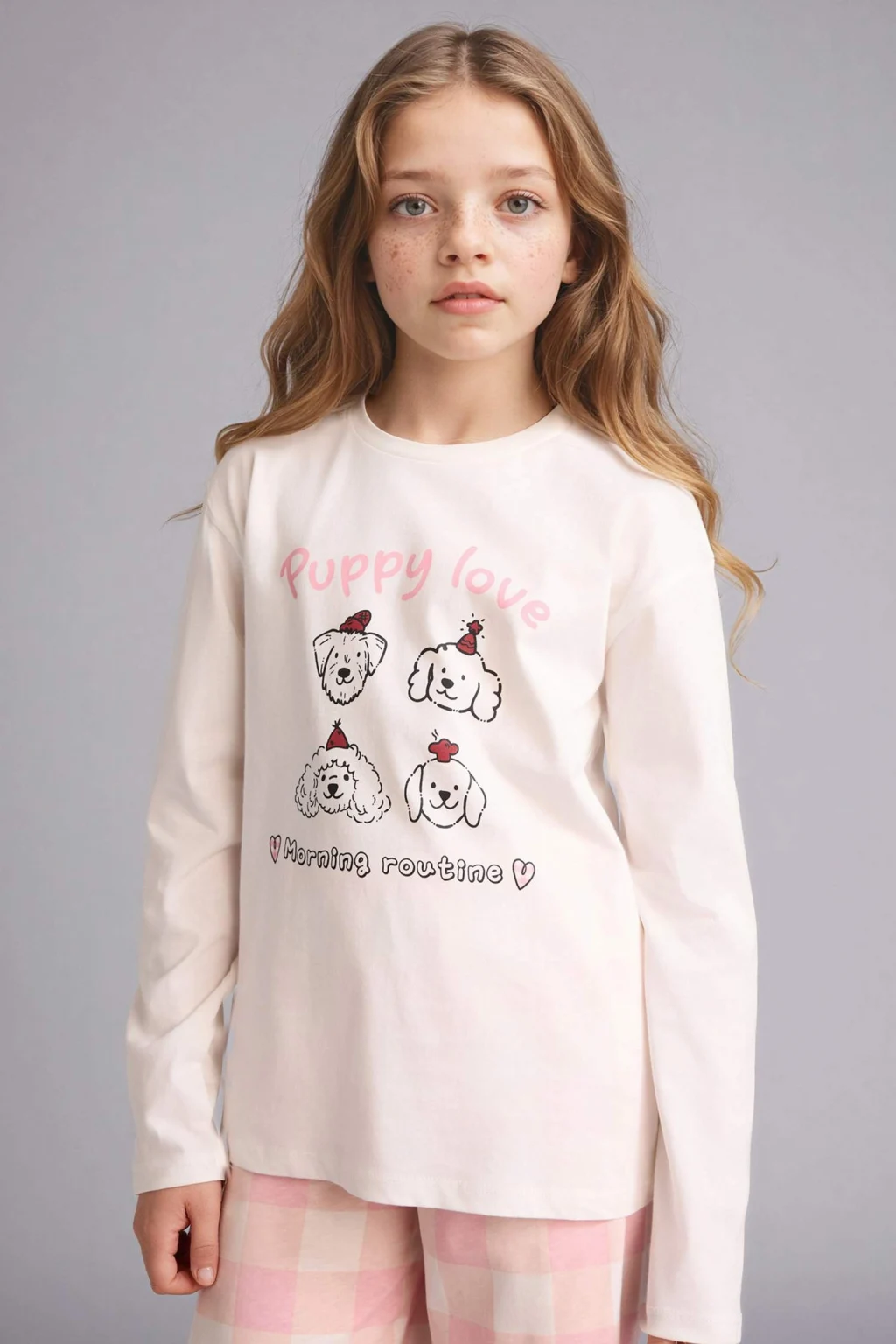 Sevimli baskılı üst ve desenli alt parçadan oluşan bu pijama takımı, rahat kalıbıyla konforlu bir kullanım sunar. Yumuşak dokusu sayesinde gece boyunca özgürce hareket etmeyi destekler, şık tasarımıyla keyifli bir uyku stilini tamamlar.