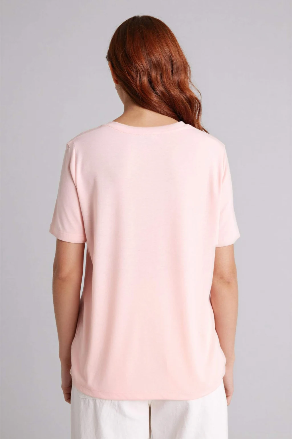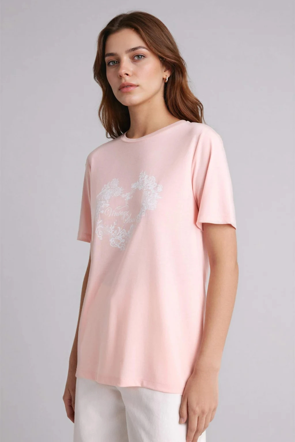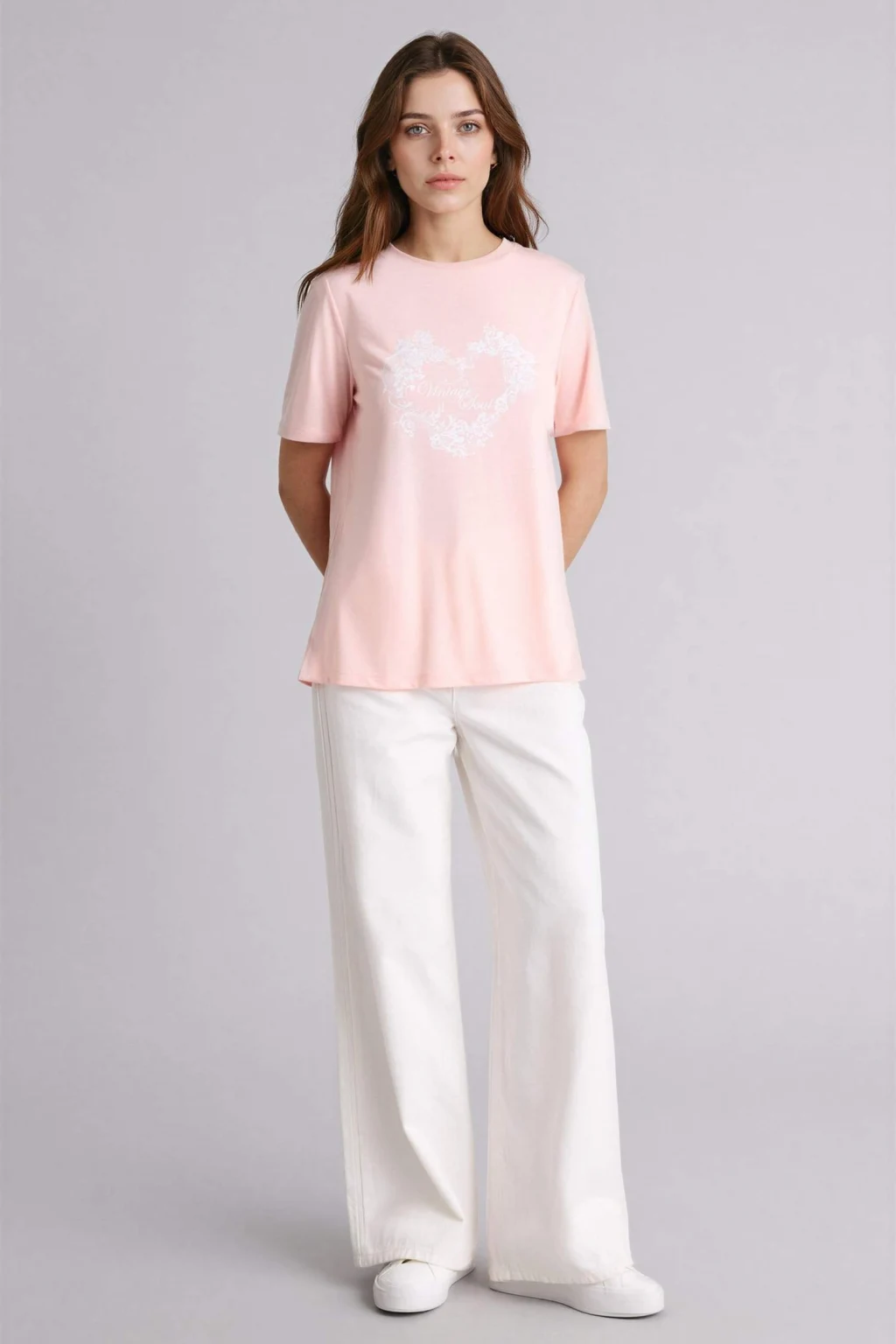 LCW Vision Pembe Bisiklet Yaka Nakışlı Kadın Tişört