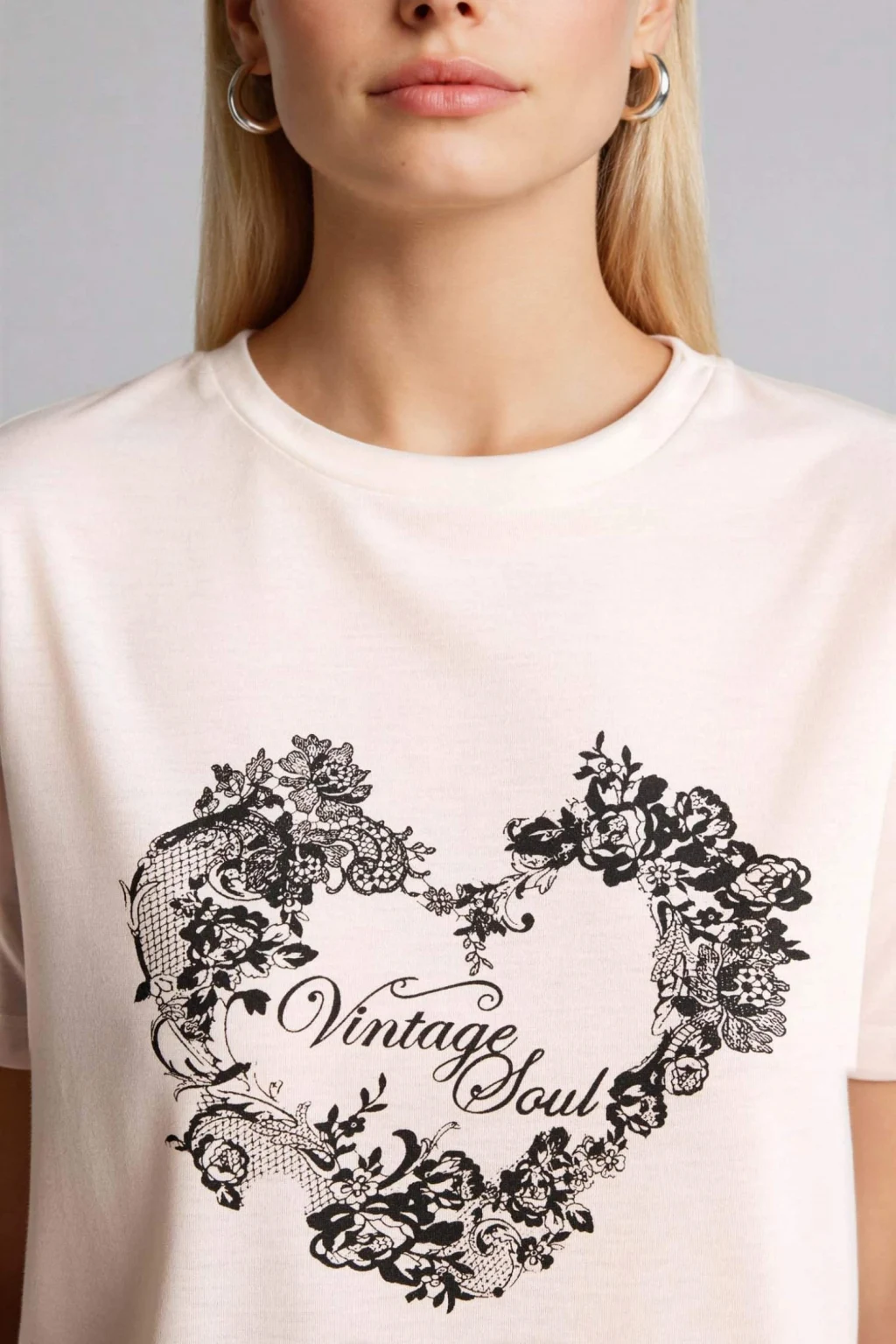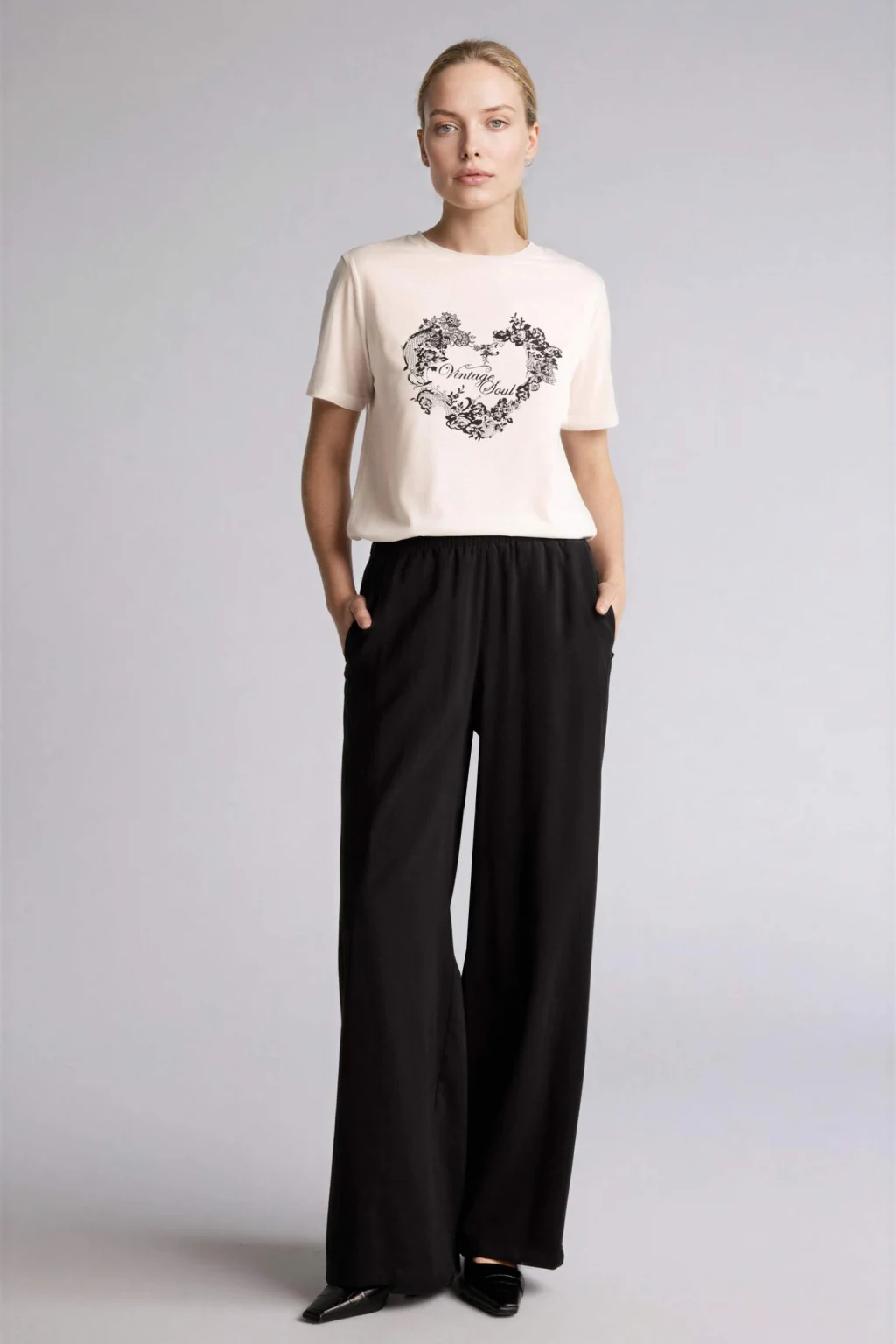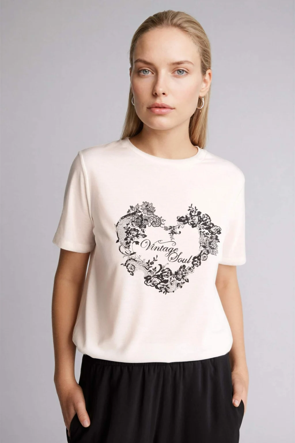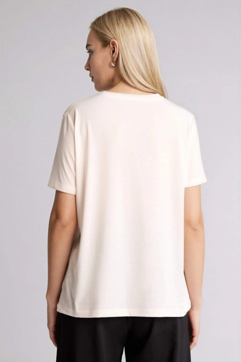Defacto H2355AXER105 Ekru İşlemeli Kısa Kollu Tişört