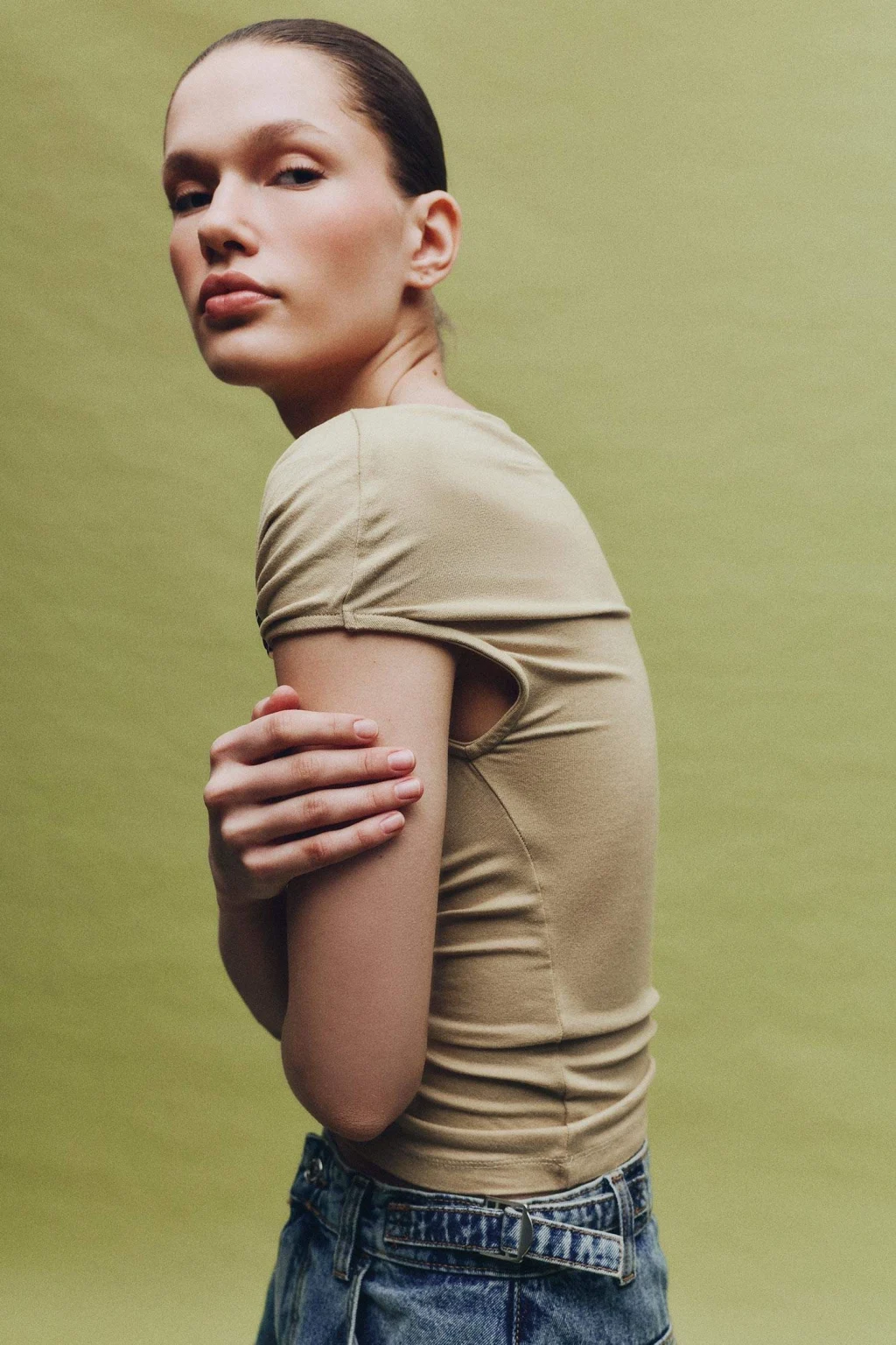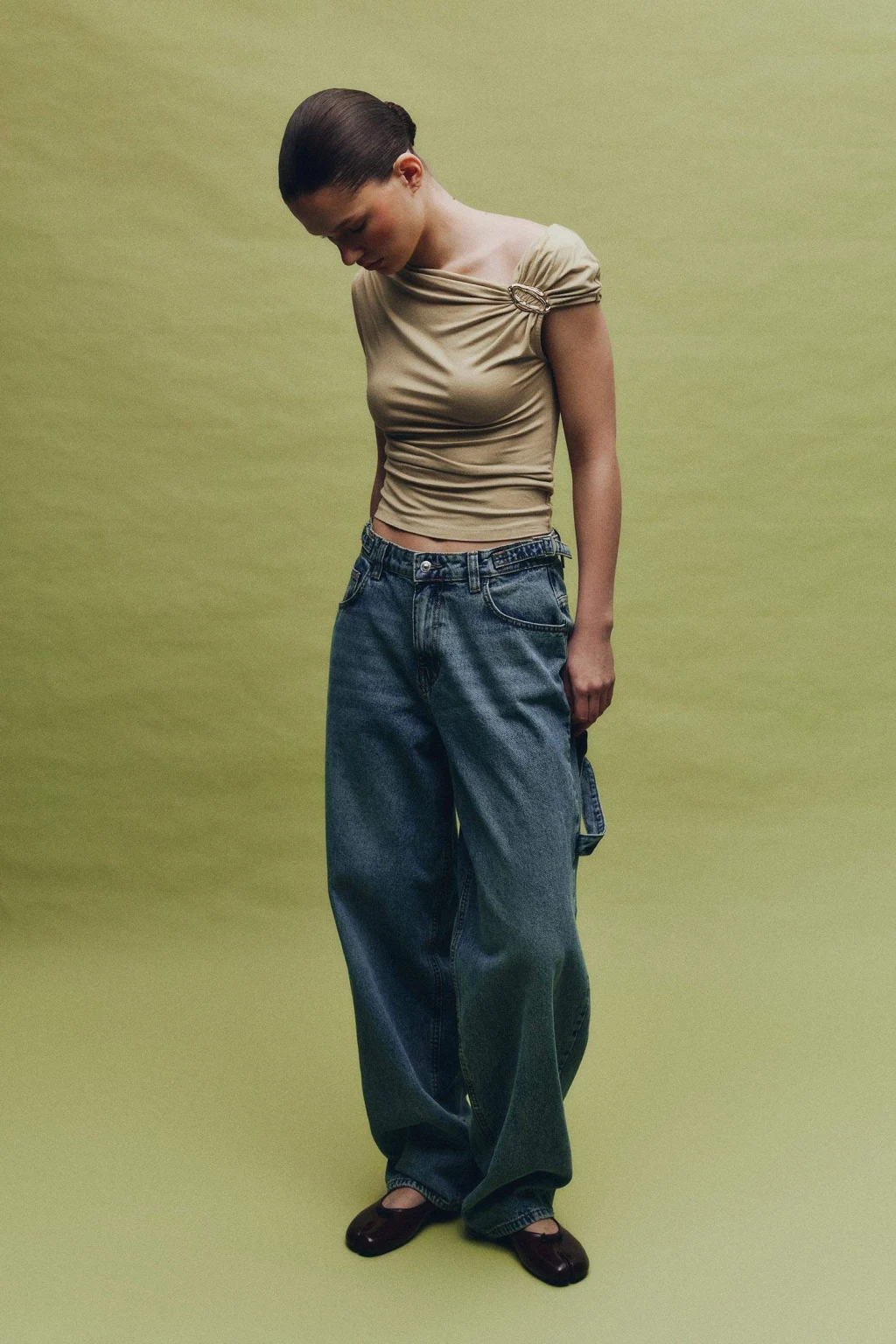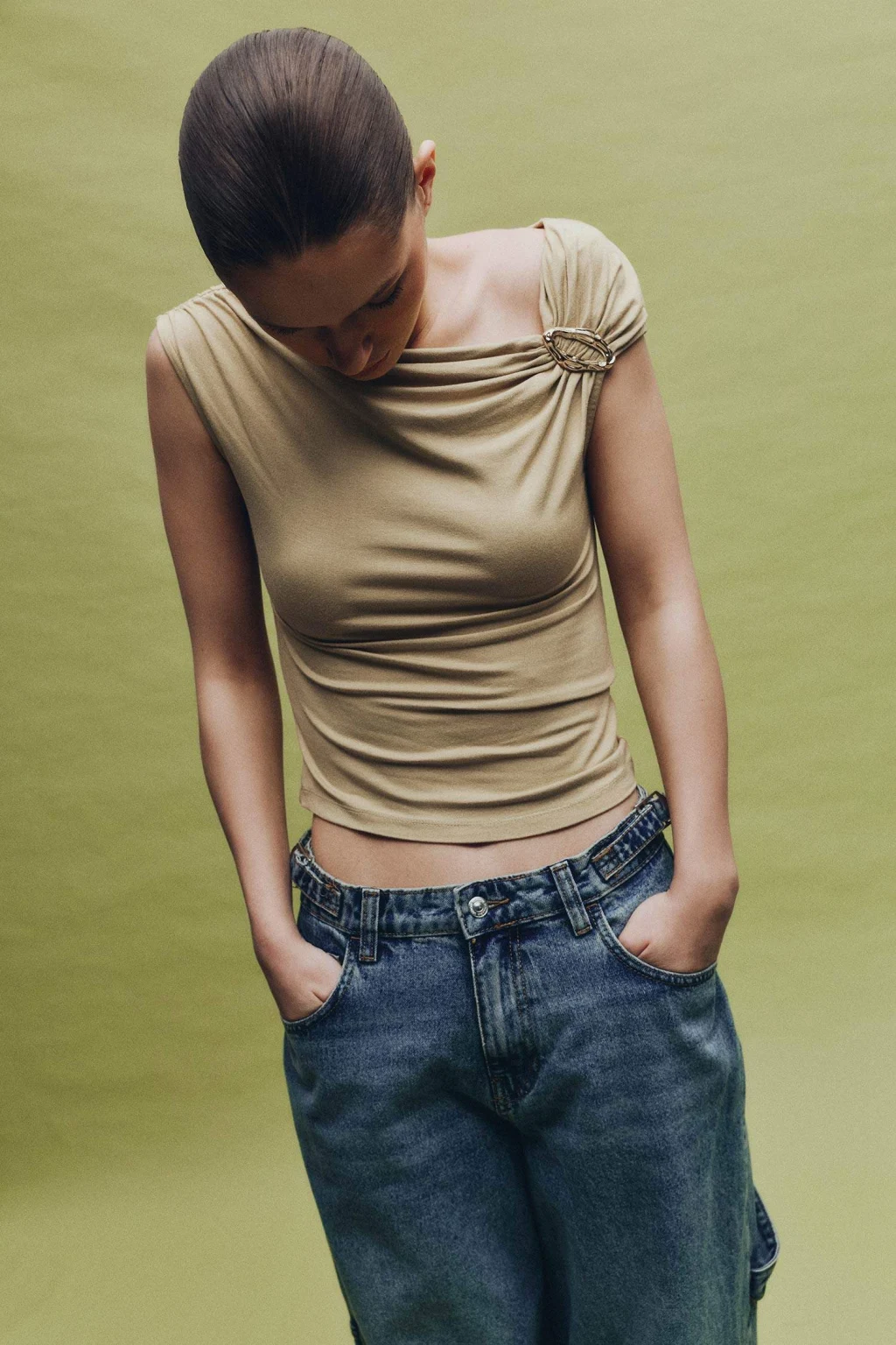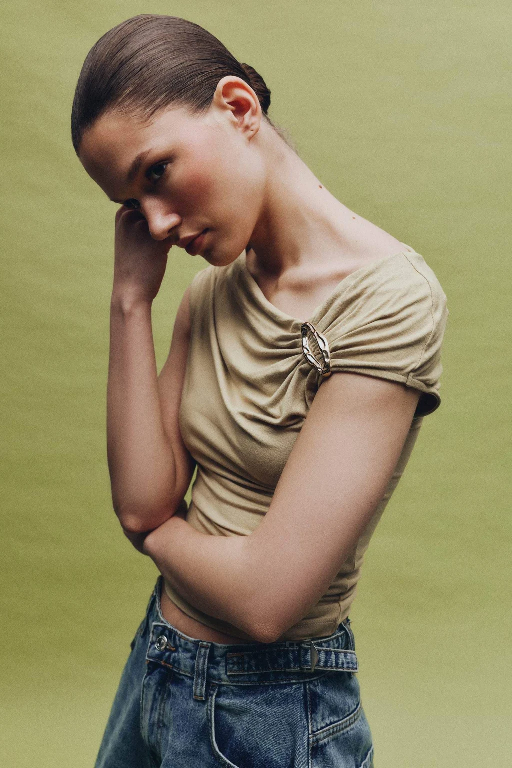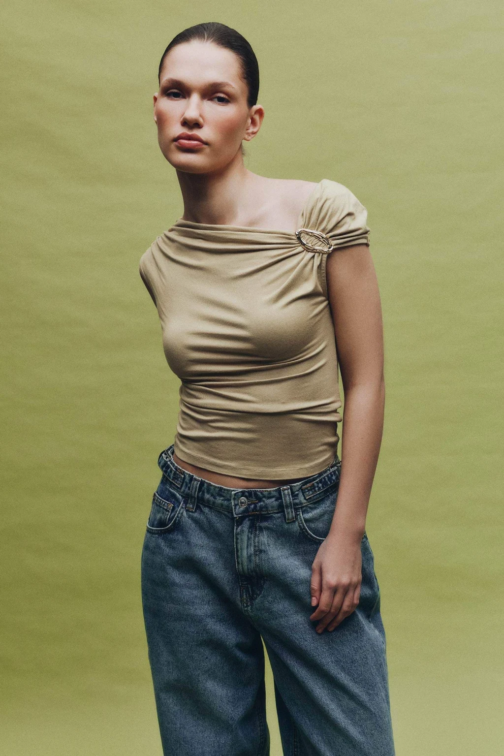 Slim Fit Kayık Yaka Toka Detaylı Tişört, vücuda oturan kesimi ve şık kayık yaka detayıyla zarif bir siluet sunar. Toka detayı, tasarıma modern ve dikkat çekici bir dokunuş katar.
