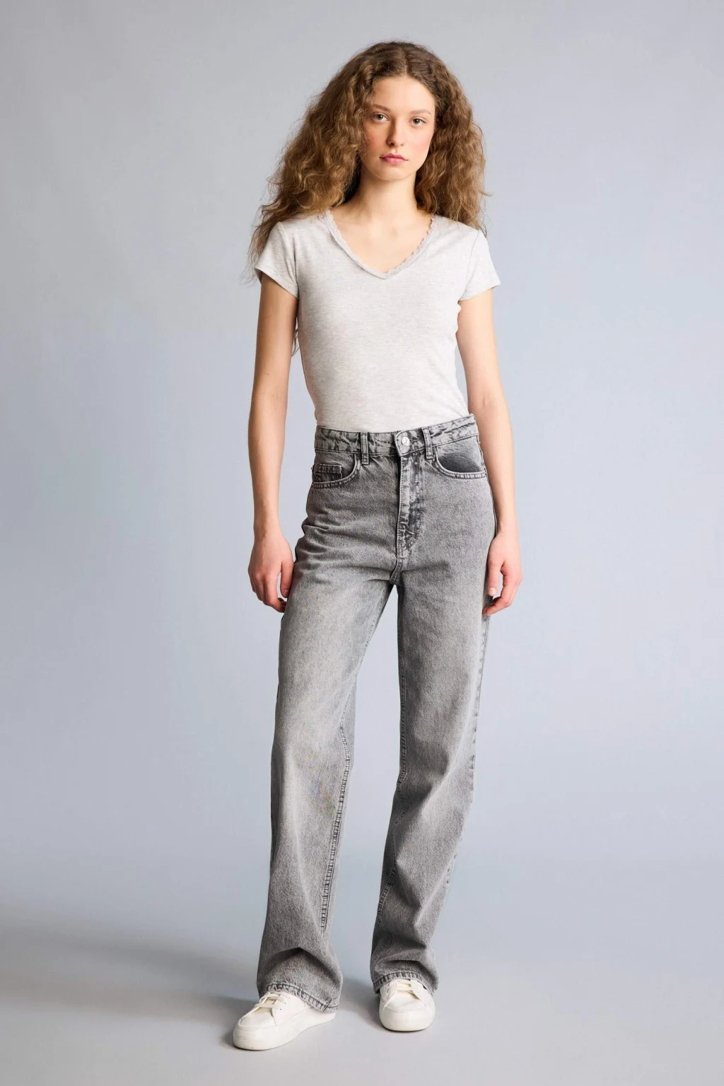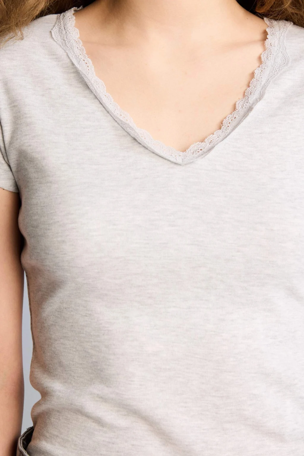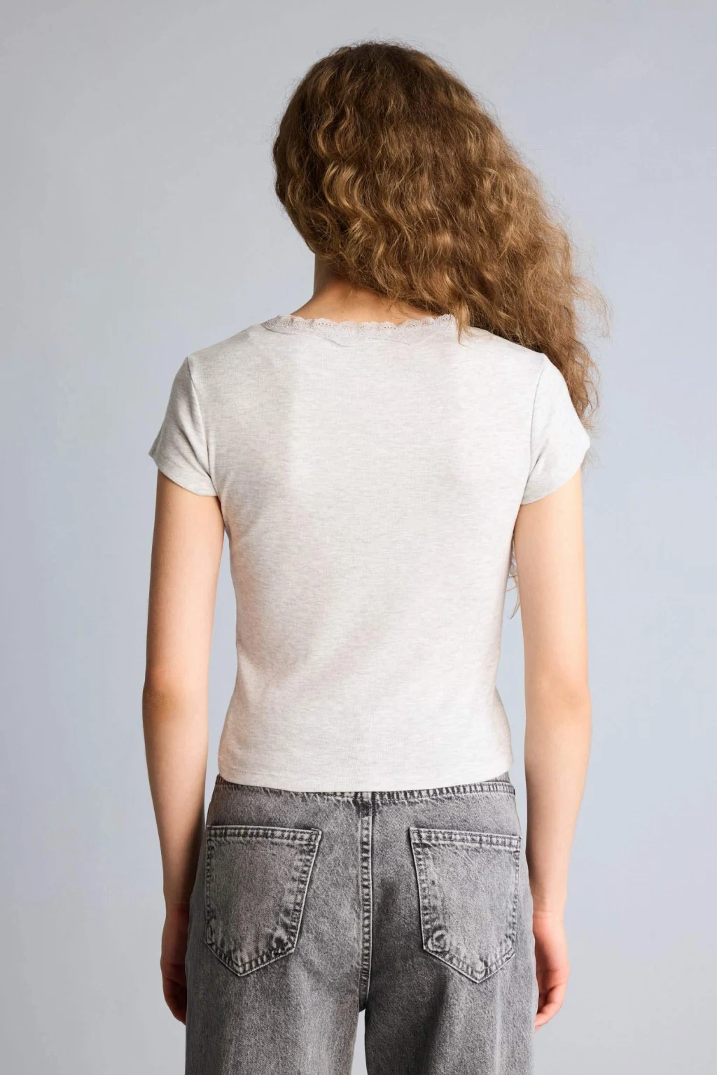 Defacto H1786AXGR256 Gri Fıtted Dantel Yaka Ribana Tişört