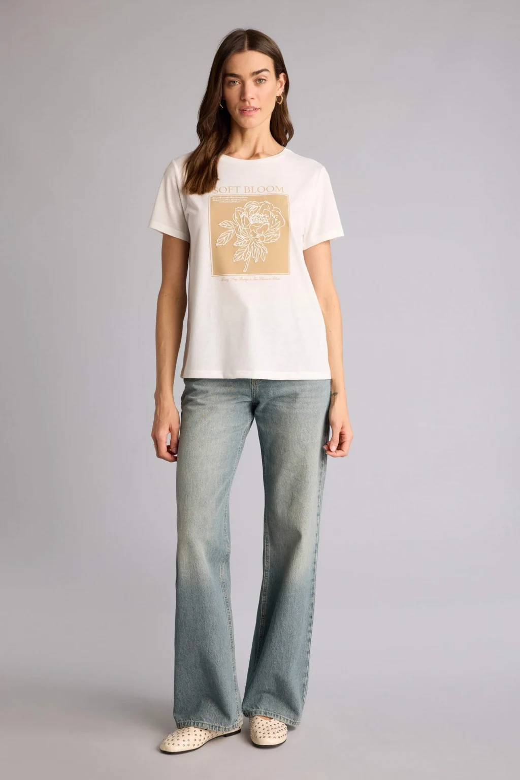 LCWAIKIKI Basic Bej Bisiklet Yaka Baskılı Kısa Kollu Kadın Tişört
