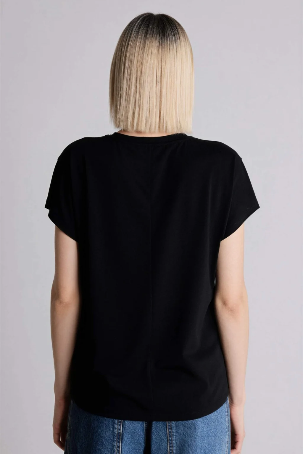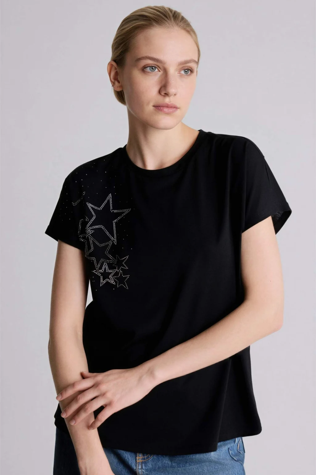 Yetişkin kadınlar için özel olarak tasarlanmış siyah taş baskılı kısa kollu tişört. İlkbahar ve yaz mevsimlerinde rahatlıkla kullanılabilir. Yarasa kol detayı ve bisiklet yaka ile tarzınızı tamamlayın. Örme giyim tarzını sevenler için ideal bir seçim.