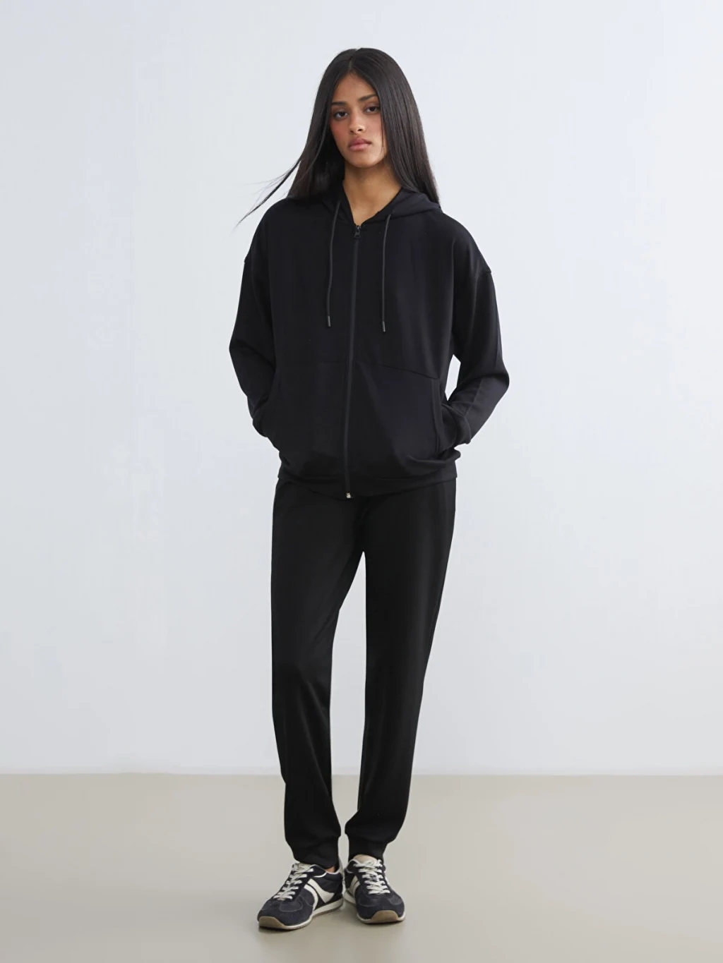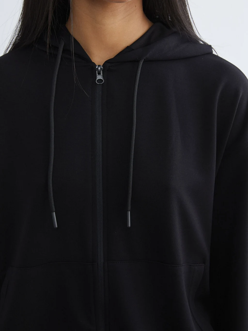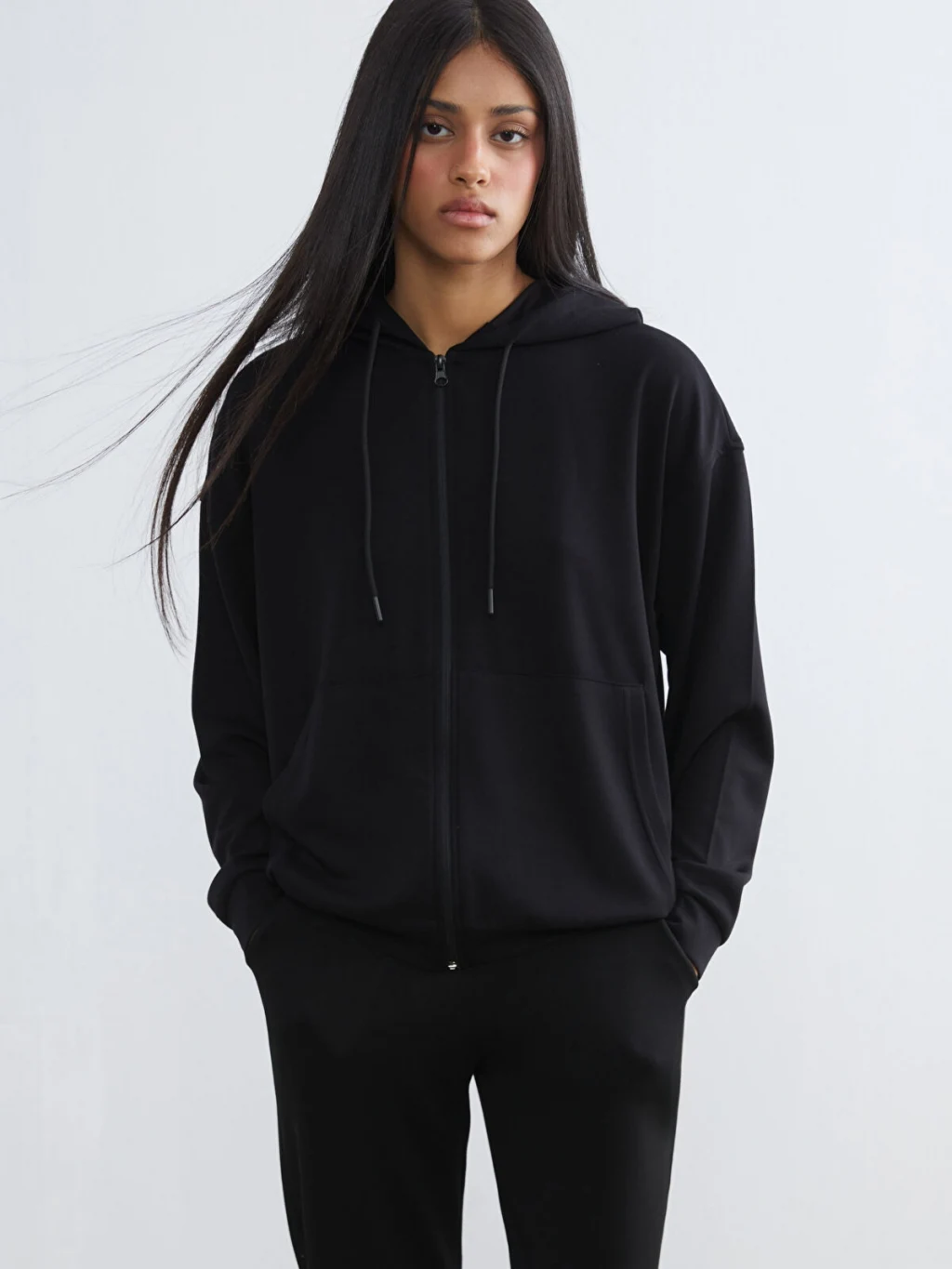 Lighttouch kumaşı hafif dokunuş hissi sunar. Bağcıklı kapüşonlu, uzun kollu kadın sweatshirt, önden fermuar kapamalıdır ve kanguru ceplidir.