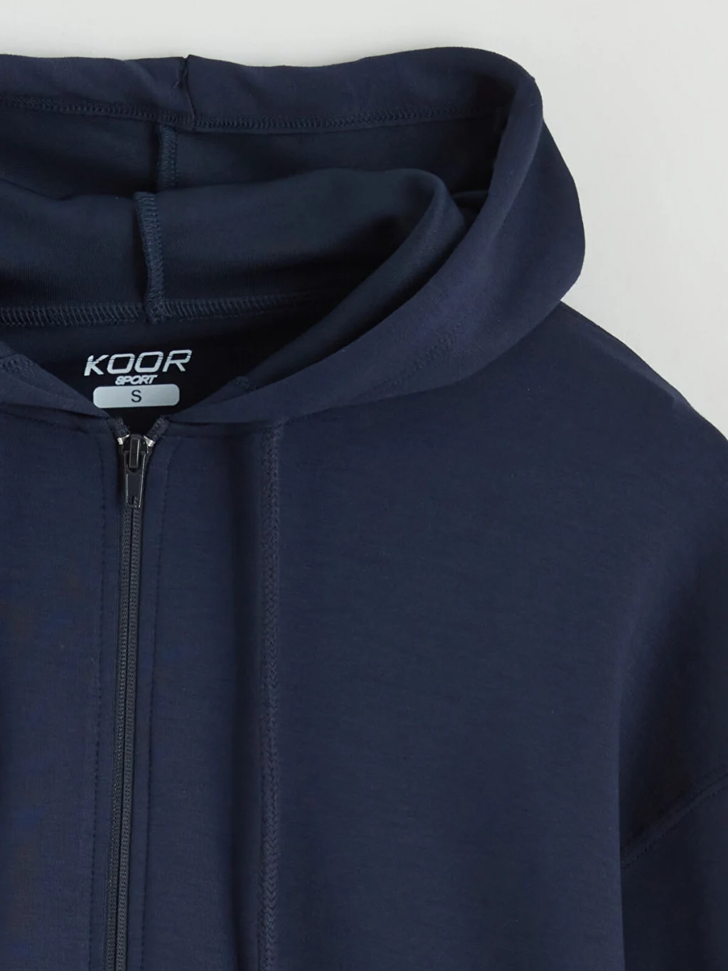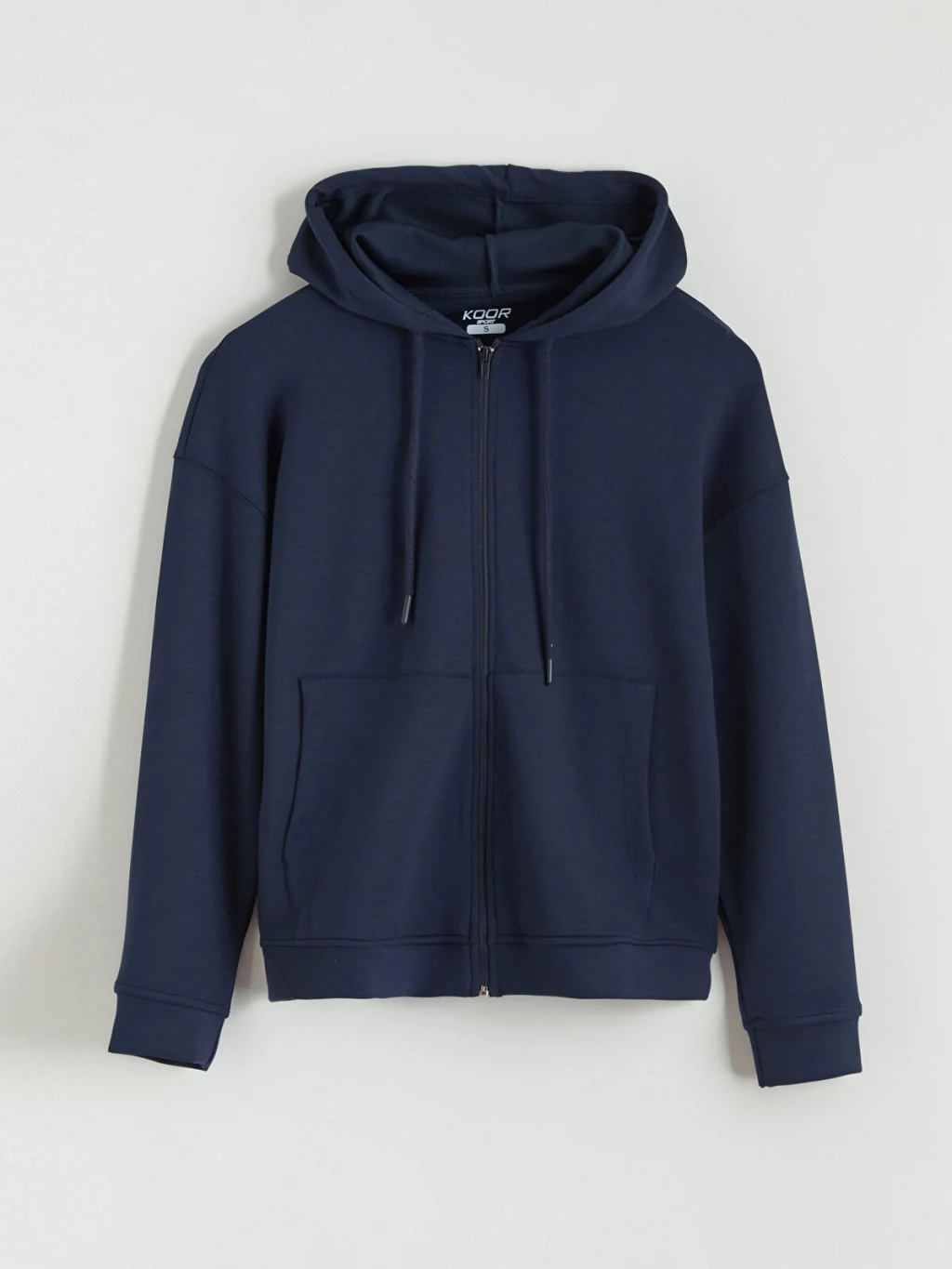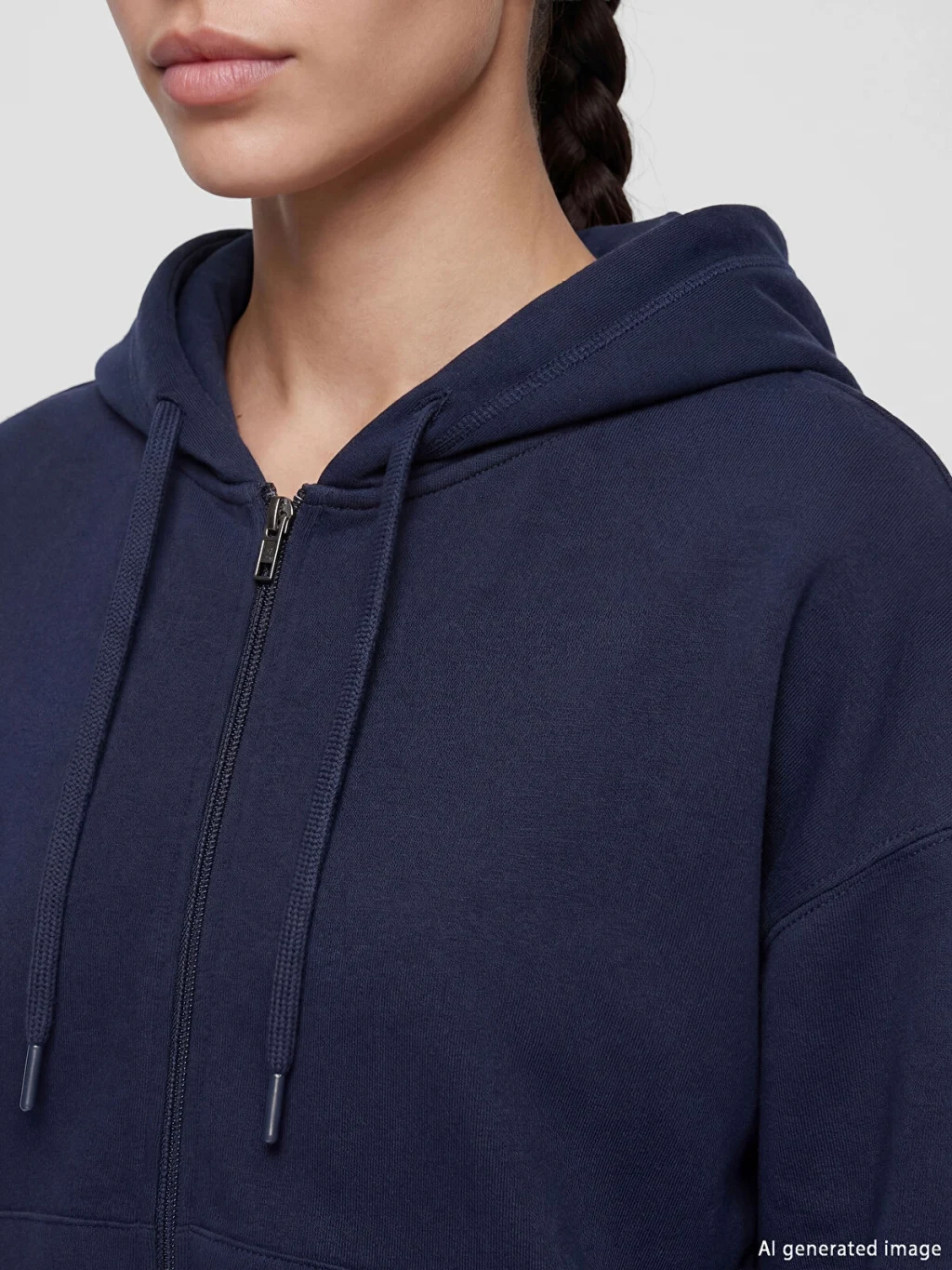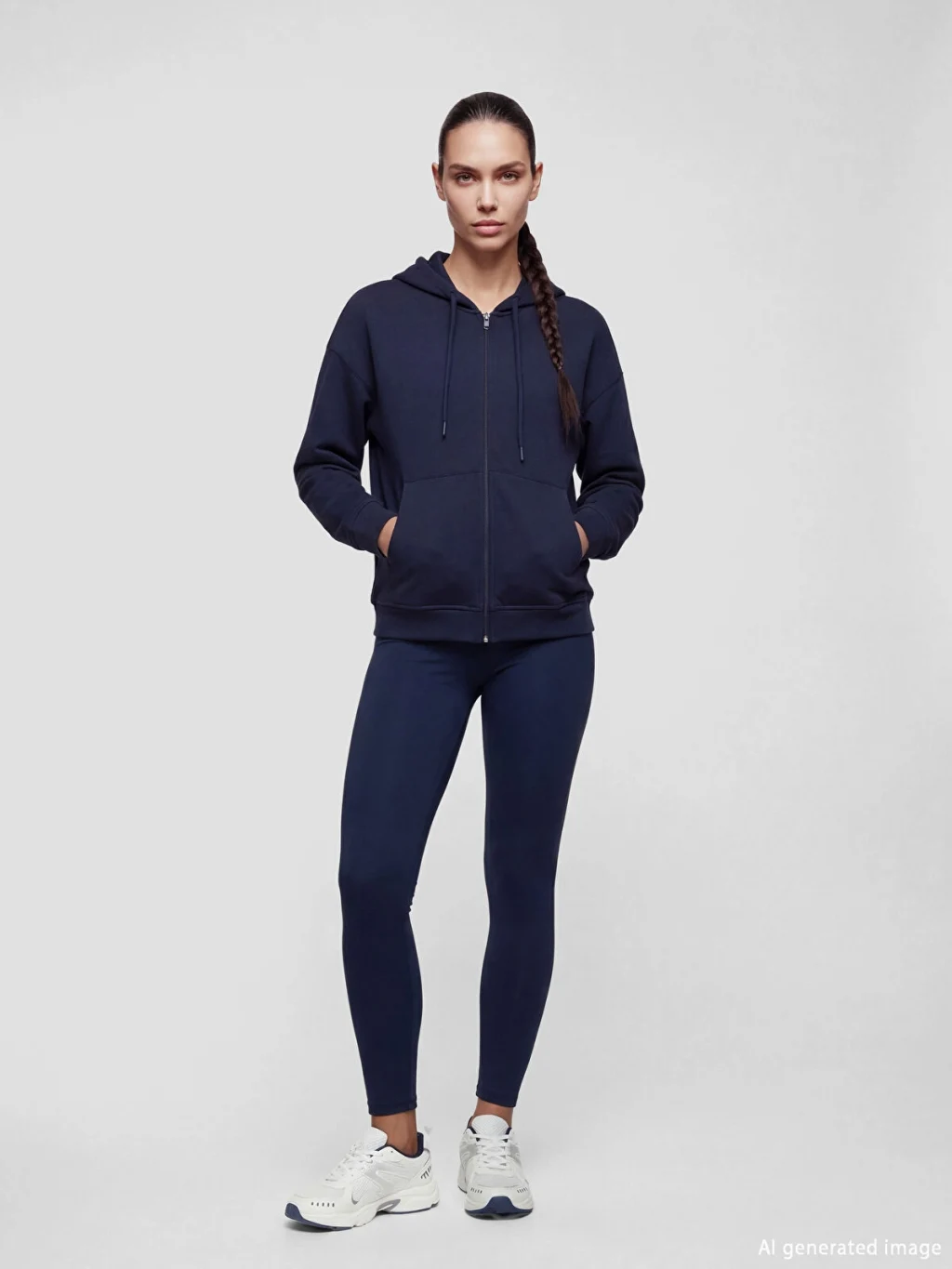 Bağcıklı kapüşonlu, uzun kollu kadın sweatshirt, önden fermuar kapamalıdır ve kanguru ceplidir.