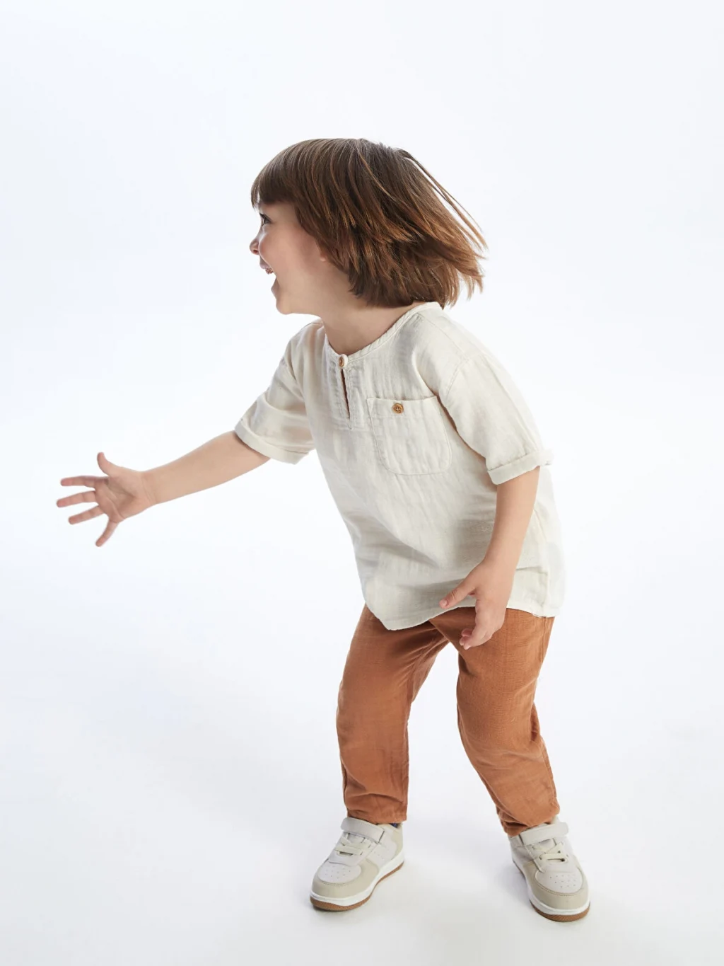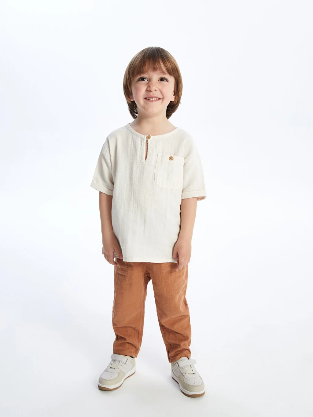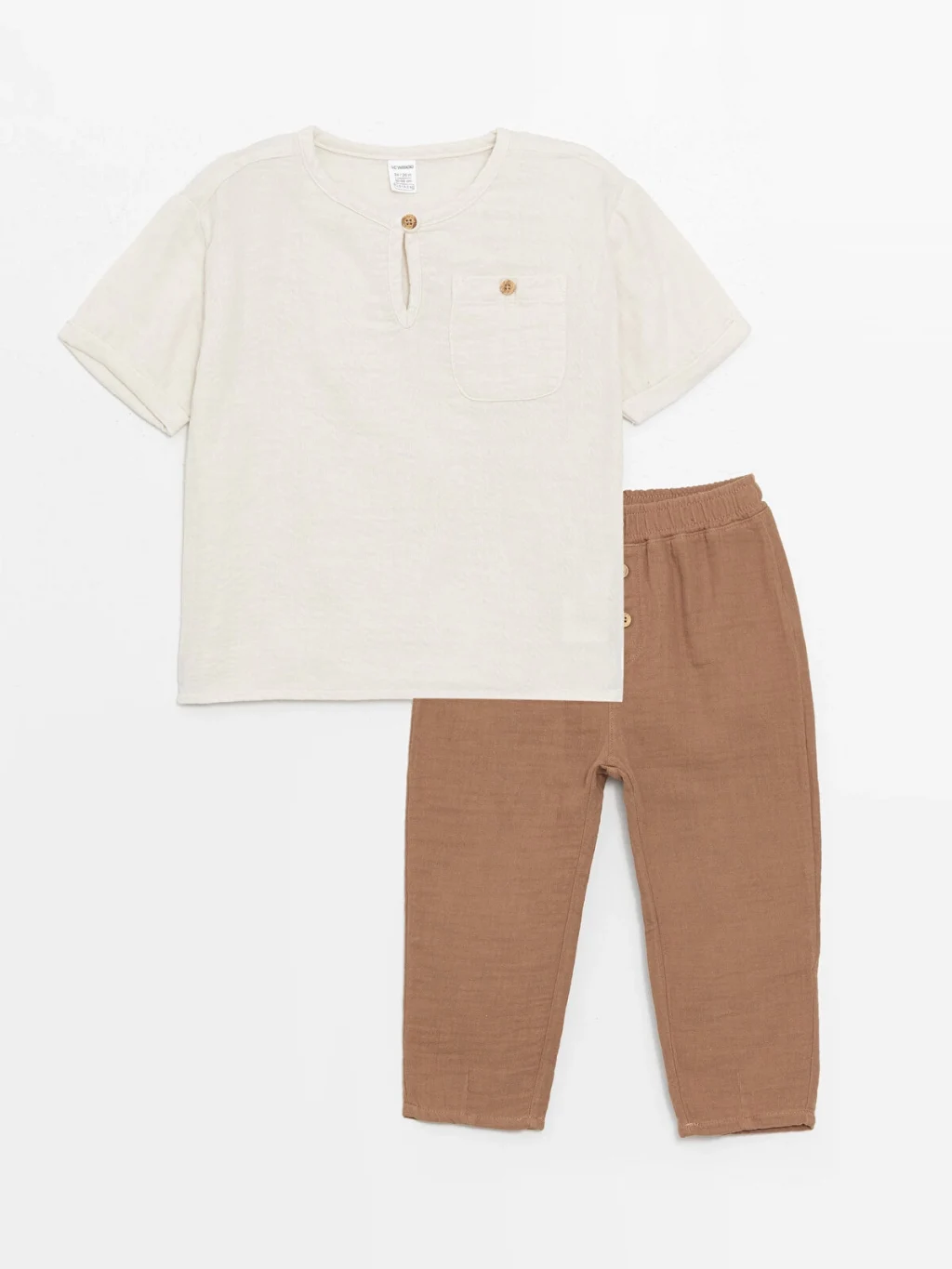 Bisiklet yaka kısa kollu basic erkek bebek tişört ve pantolon 2'li takım, %100 pamuklu müslin kumaştan üretilmiştir. Bebeğinizin rahatlığını ve konforunu ön planda tutar. Bebeğinizin günlük giyiminde mükemmel bir seçenektir.