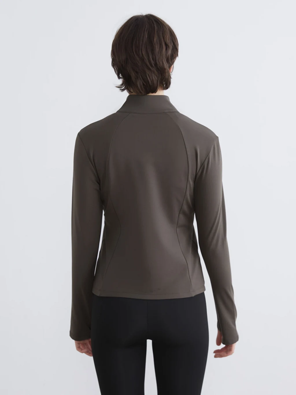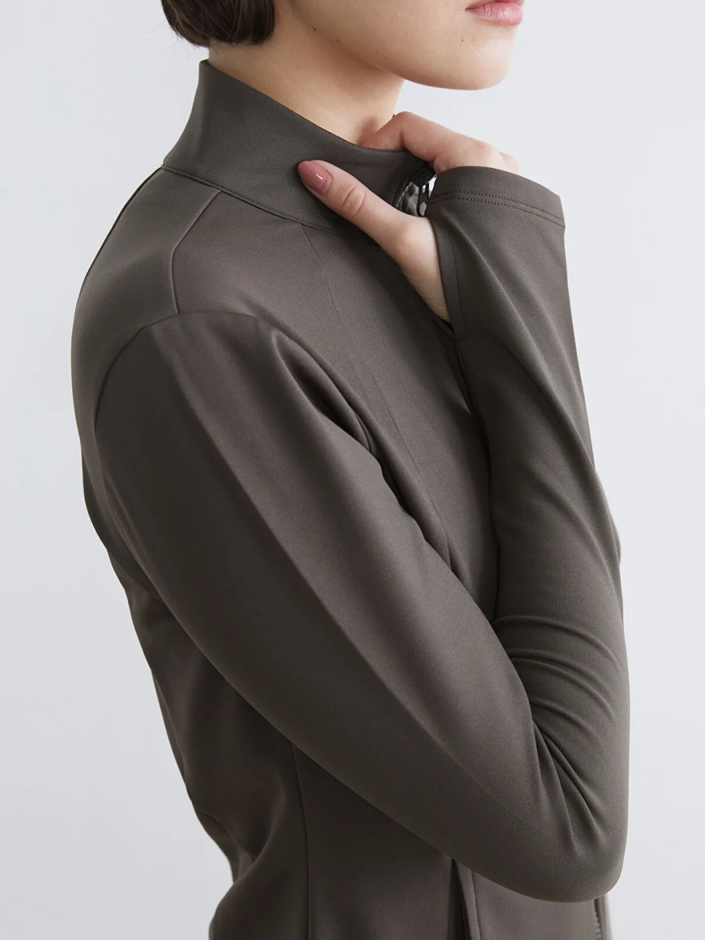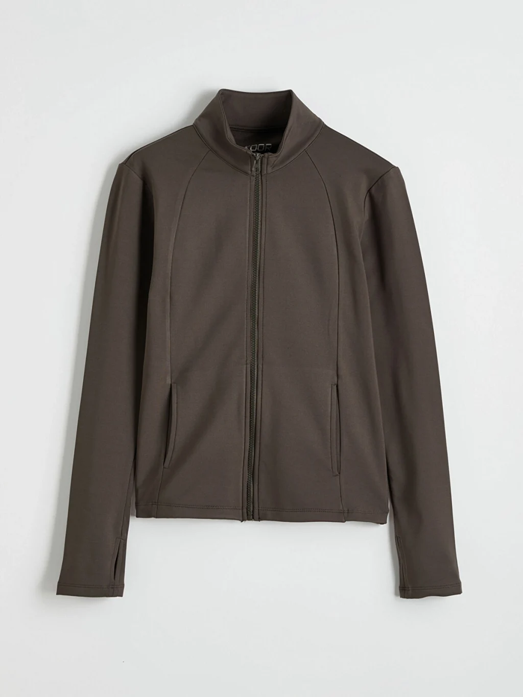 Dik yakalı, uzun kollu kadın sweatshirt, önden fermuar kapamalıdır. Yan cepleri bulunan sweatshirt, önü dikiş detaylıdır.