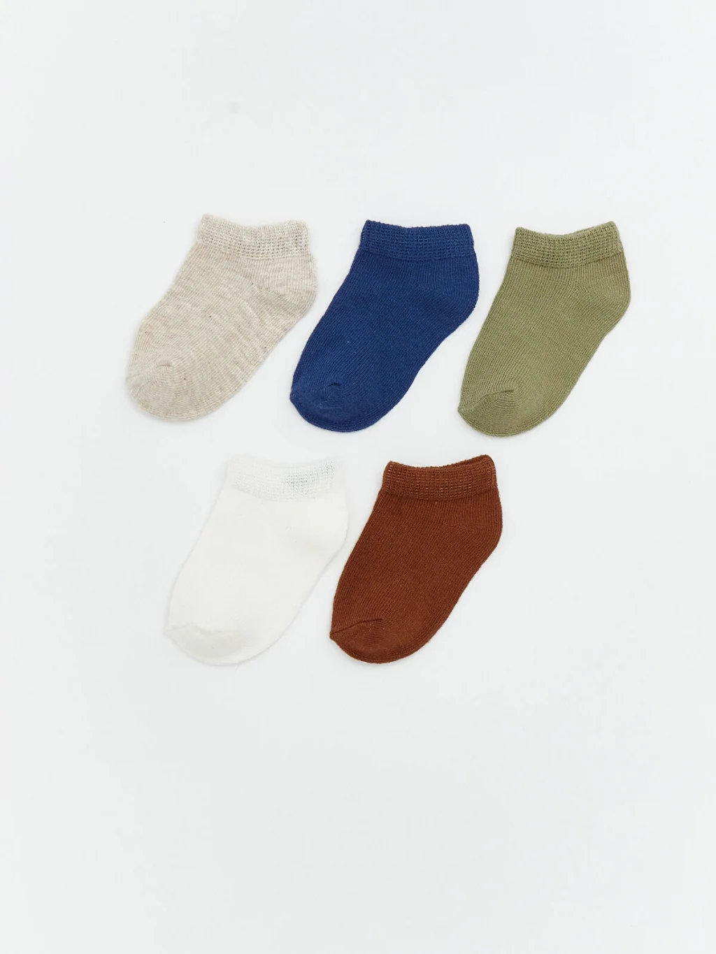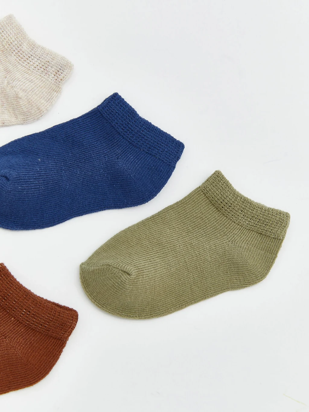 Beş çiftten oluşan erkek bebek patik çorap seti, desensiz tasarıma ve ribana detaylı bilek kısmına sahiptir.
