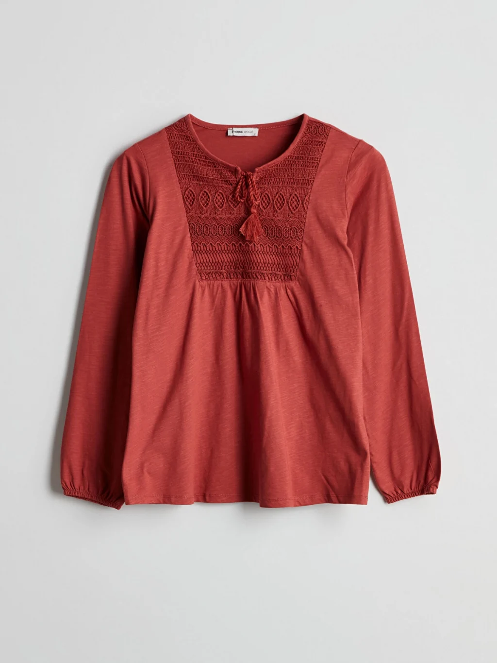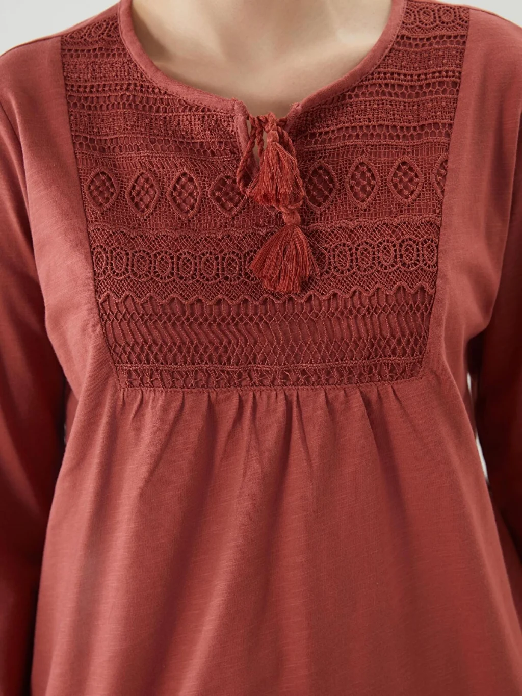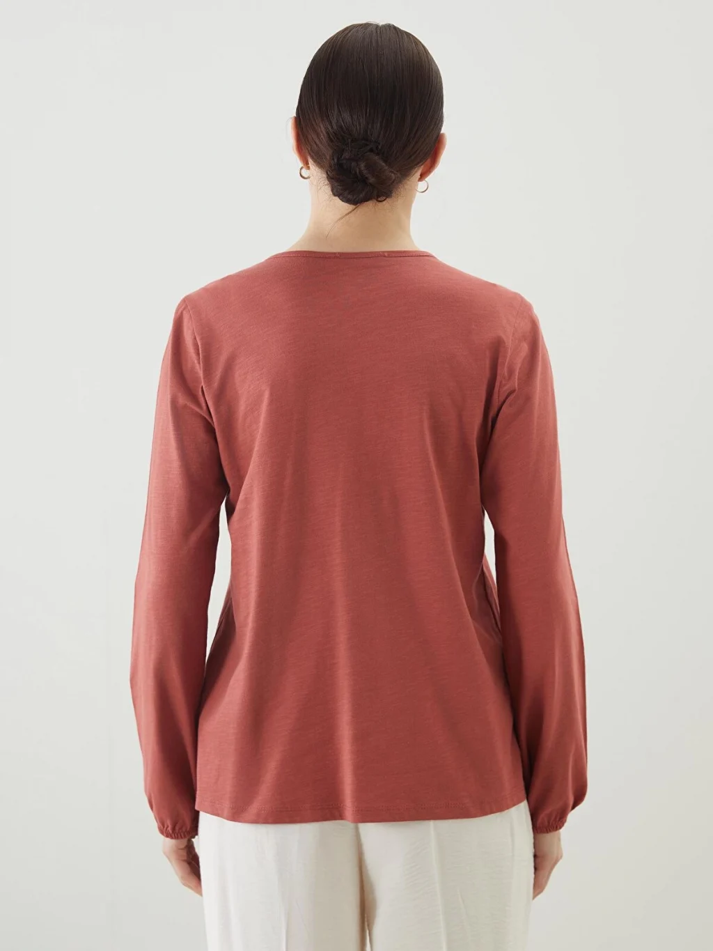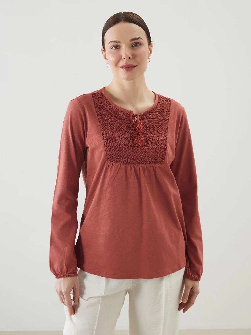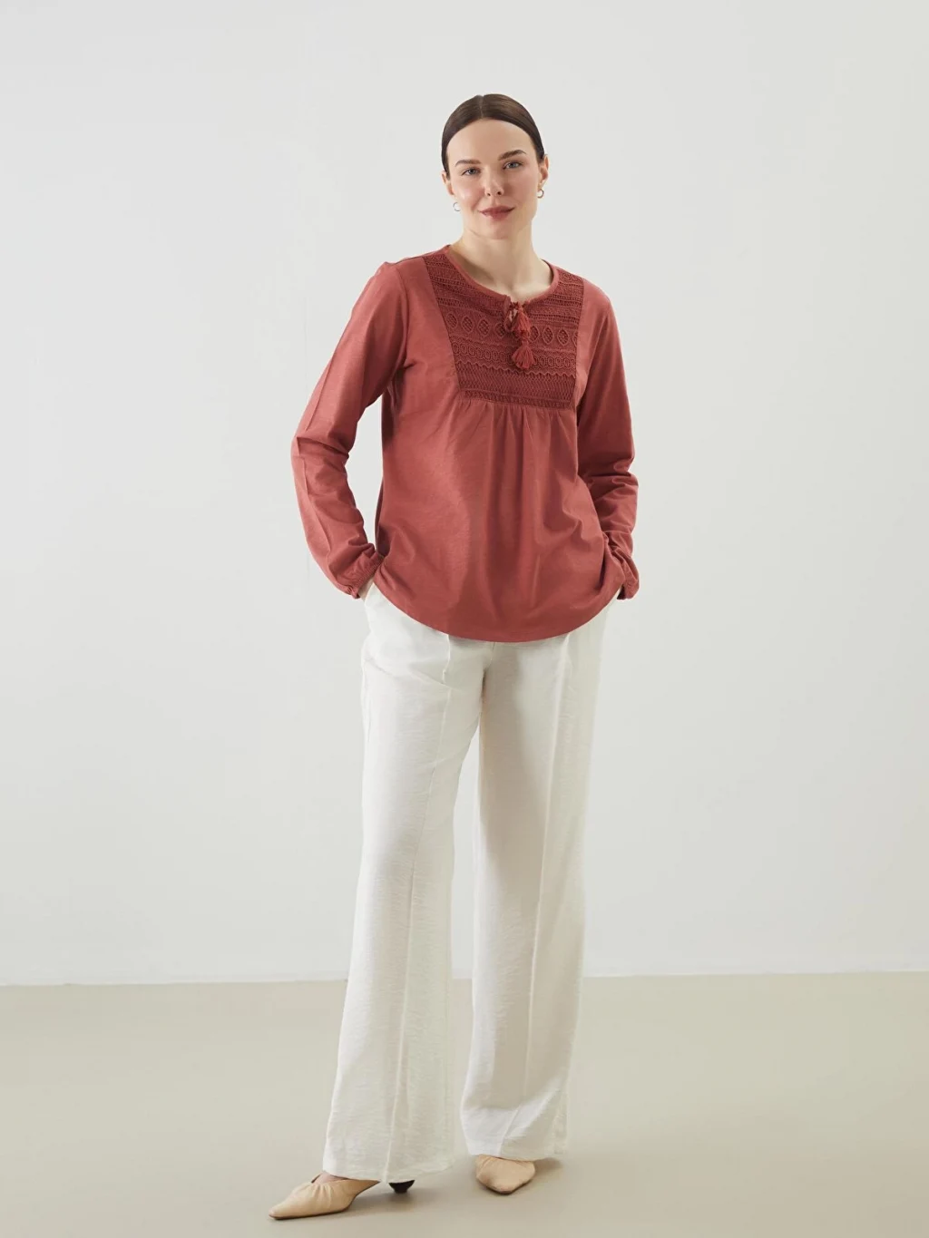 Bağlamalı yaka detaylı bluz süprem kumaştan üretilmiştir. Bileklerinde bulunan lastikler bileğinizi kavrayarak hareket özgürlüğü sağlarken üzerindeki nakışlar bluza zarif ve dikkat çekici bir dokunuş katar.