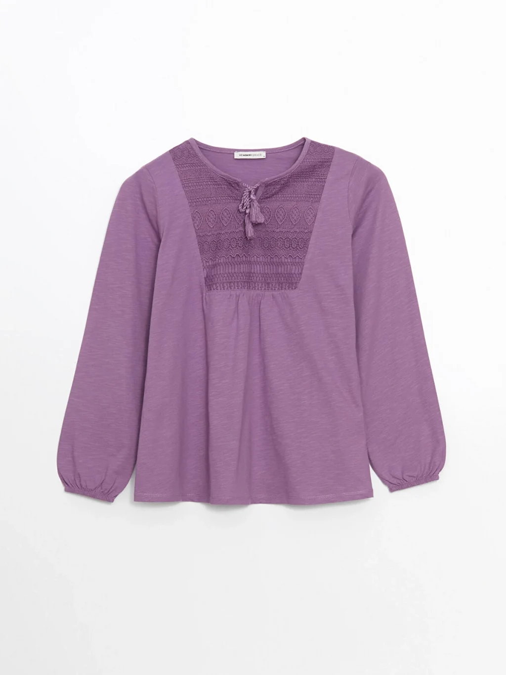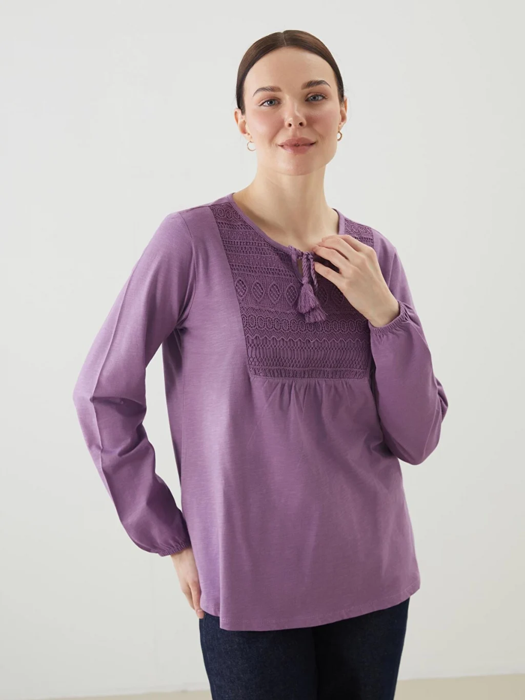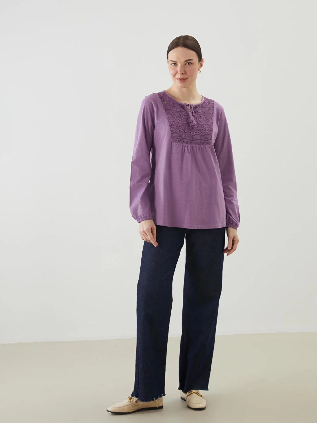 Bağlamalı yaka detaylı bluz süprem kumaştan üretilmiştir. Bileklerinde bulunan lastikler bileğinizi kavrayarak hareket özgürlüğü sağlarken üzerindeki nakışlar bluza zarif ve dikkat çekici bir dokunuş katar.