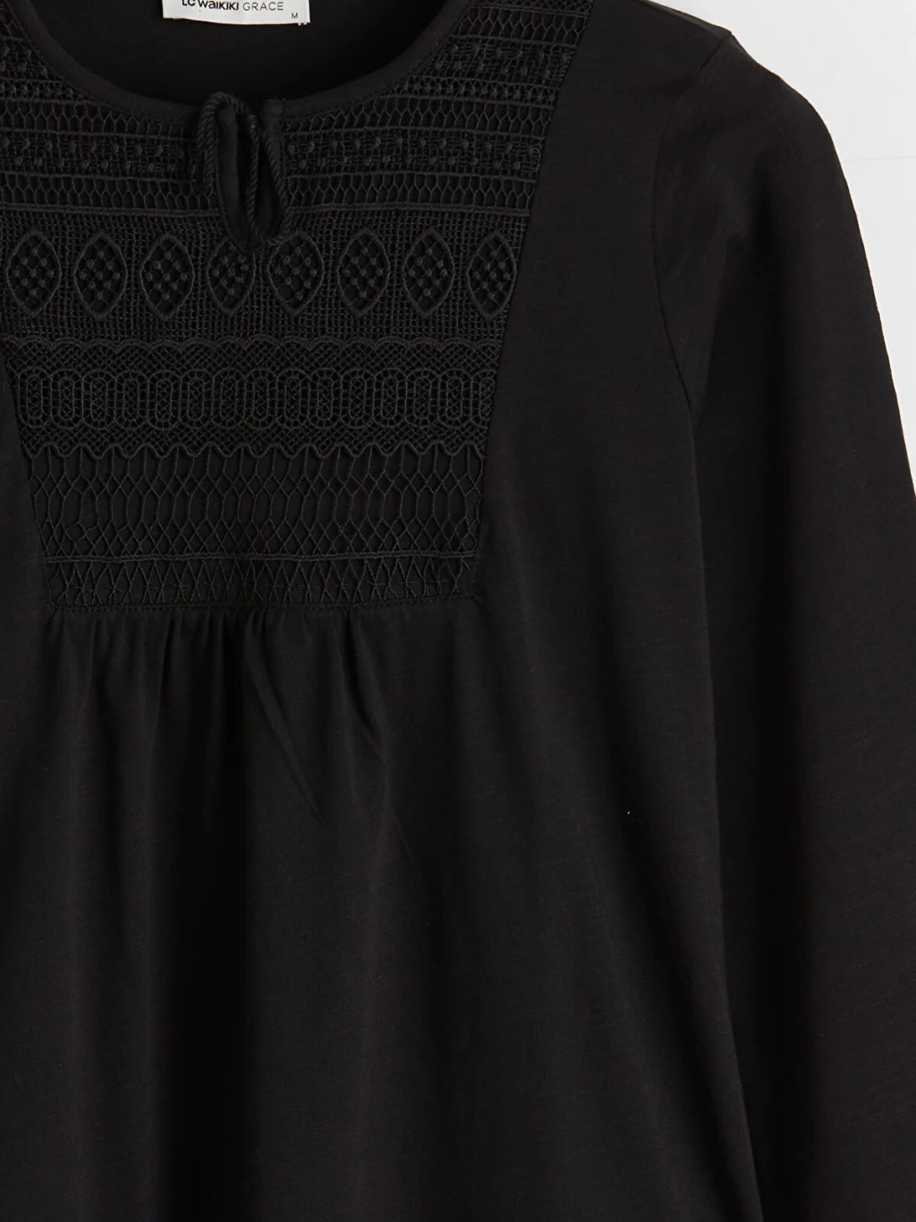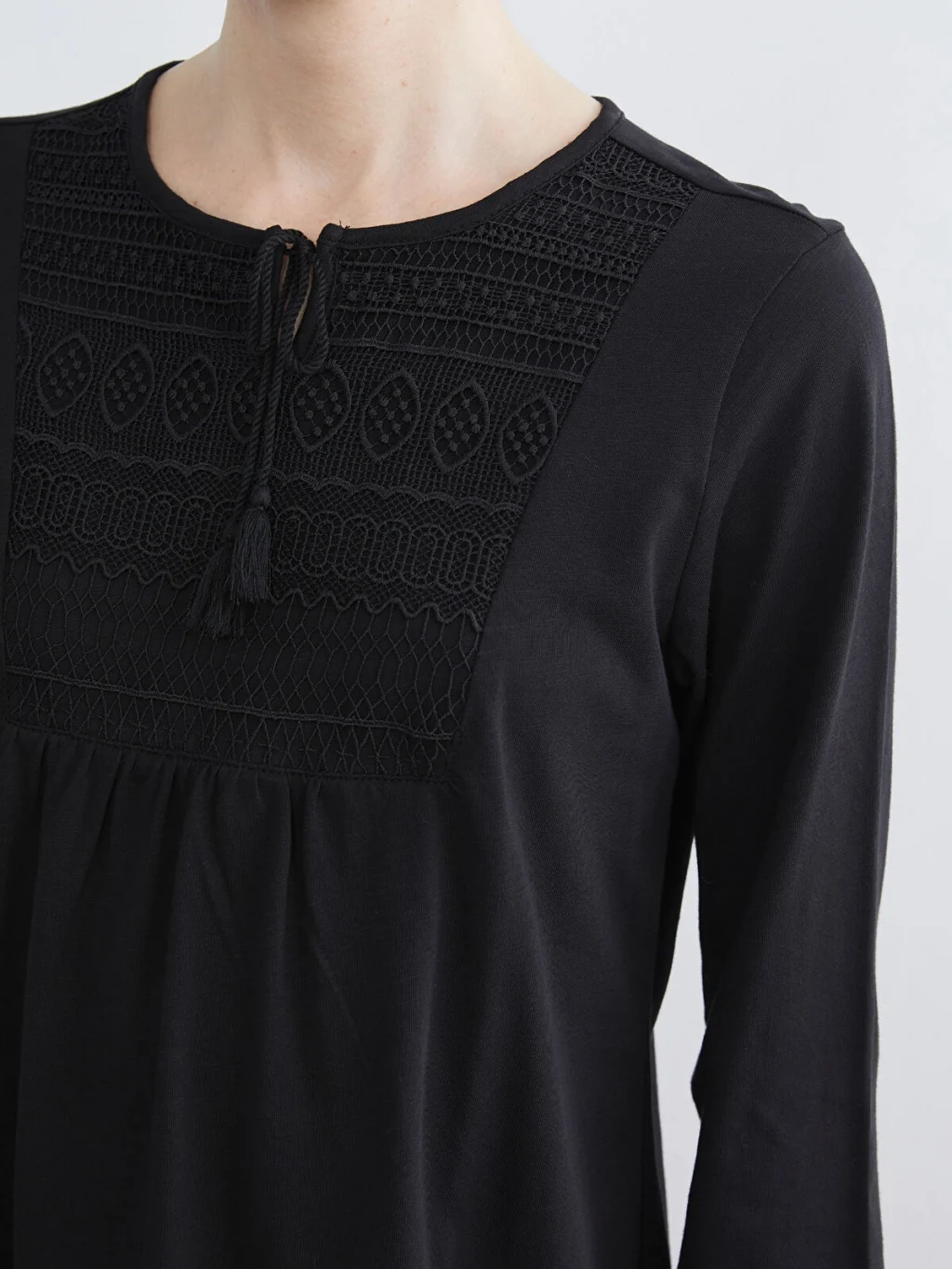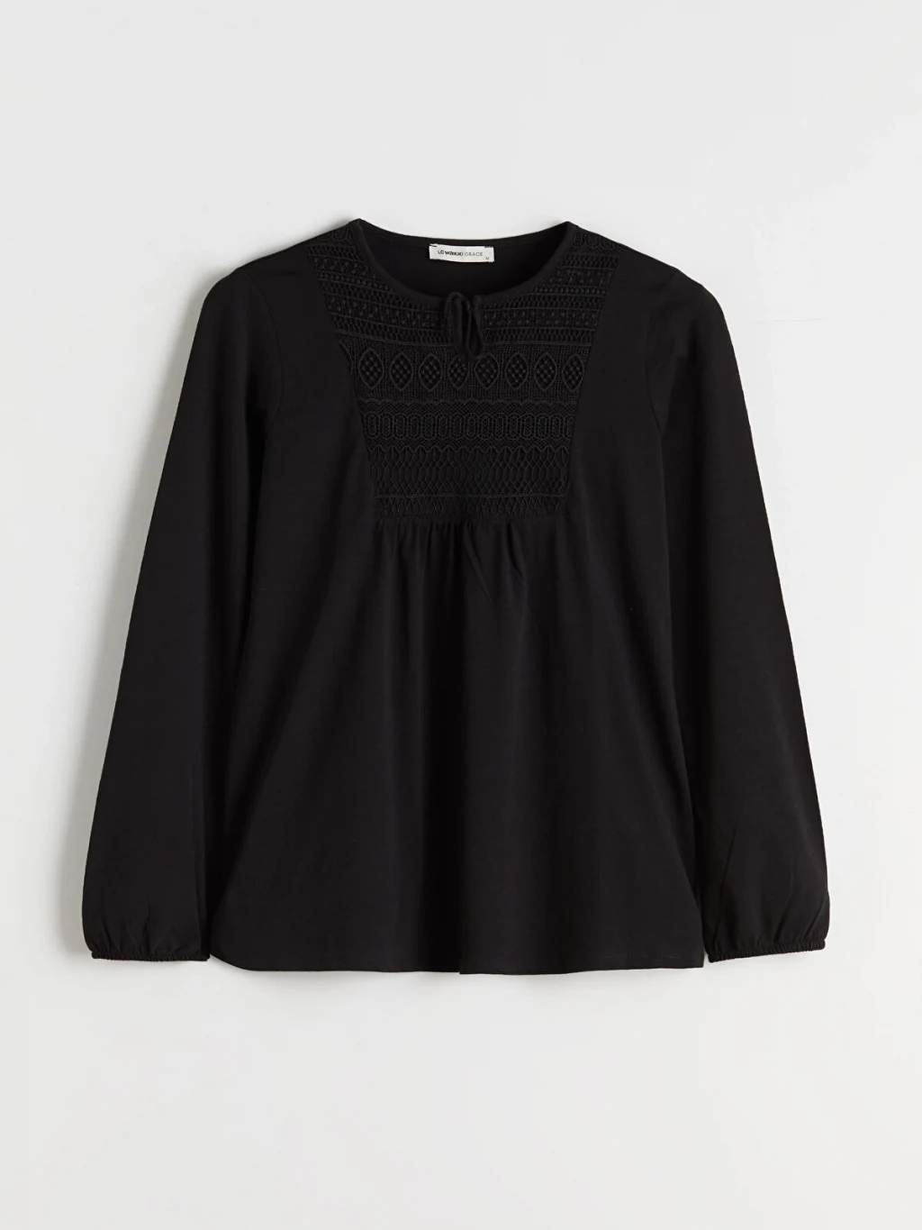 Bağlamalı yakalı ve yaka ucu bağcıklı kadın bluz, uzun kolludur. Göğüs kısmı işlemeli ve büzgülü olup kol uçları lastiklidir.