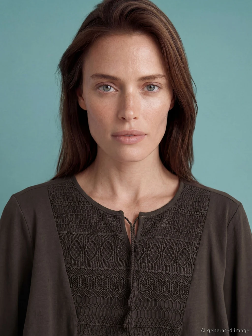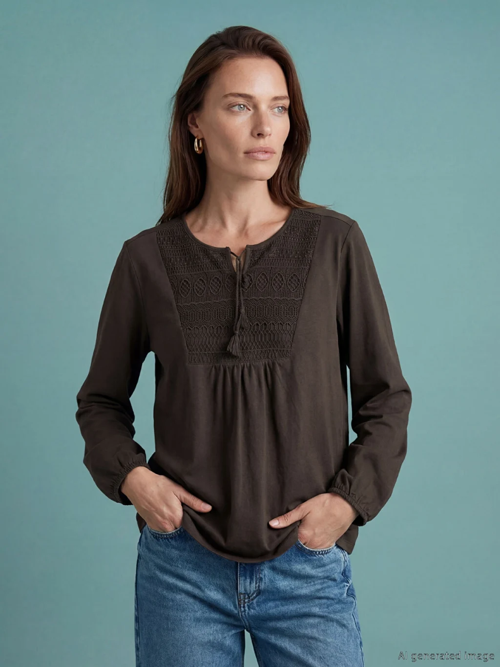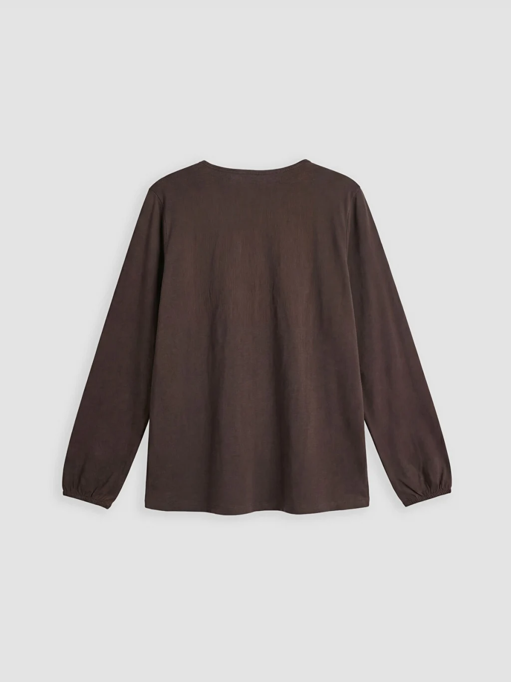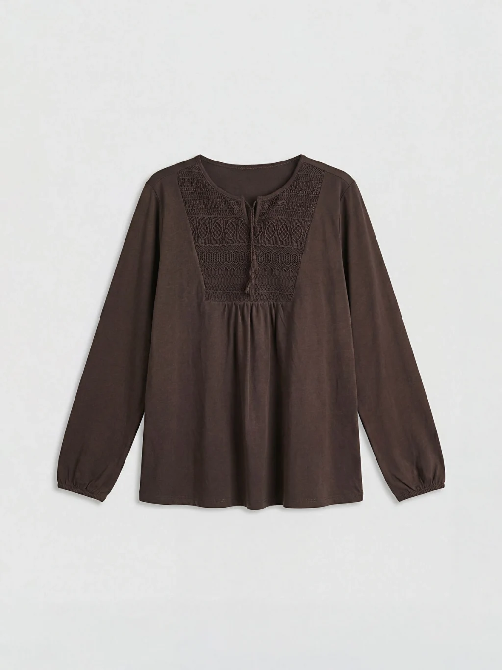 Yaka ucu bağlamalı, uzun kollu kadın bluz, %100 pamuklu penye kumaştan üretilmiştir. Göğüs kısmında nakış ve büzgü detayı bulunur.