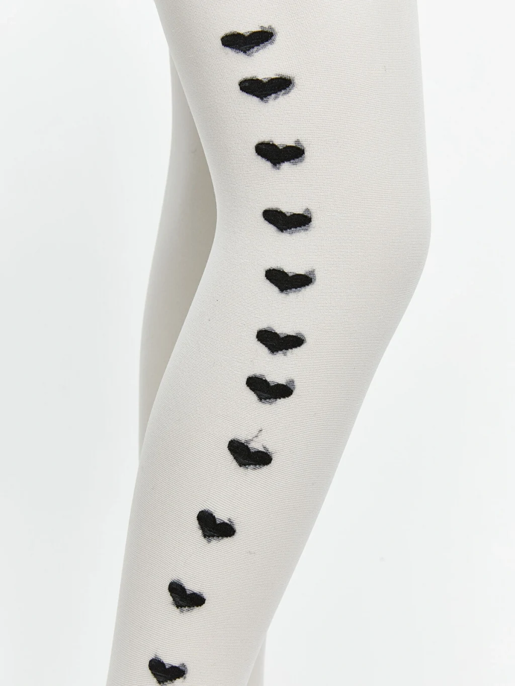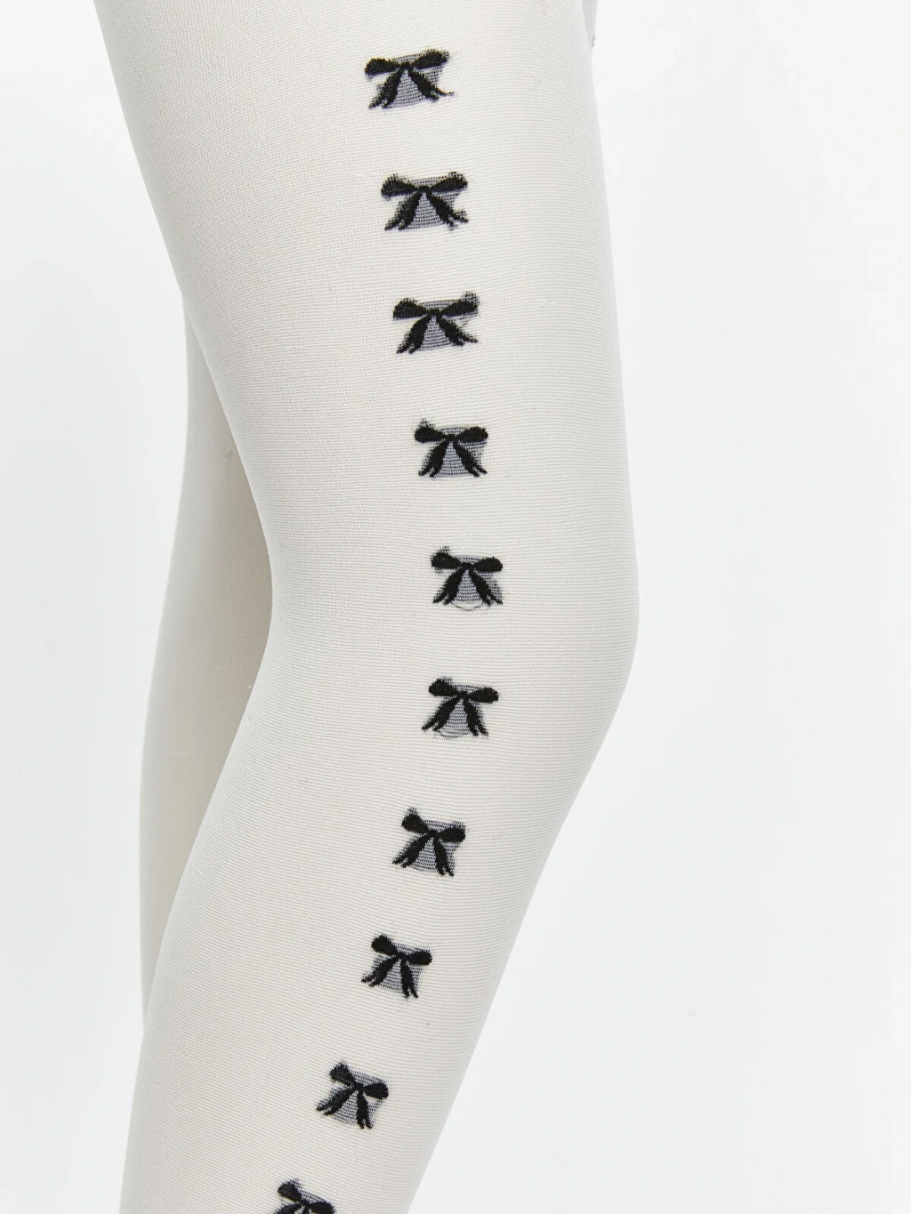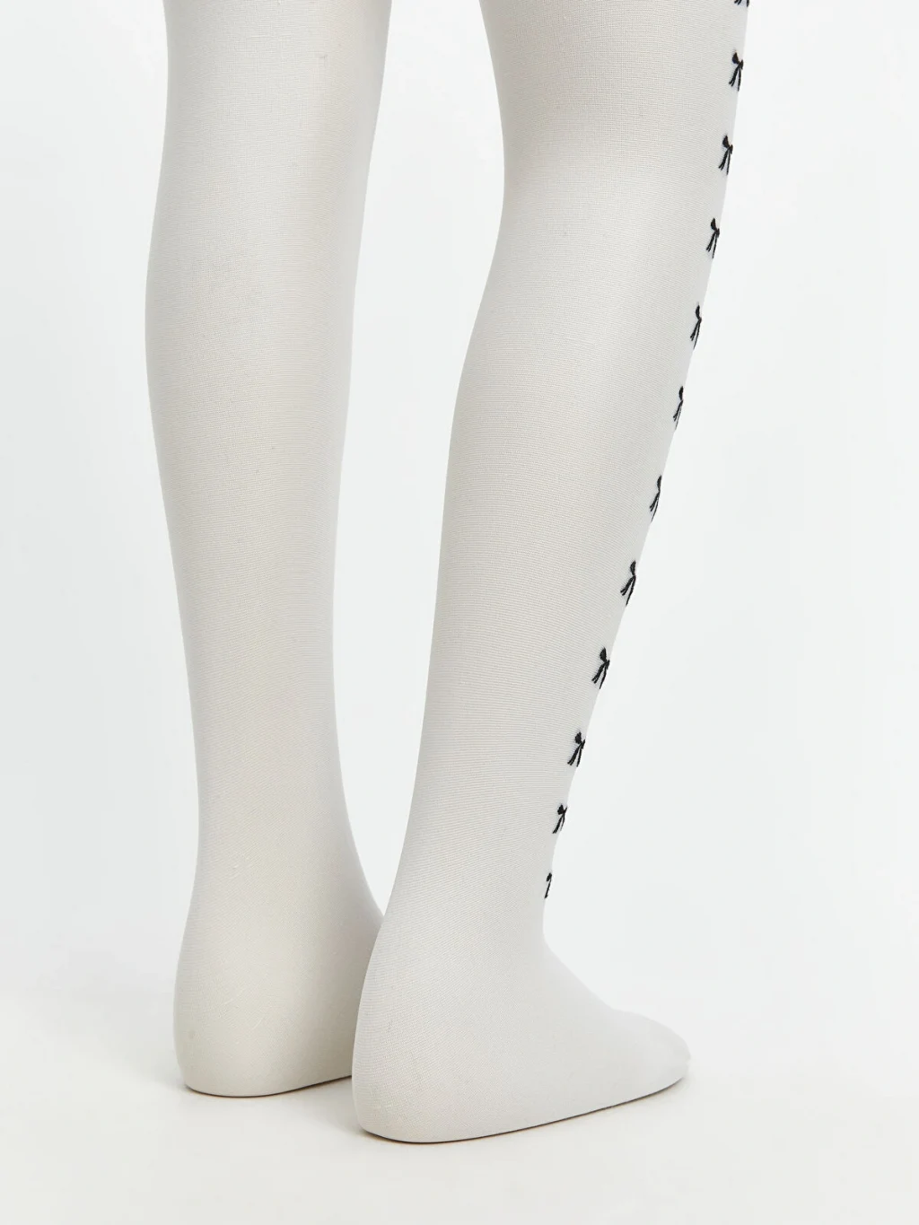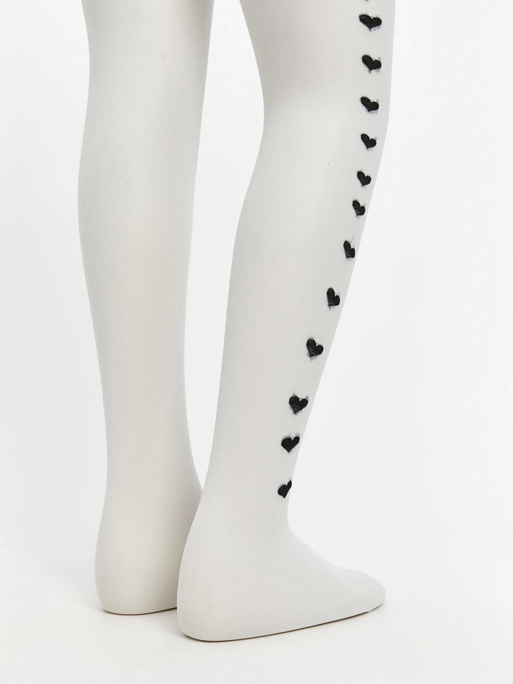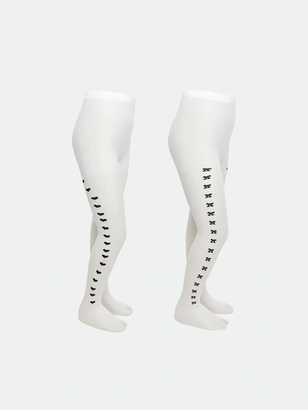 İkili paket olarak sunulan kız çocuk külotlu çorap; bir çifti yanları kalp desenli, diğer çifti yanları fiyonk desenlidir.