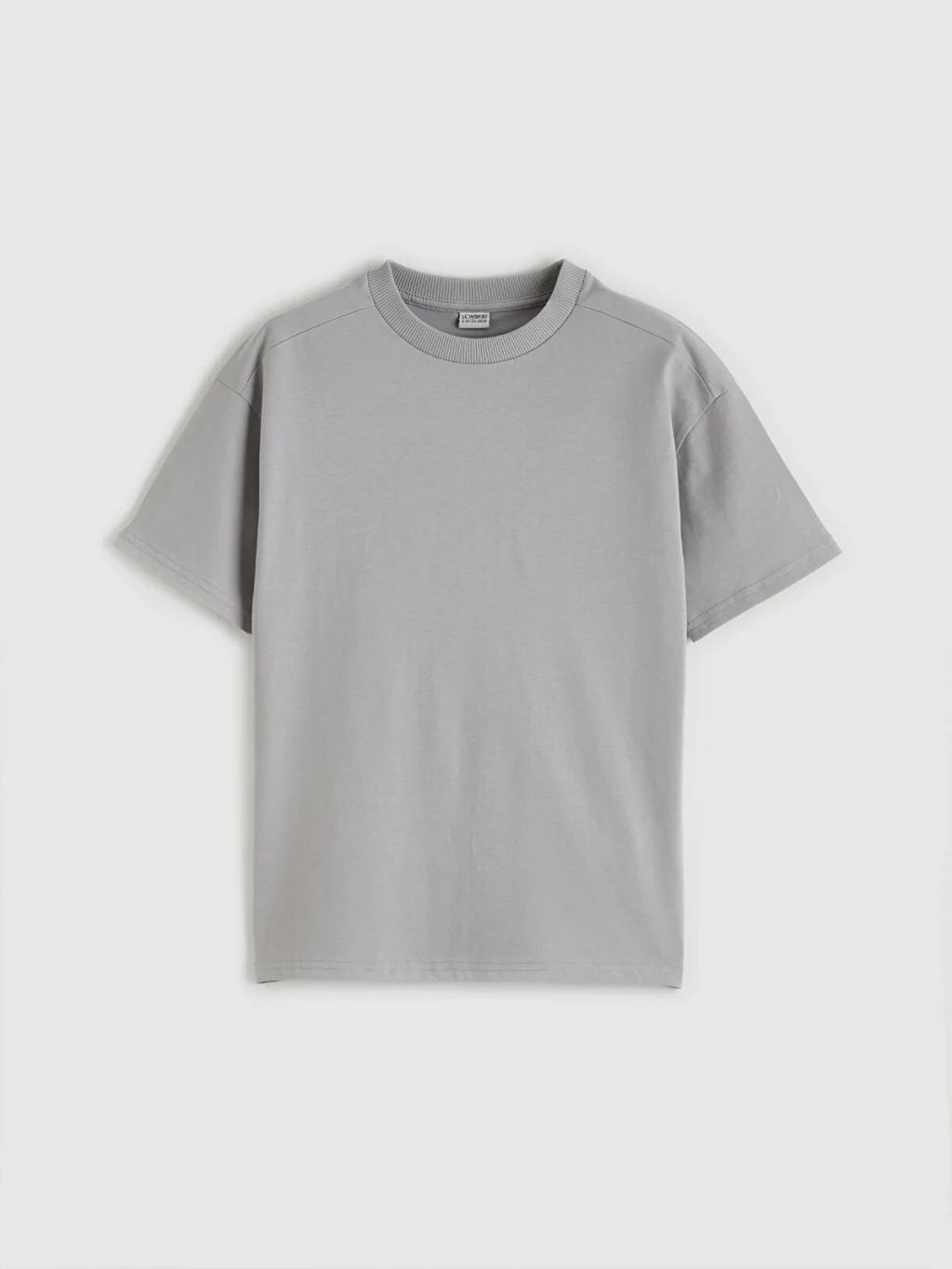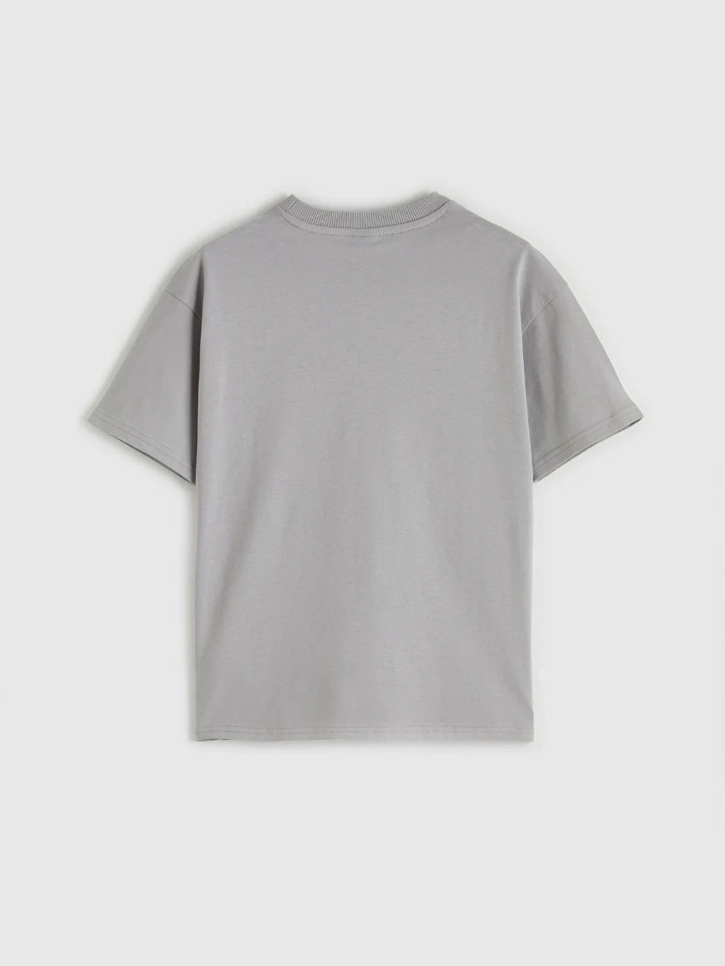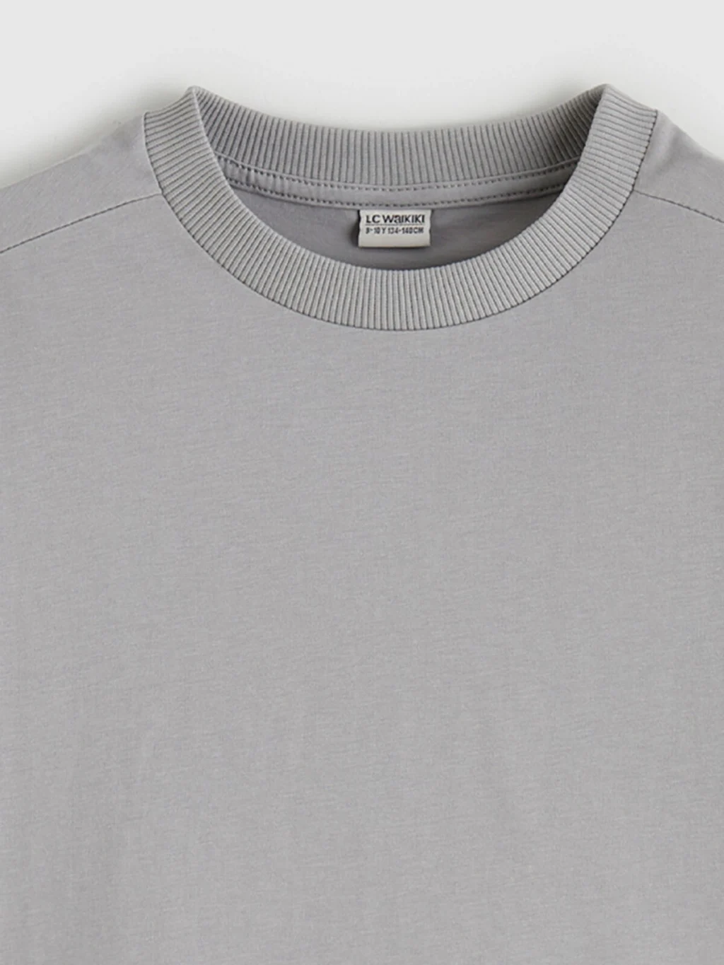Bisiklet yakalı ve kısa kollu erkek çocuk tişört, pamuklu penye kumaştan üretilmiştir ve bol kalıba sahiptir.