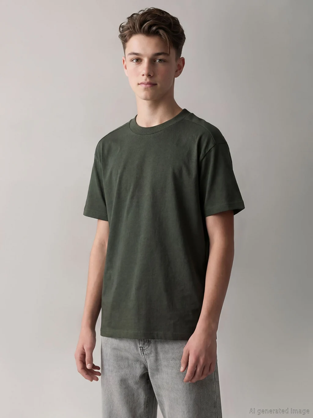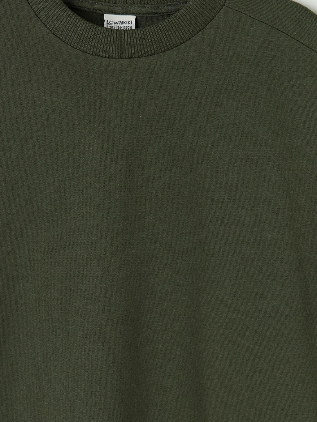 Bol kalıplı, bisiklet yaka ve kısa kollu erkek çocuk tişört, %100 pamuklu penye kumaştan üretilmiştir.
