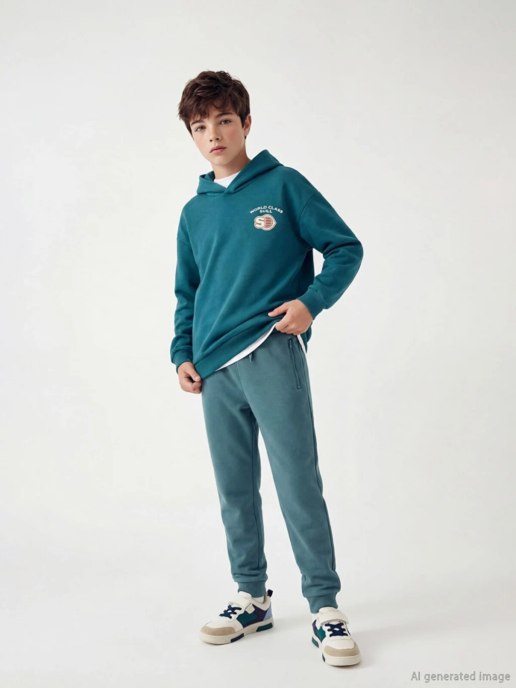Erkek çocuk eşofman altı, orta kalınlıkta 2 iplik kumaştan üretilmiştir. Beli lastikli ve ayarlanabilir iplidir, fermuarlı cepleri ve ribanalı paçaları bulunur.