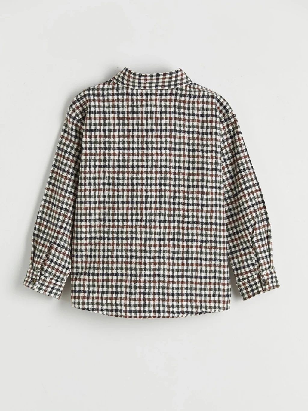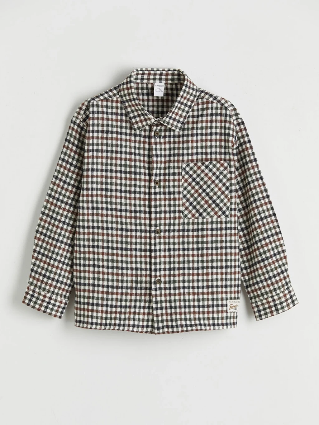 Uzun kollu ve ekose desenli erkek çocuk gömlek, %100 pamuk kumaştan üretilmiştir, tek ceplidir ve önden düğme kapamalıdır.