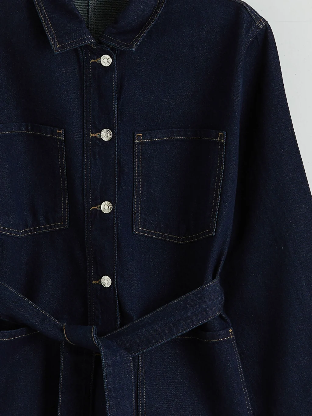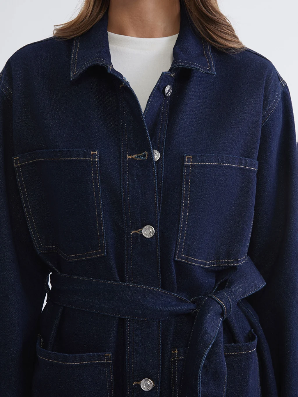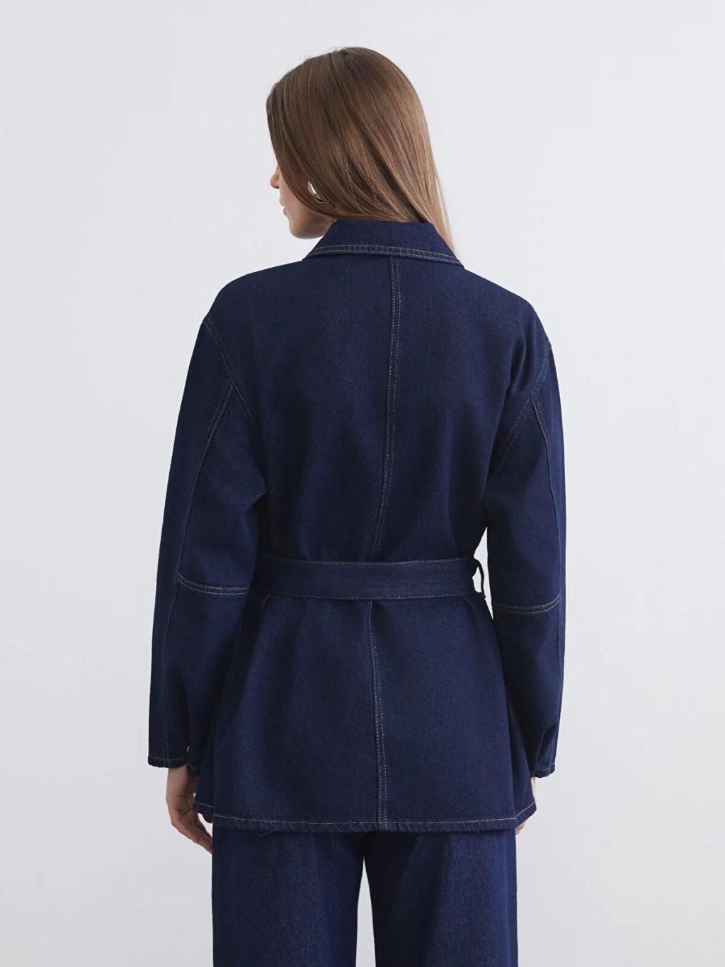 Gömlek yaka, uzun kollu kadın denim ceket, önden düğme kapamalıdır. Dört cepli modelin belinde kendi kumaşından kuşağı bulunur.