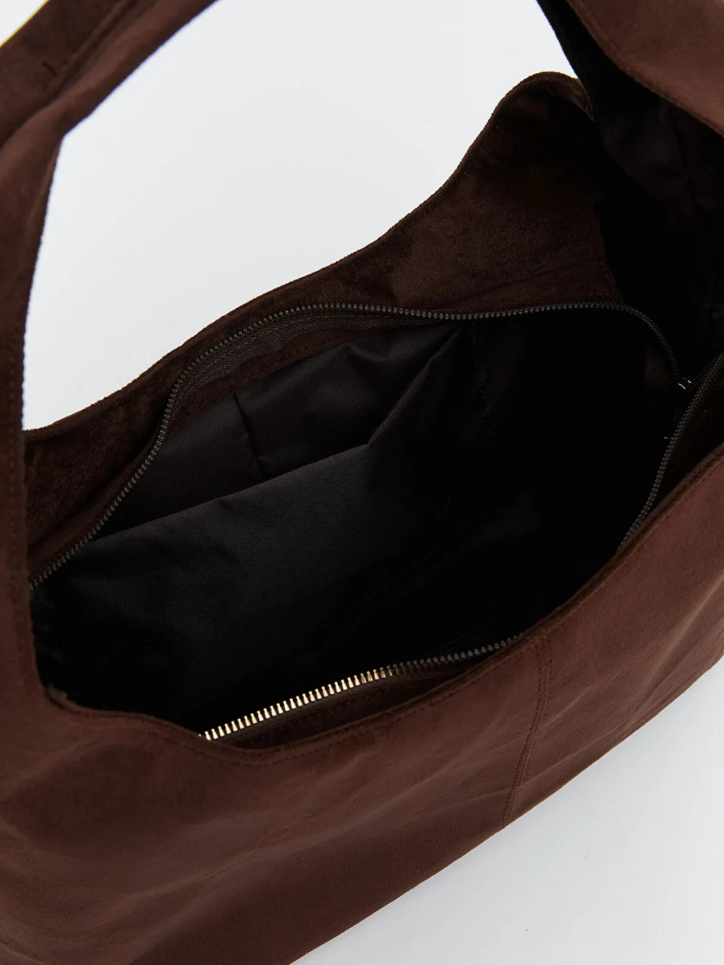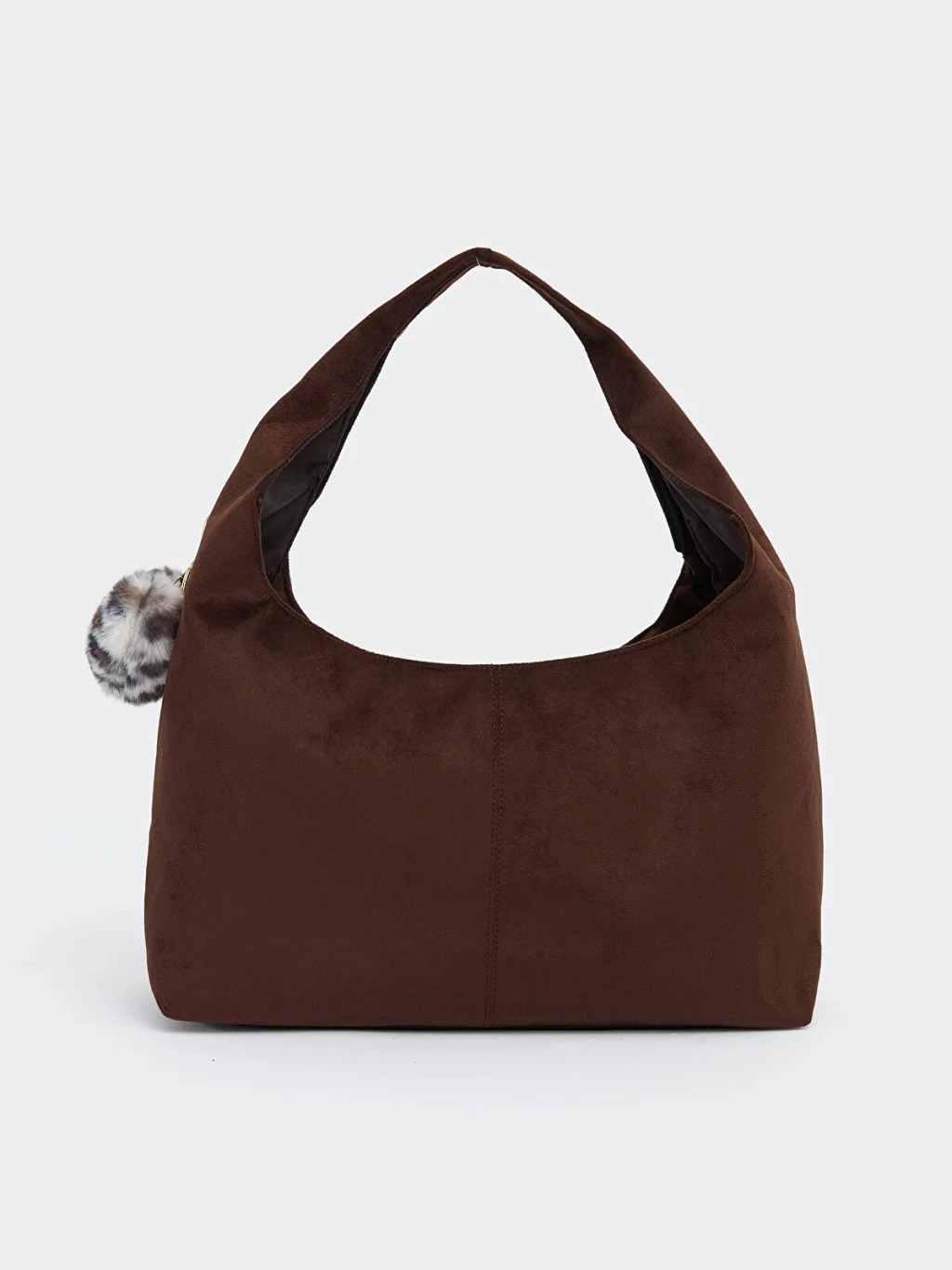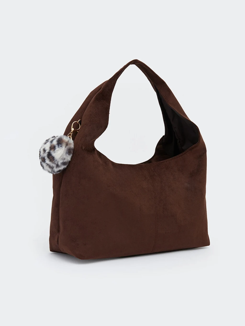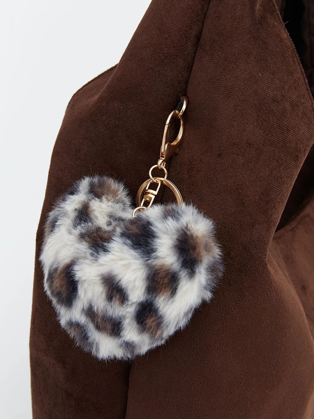 Süet görünümlü kumaştan üretilmiş olan kadın omuz çantası, leopar desenli pelüş anahtarlık detayı ile zenginleştirilmiştir.