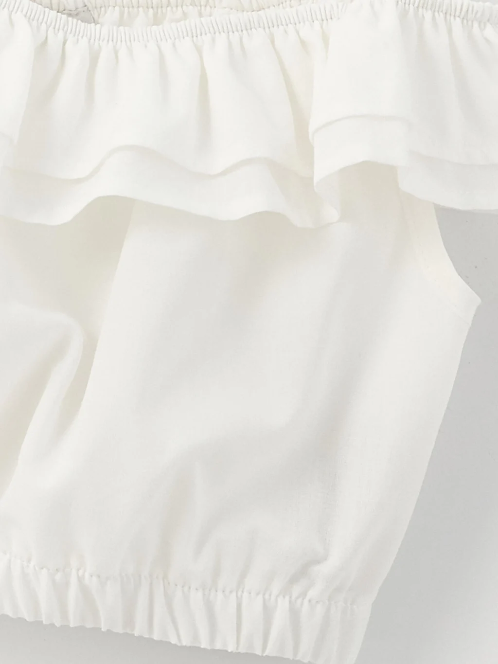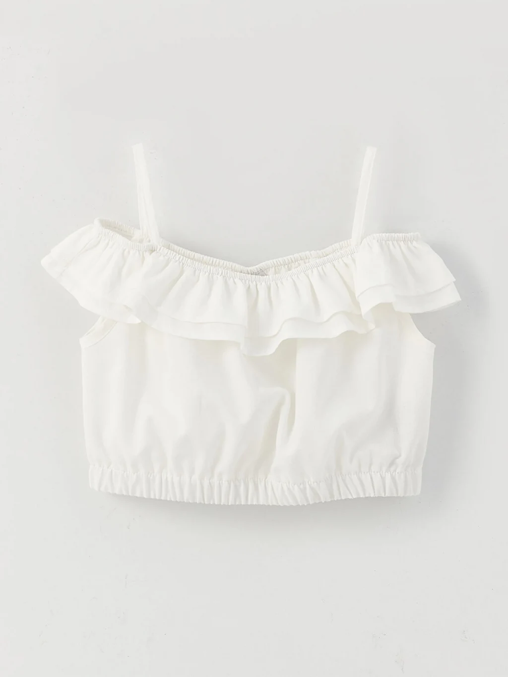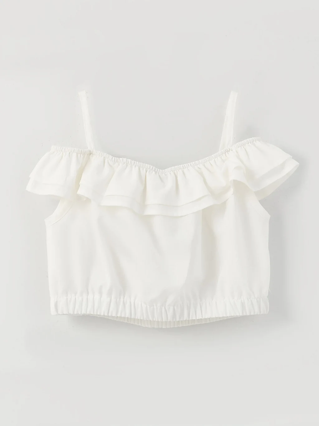 Fırfırlı yakası ve etek ucu lastikli tasarımıyla kız çocukların beğenisini kazanan crop bluz, tarz kombinlerde kendine kolayca yer bulur. Kare yakalı ve askılı bluz modeli, nefes alan pamuklu kumaşı ve ince dokusuyla sıcak havalarda serin tutar.