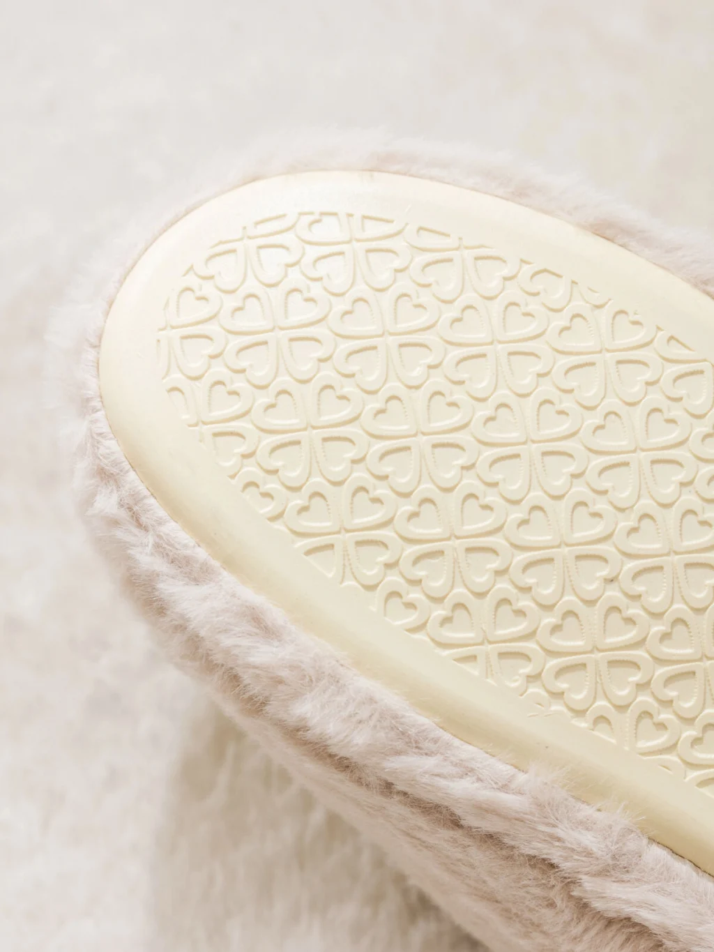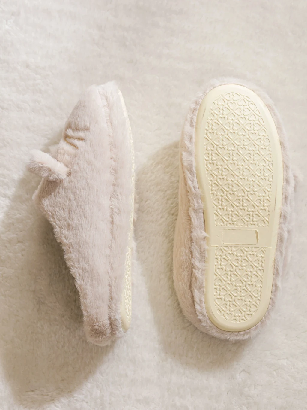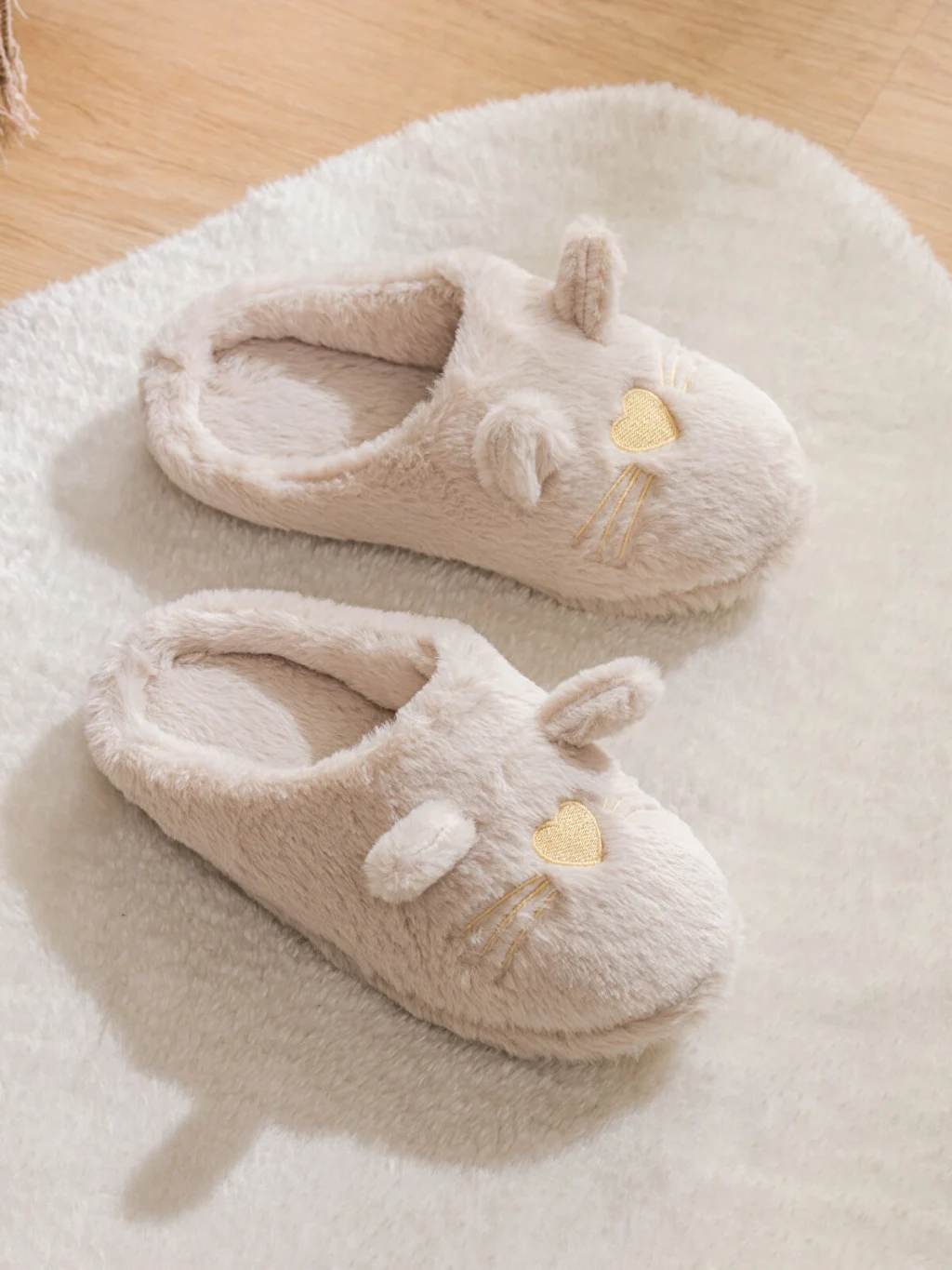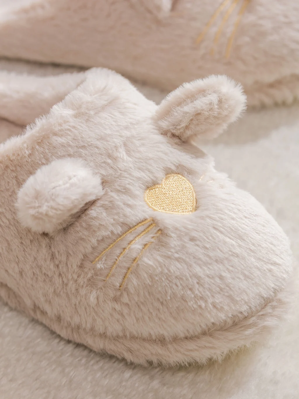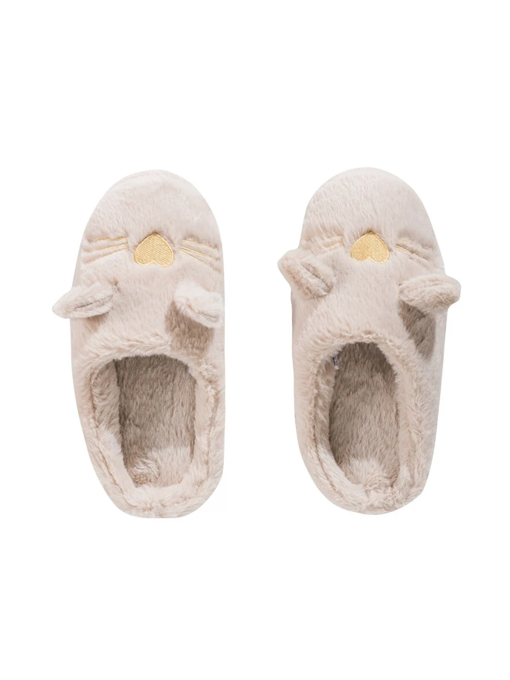 Pelüş kumaştan üretilmiş, kapalı burunlu kadın pandufun üzerinde işlemeli kalp burun, bıyık ve kulak detaylı hayvan figürü bulunur.