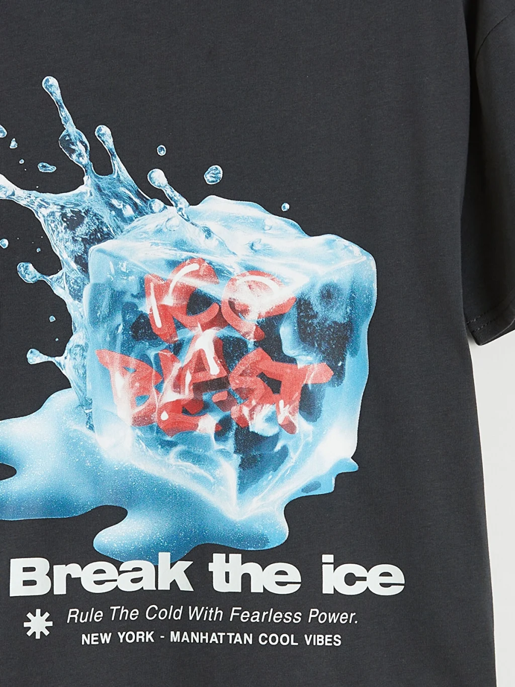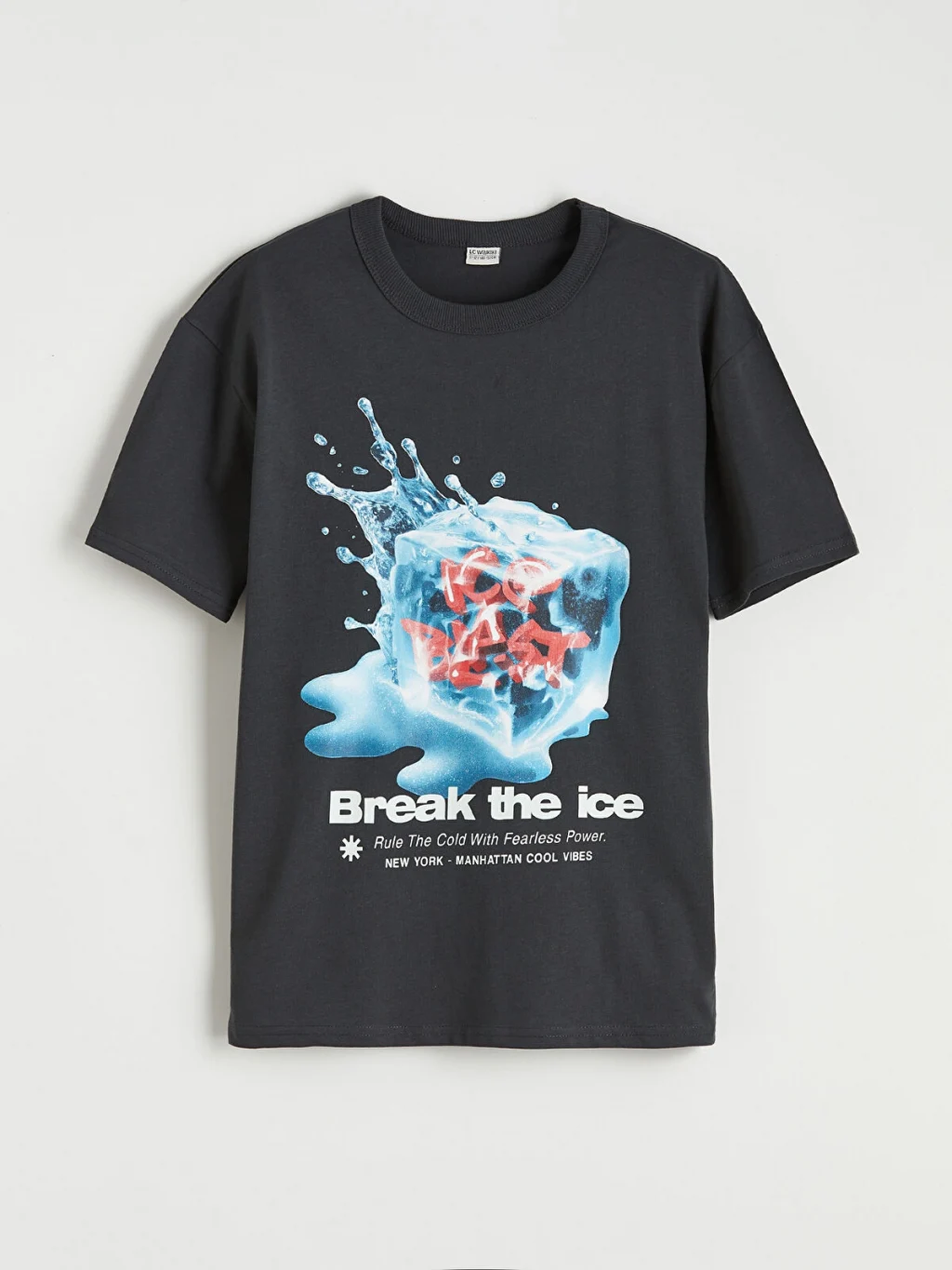 Standart kalıp, bisiklet yaka ve kısa kollu erkek çocuk tişört, ön yüzü baskılıdır ve %100 pamuk içerir.