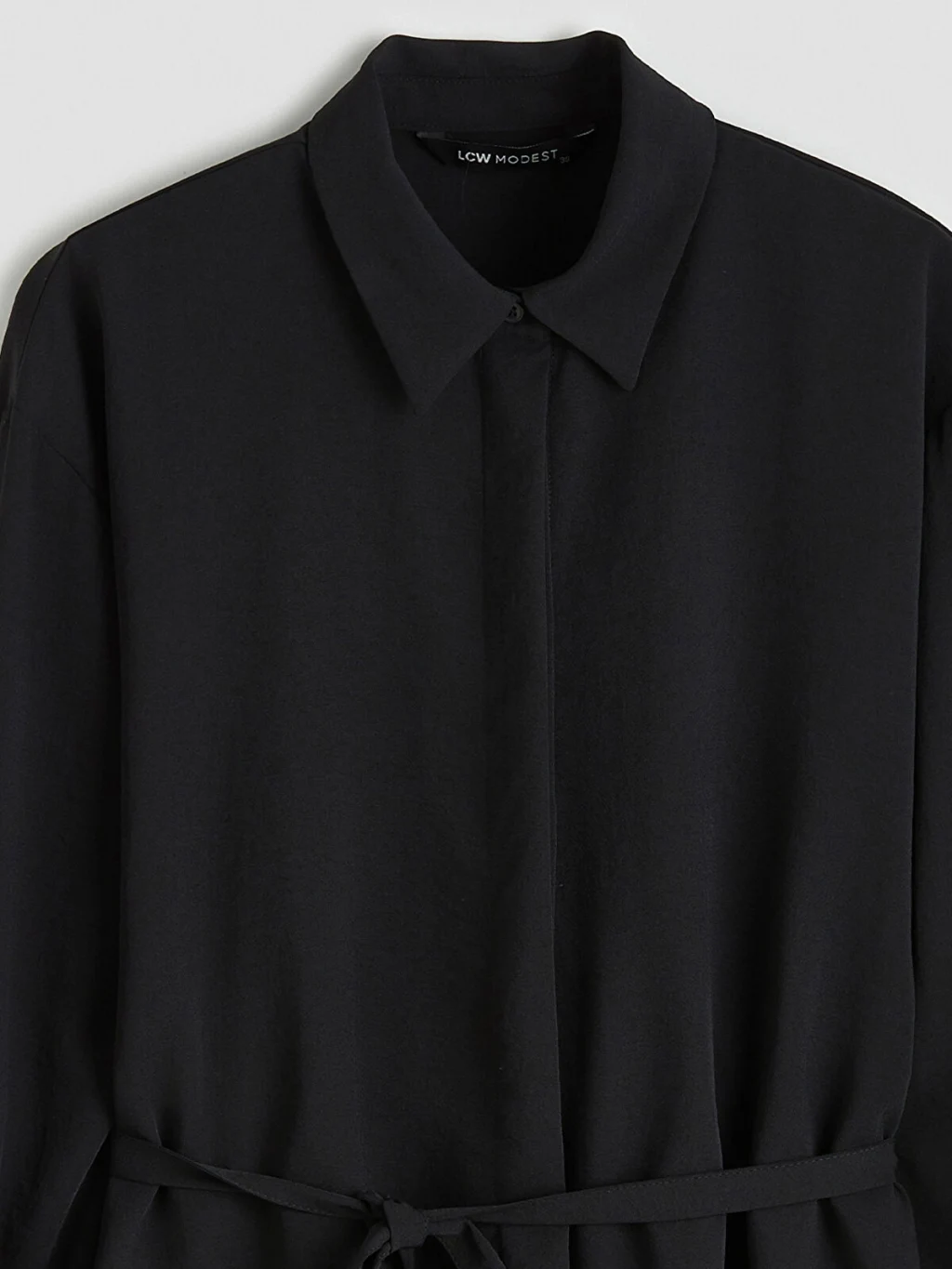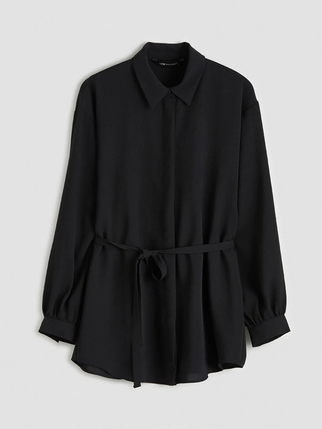 Uzun kollu kadın gömlek tunik, önden gizli düğme kapamalıdır ve belinde bağlamalı kuşağı bulunur.
