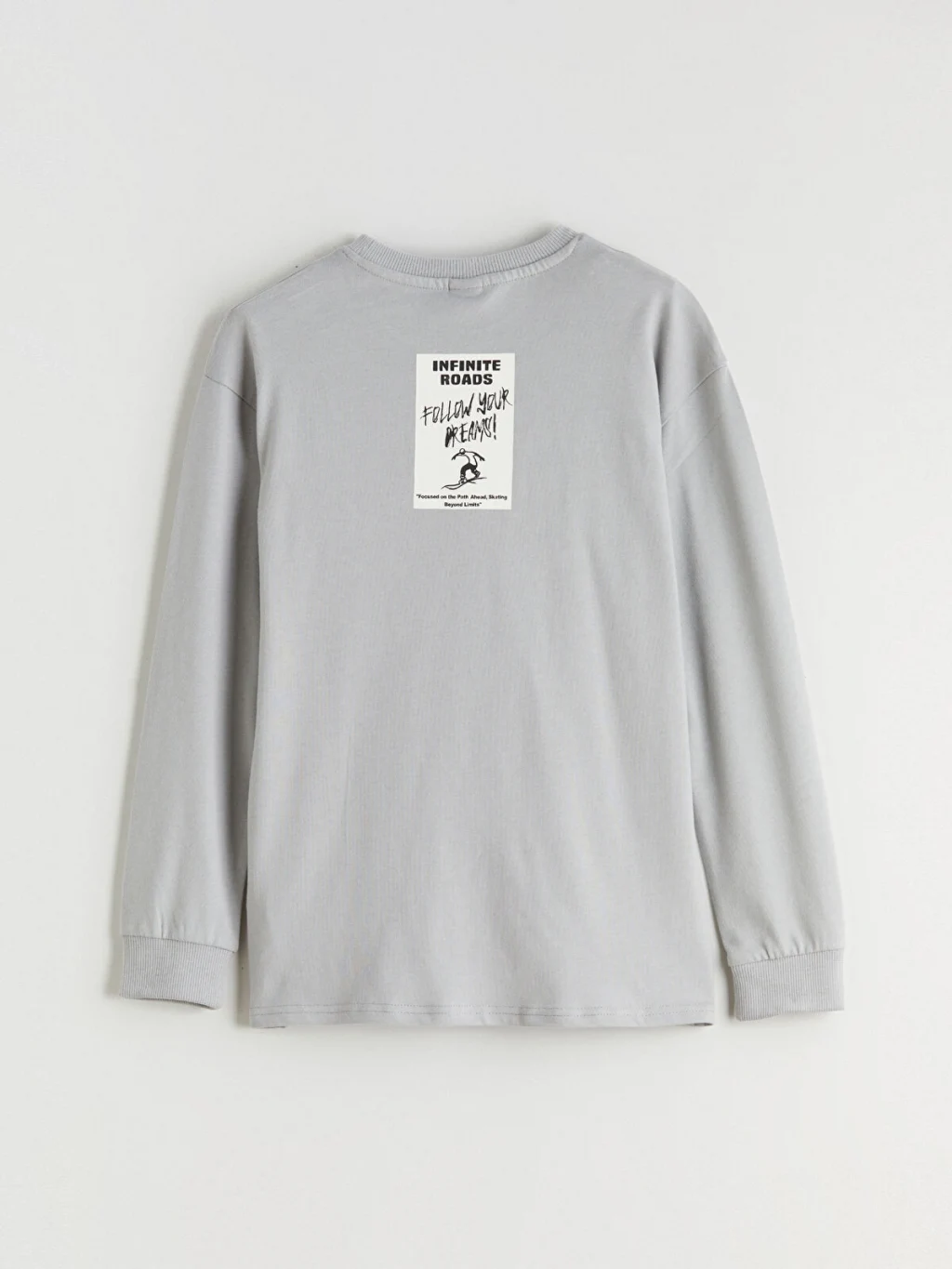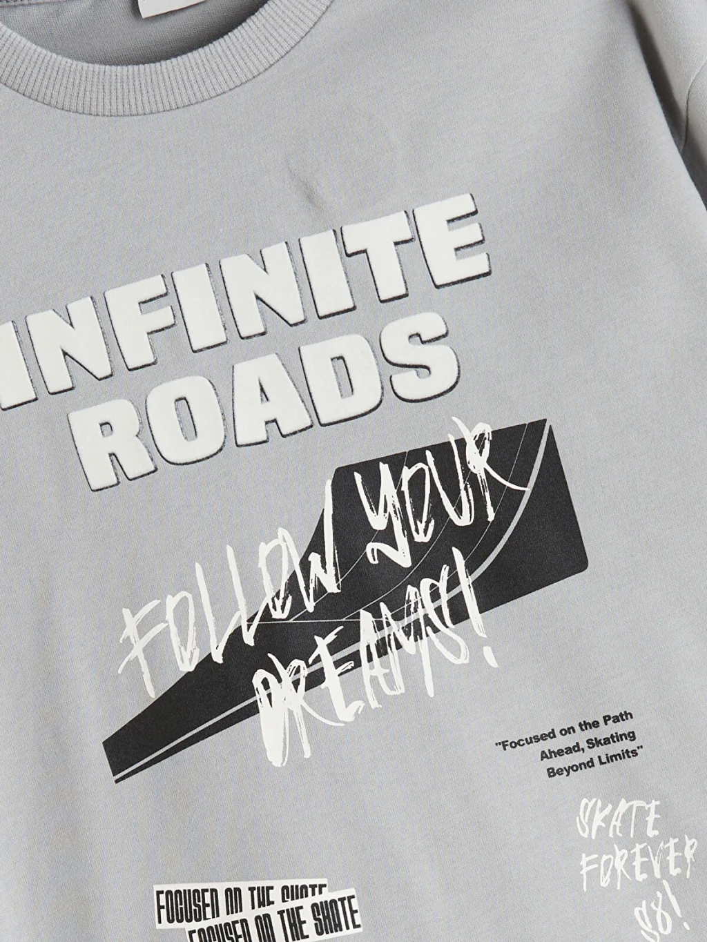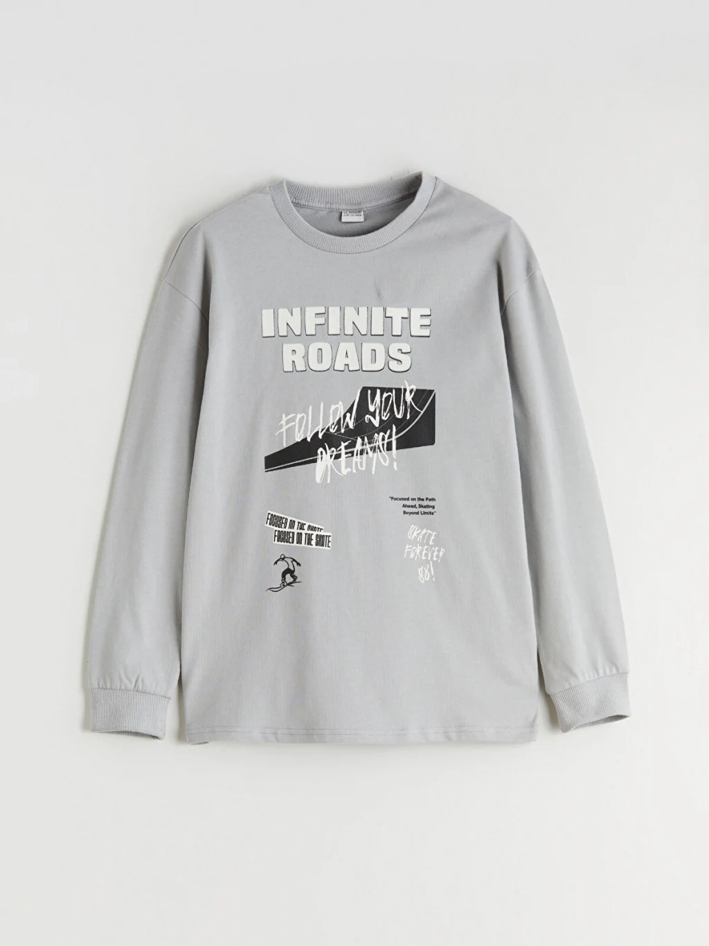 Bisiklet yaka ve uzun kollu erkek çocuk tişört, %100 pamuklu penye kumaştan üretilmiştir. Bol kalıplı ürünün ön yüzü yazı ve grafik baskılıdır.
