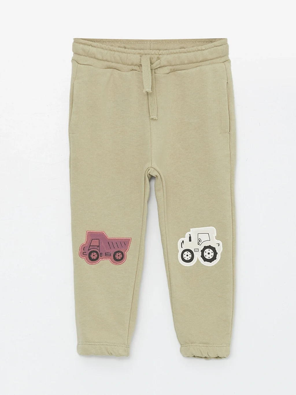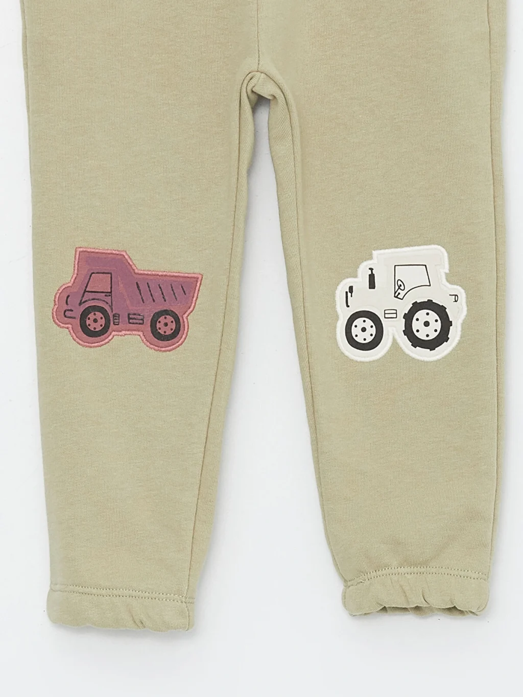Beli lastikli ve ayarlanabilir bağcıklı erkek çocuk eşofman altı, yan ceplidir. Paçaları ribanalı olup, dizlerinde araç aplikesi bulunur.