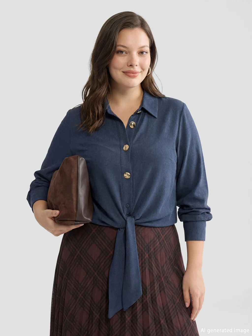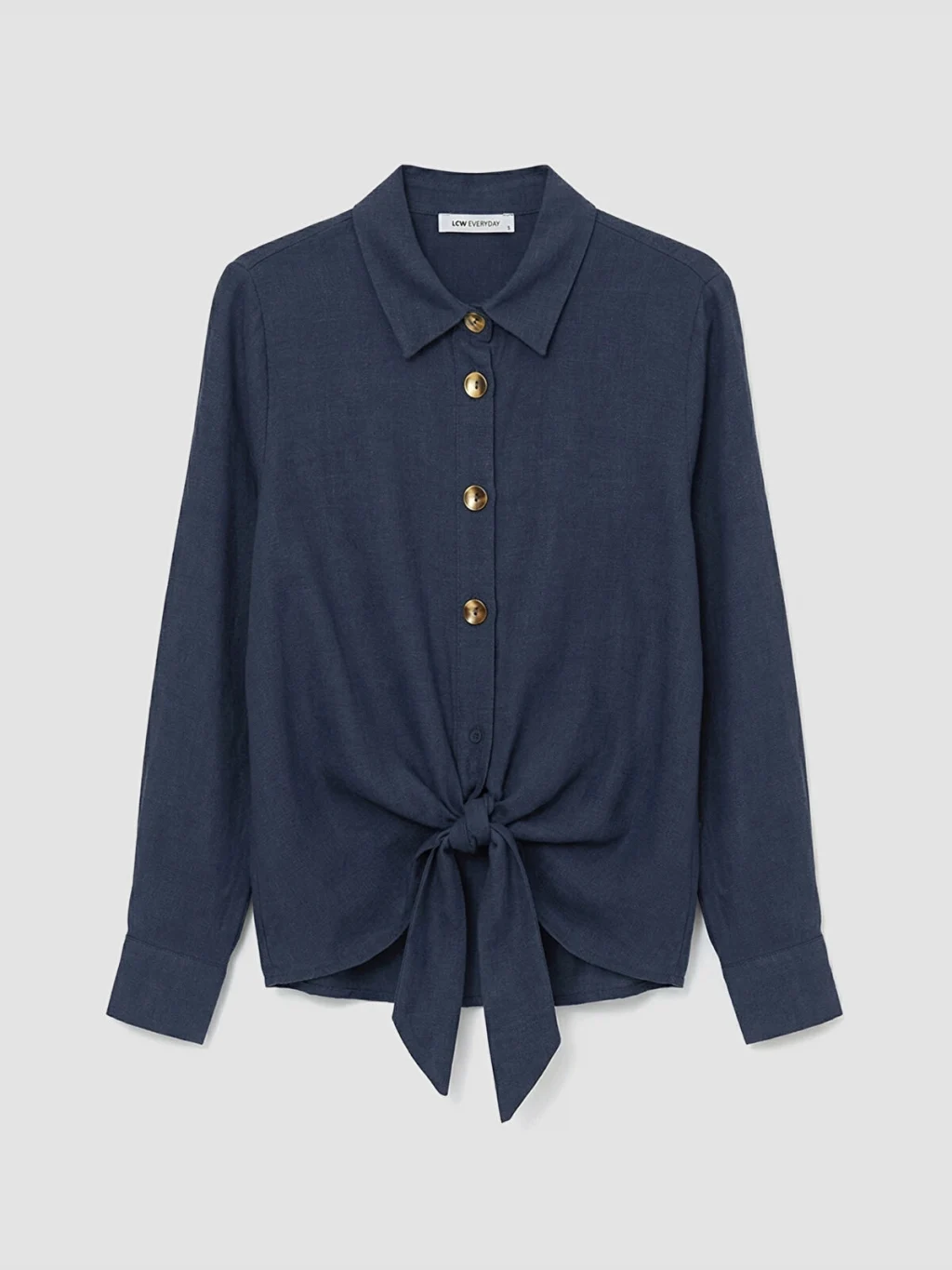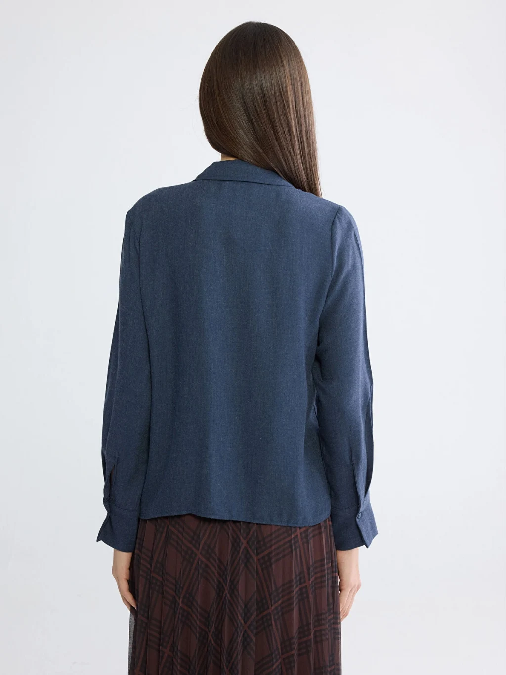 Uzun kollu ve yakalı kadın gömlek, önden düğme kapamalıdır. Etek ucunda yer alan bağlama detayı bulunur.