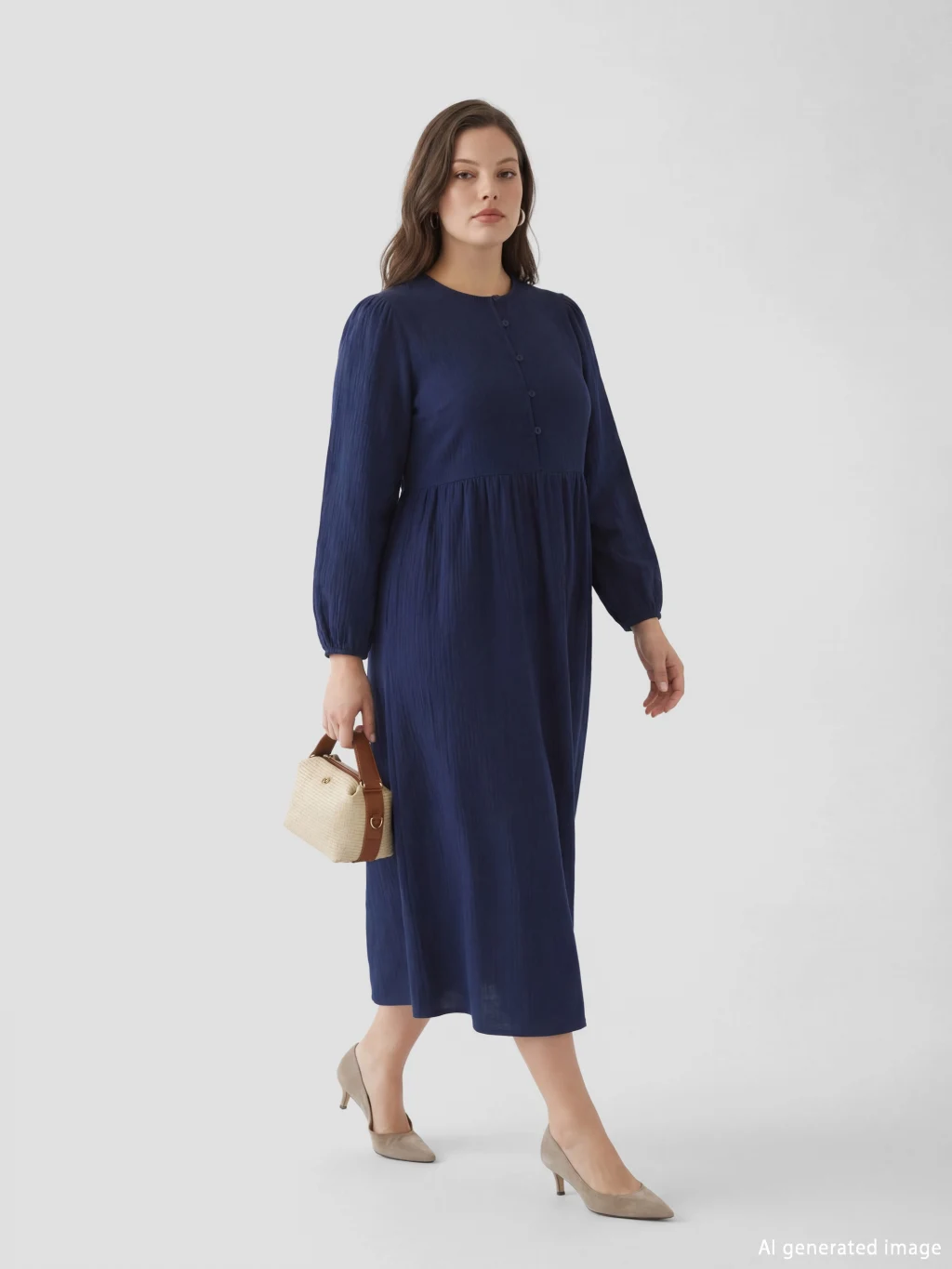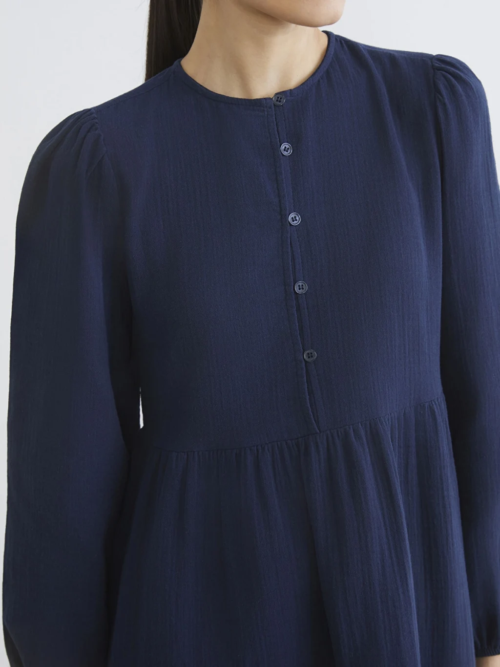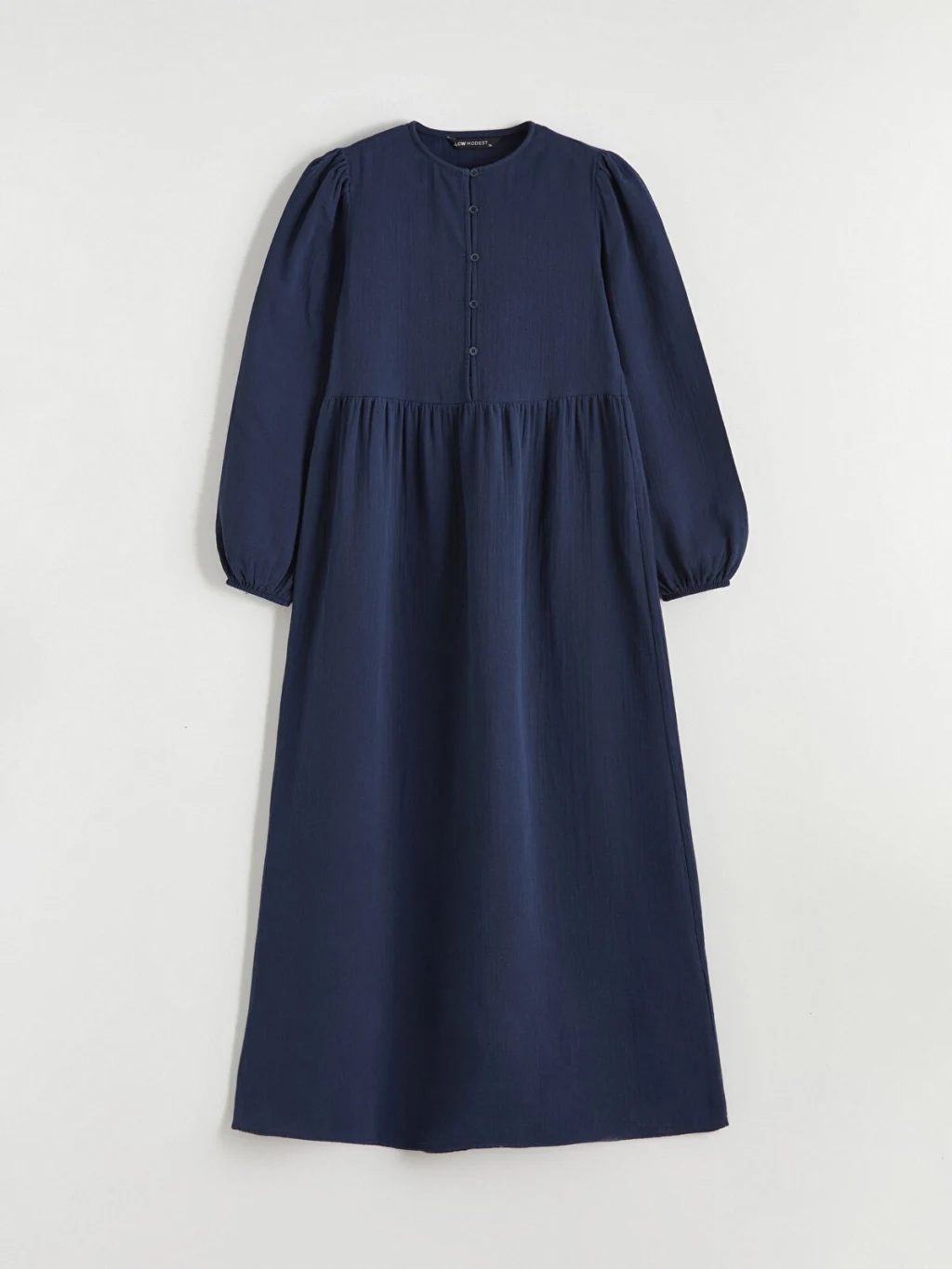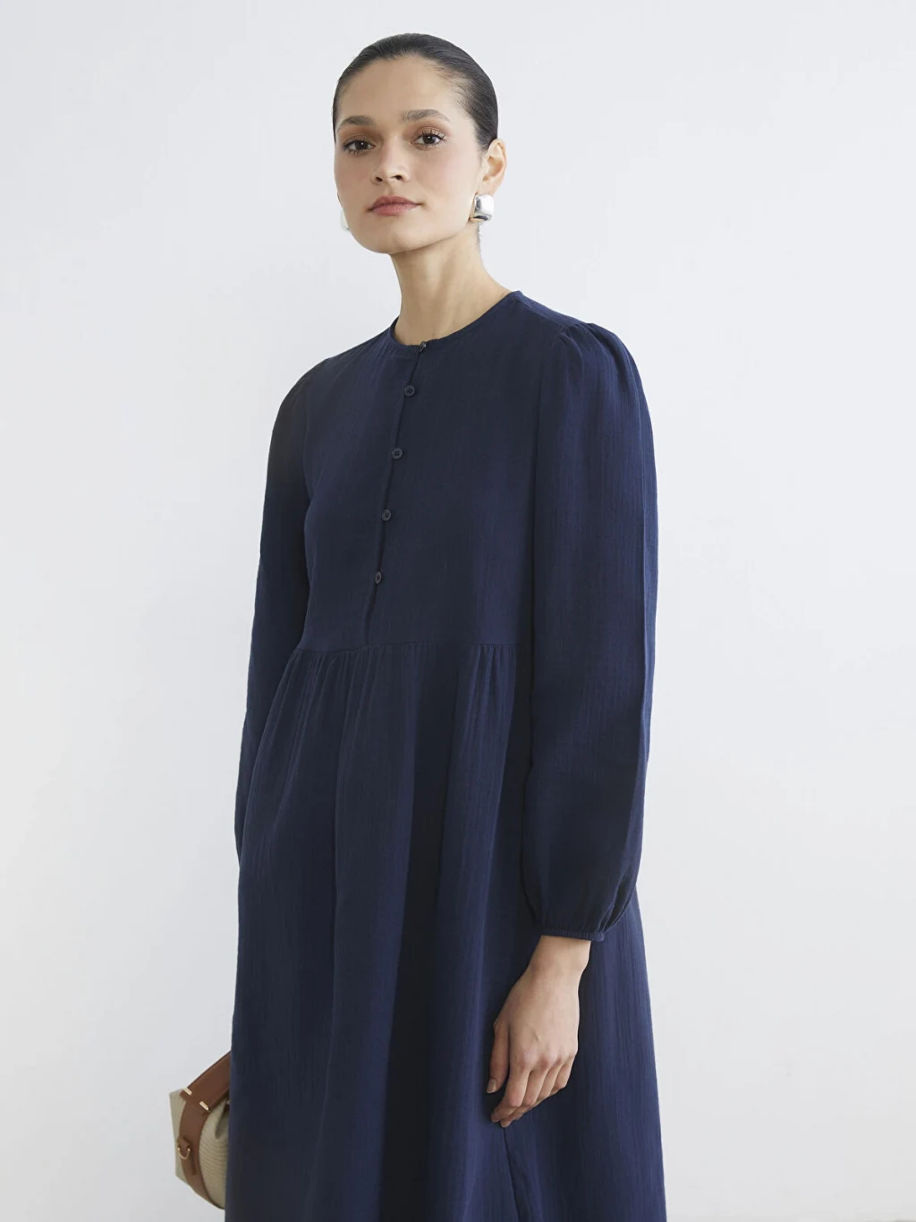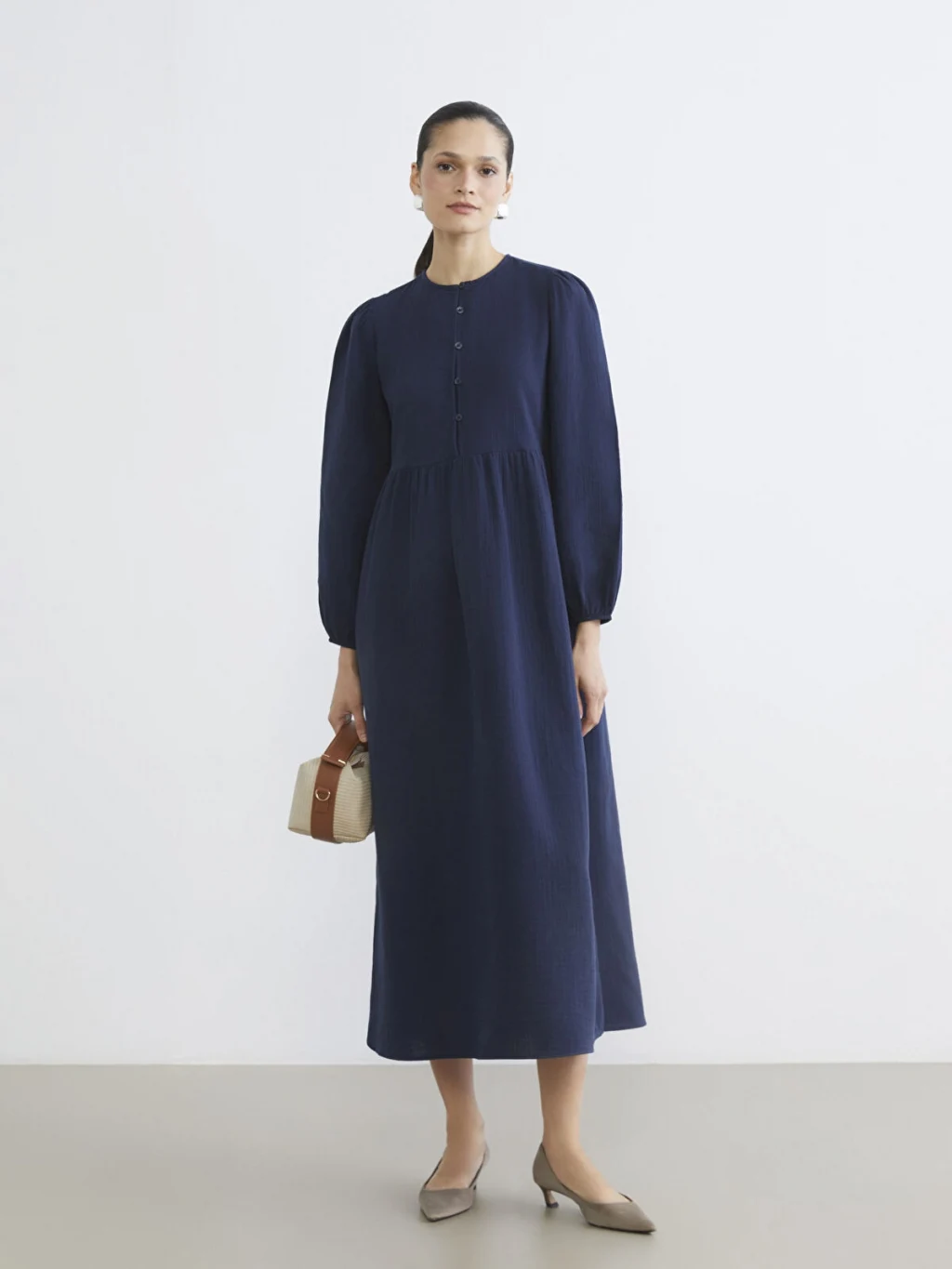 Bisiklet yakalı, uzun kollu kadın elbise, %100 pamuk içerikli müslin kumaştan üretilmiştir. Astarsızdır, önden düğme kapamalıdır.
