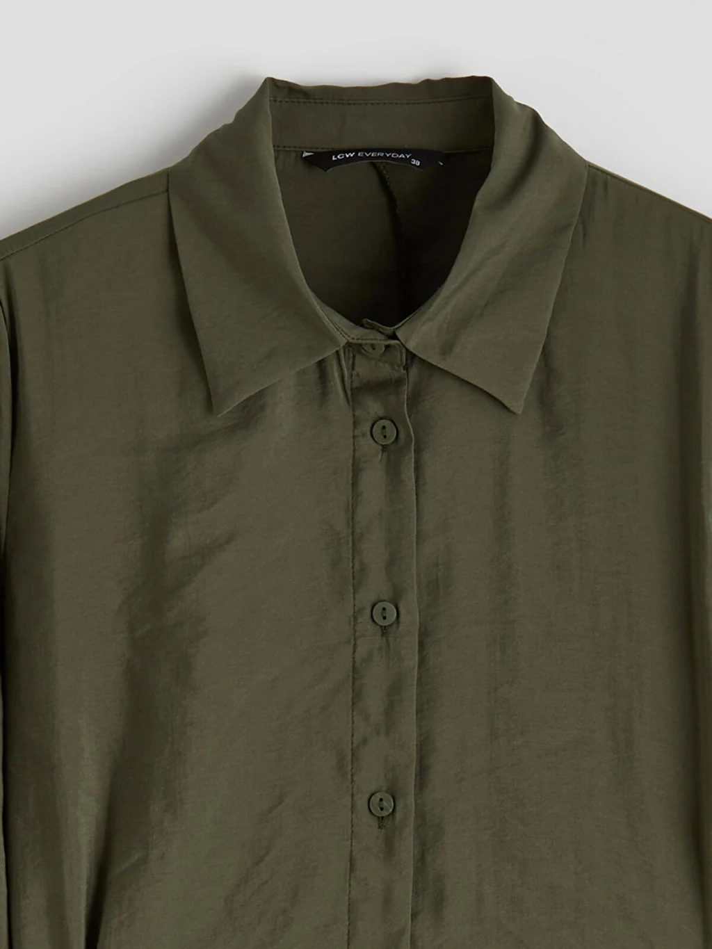 Kadın elbise, gömlek yaka ve uzun kollu bir tasarıma sahiptir. Önden boydan boya düğme kapamalıdır ve bel kısmında toka detayı vardır.