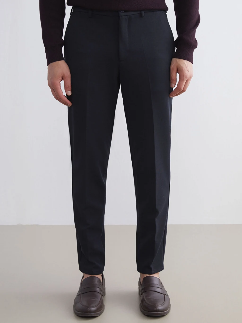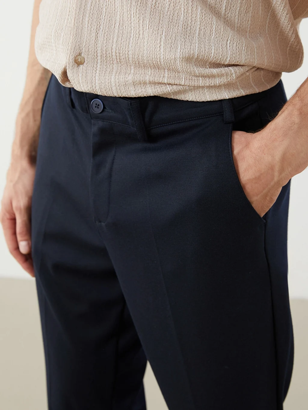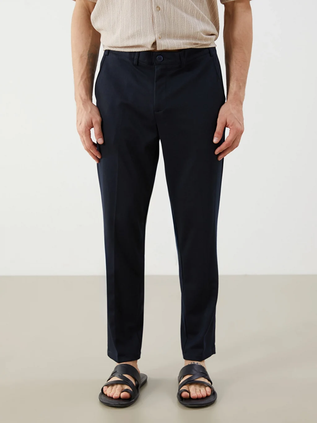 Dar kalıp chino pantolon; esnek kumaş yapısı, normal bel yüksekliği ve paçaya doğru daralan kesimiyle vücudu hafif sararken gün boyu rahatlık sağlar.