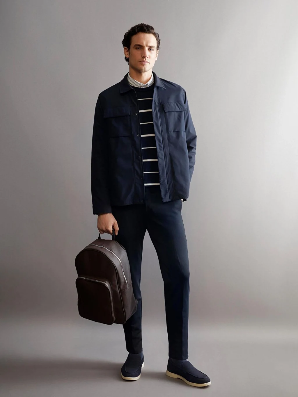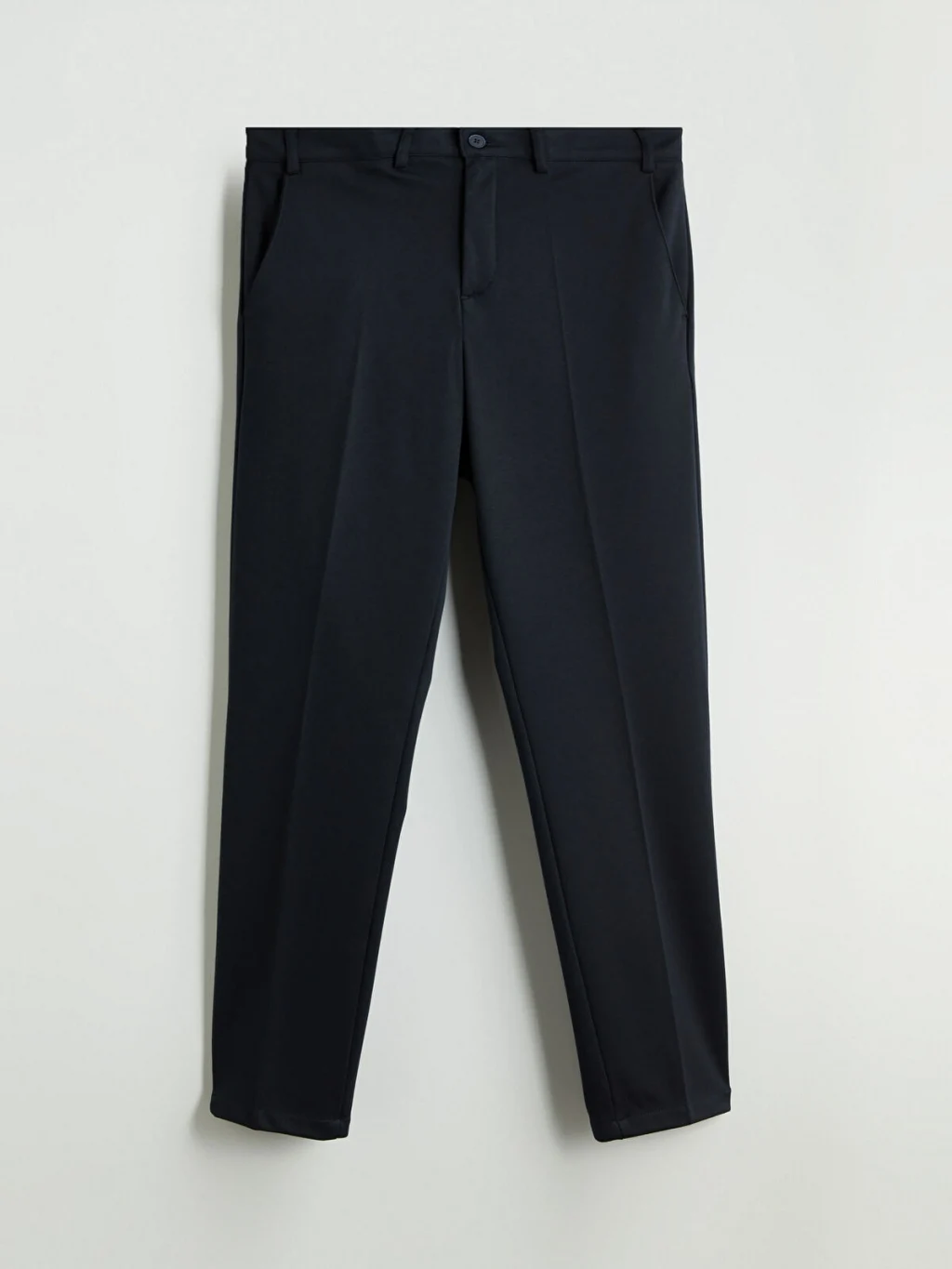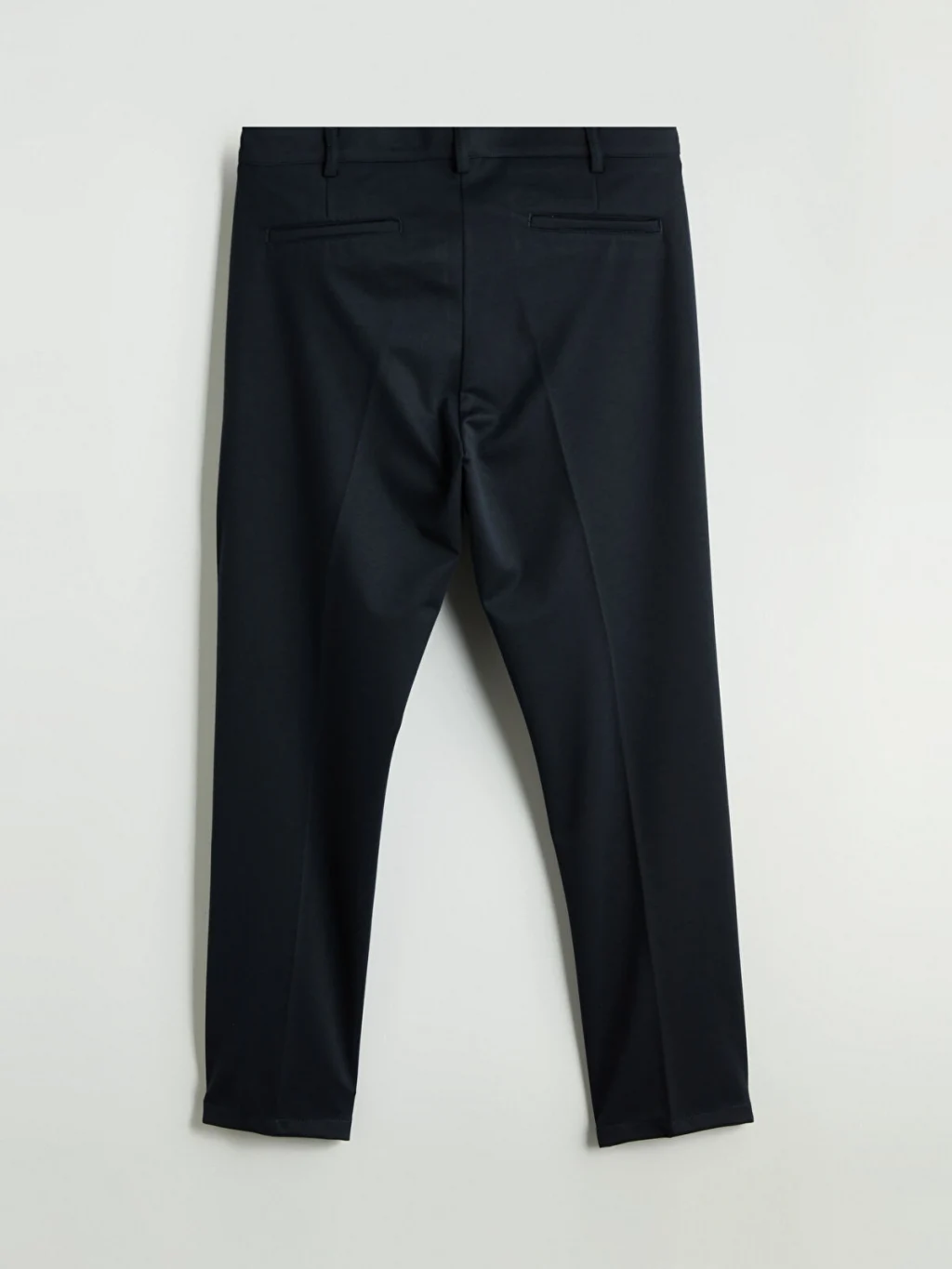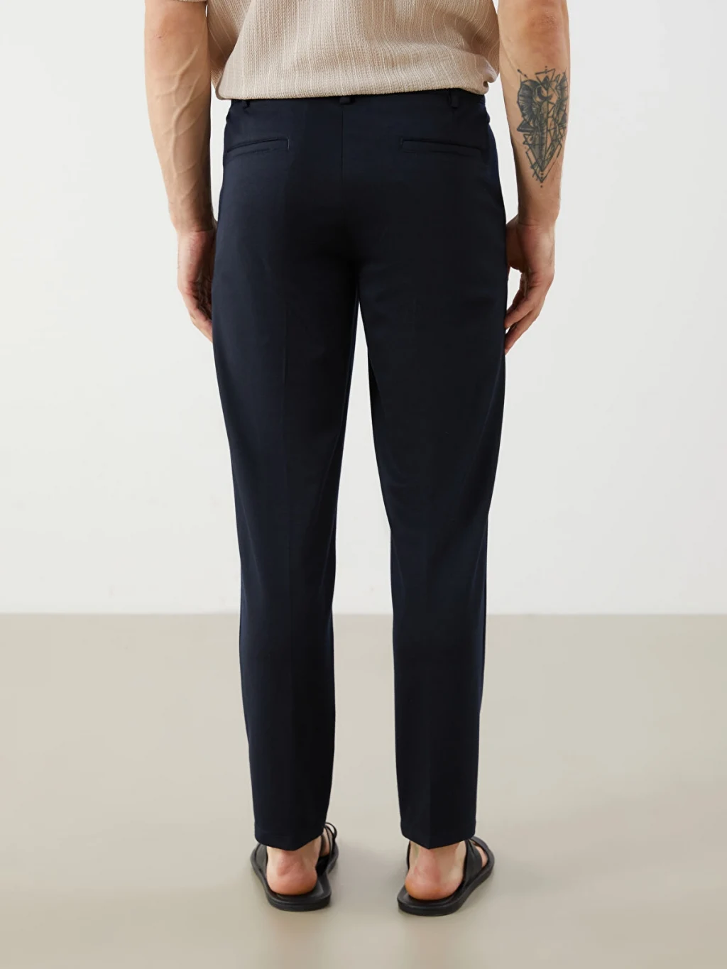 Dar kalıp chino pantolon; esnek kumaş yapısı, normal bel yüksekliği ve paçaya doğru daralan kesimiyle vücudu hafif sararken gün boyu rahatlık sağlar.