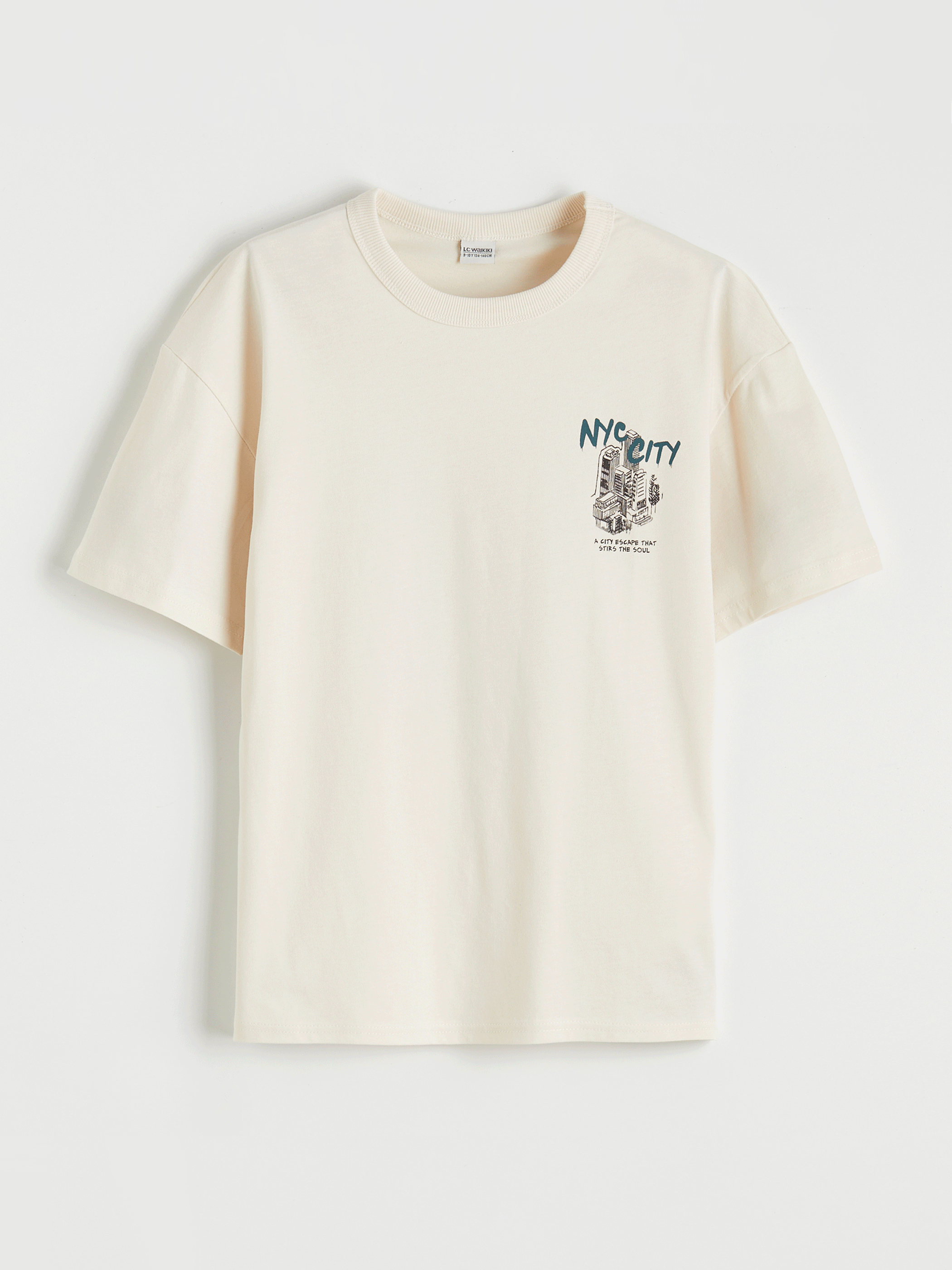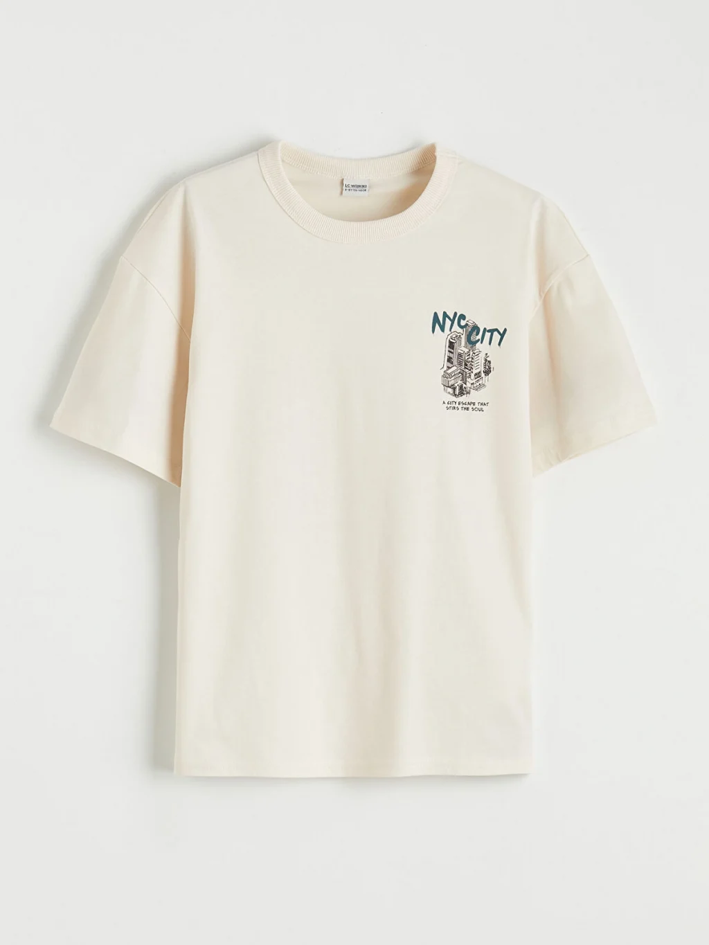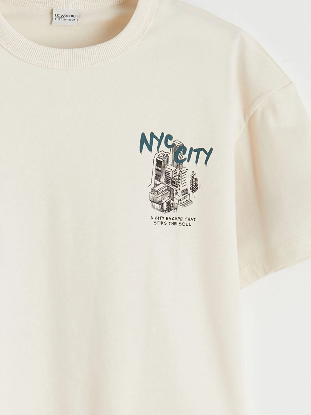 Erkek çocuk tişört, pamuklu penye kumaştan üretilmiştir. Bisiklet yaka, kısa kollu ve önü baskılı bir tasarıma sahiptir.