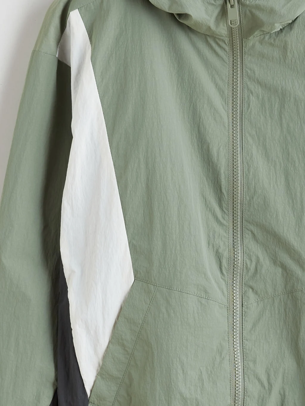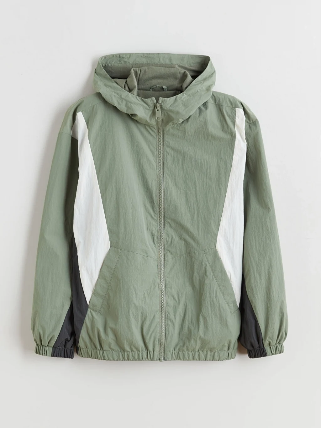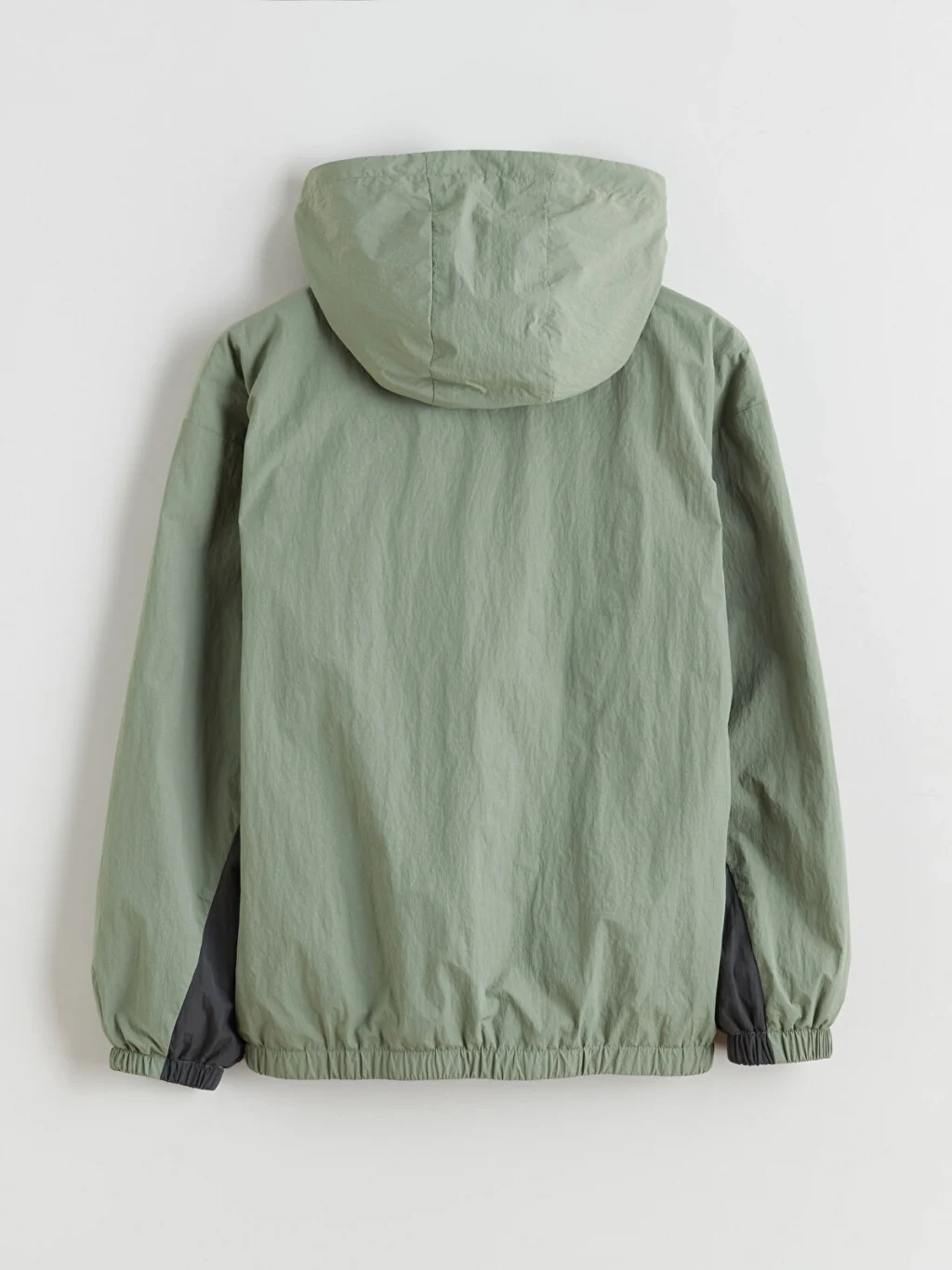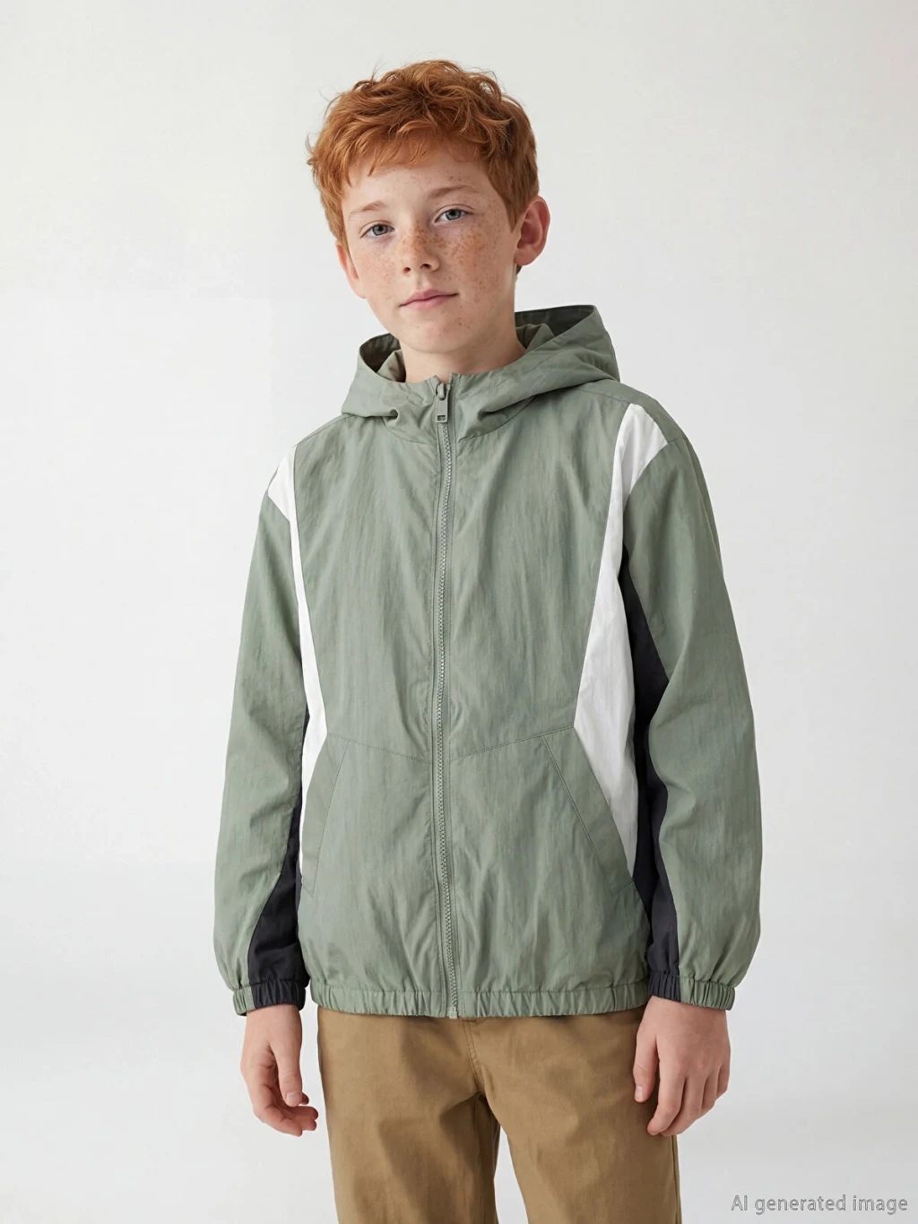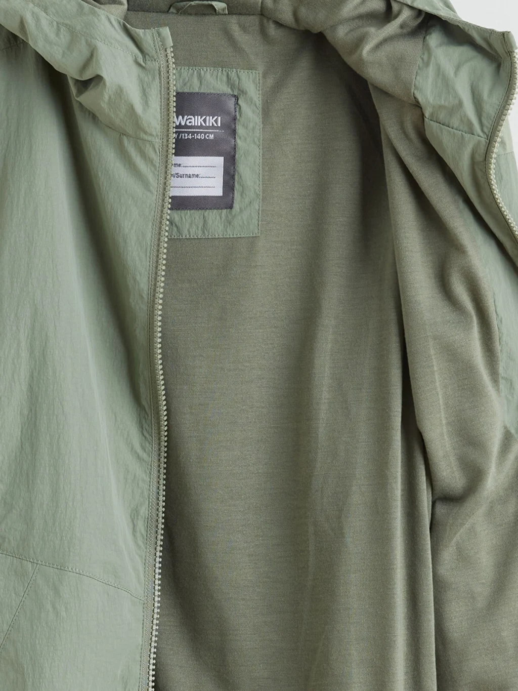 Kapüşonlu, fermuar kapamalı erkek çocuk mont, ince krinkle kumaştan üretilmiştir. Uzun kollu modelin kol ve etek uçları lastiklidir.