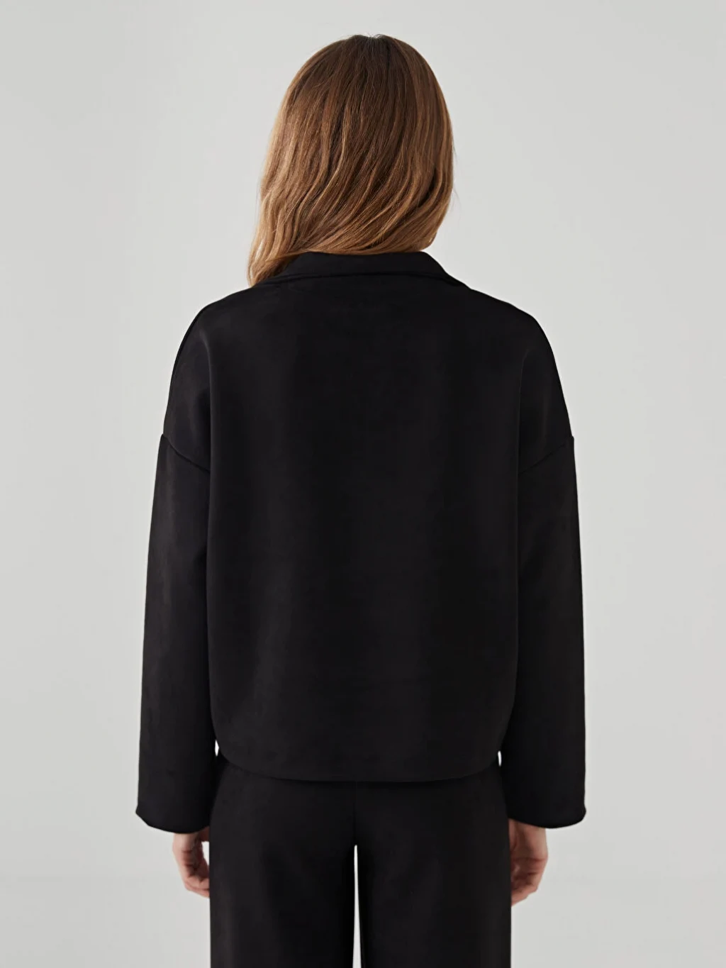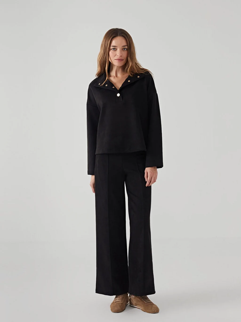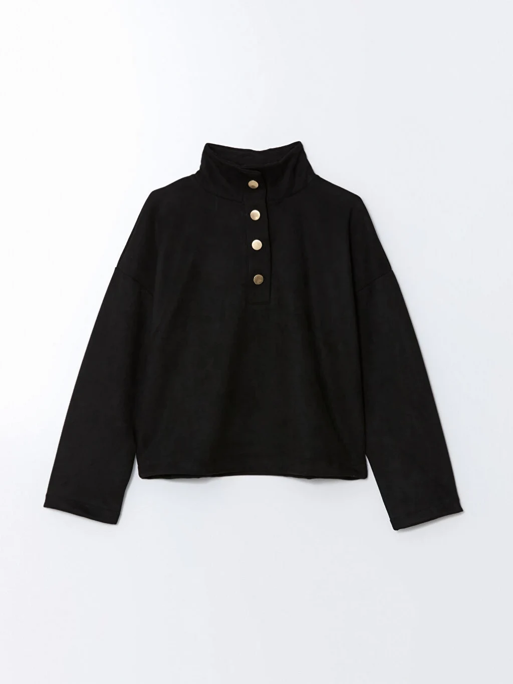 Dik yaka düz oversize kadın sweatshirt, yakasındaki düğme kapaması ile hem modern bir görünüm sunar hem de kullanım kolaylığı sağlar. Yumuşak dokusu, gün boyu rahatlık ve sıcaklık sunarak, serin günlerde ideal bir seçenek haline gelir.
