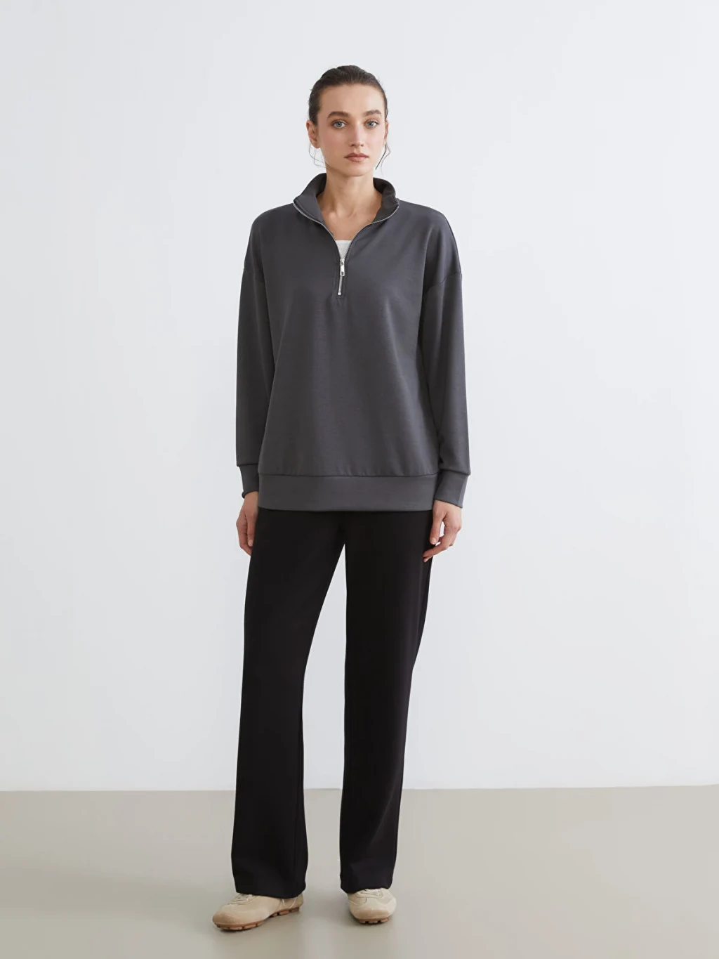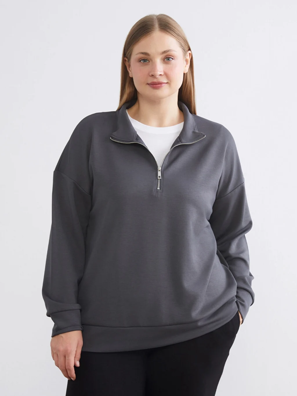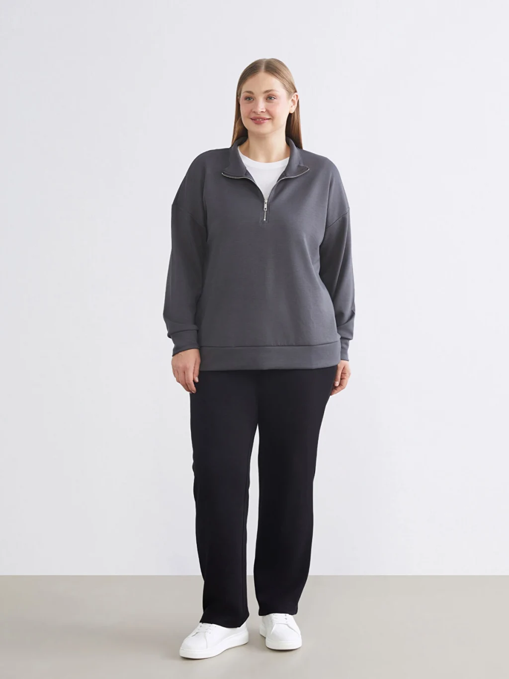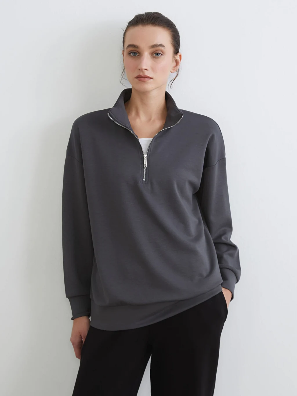 Dik yakalı ve yarım fermuar kapamalı kadın sweatshirt, uzun kolludur. İnce interlok kumaştan üretilmiştir.