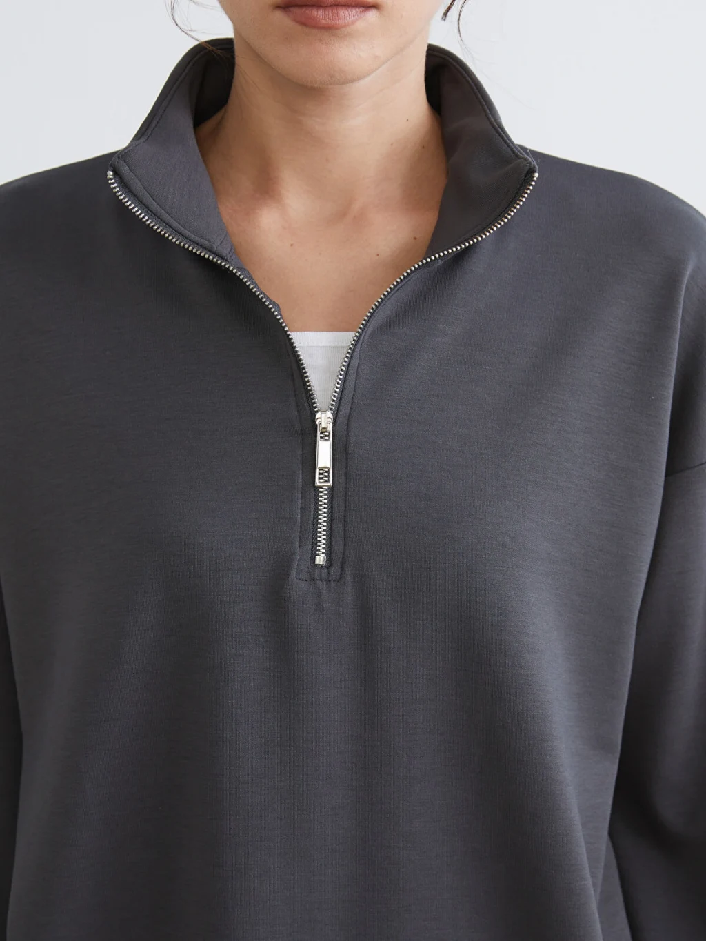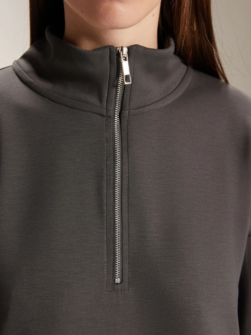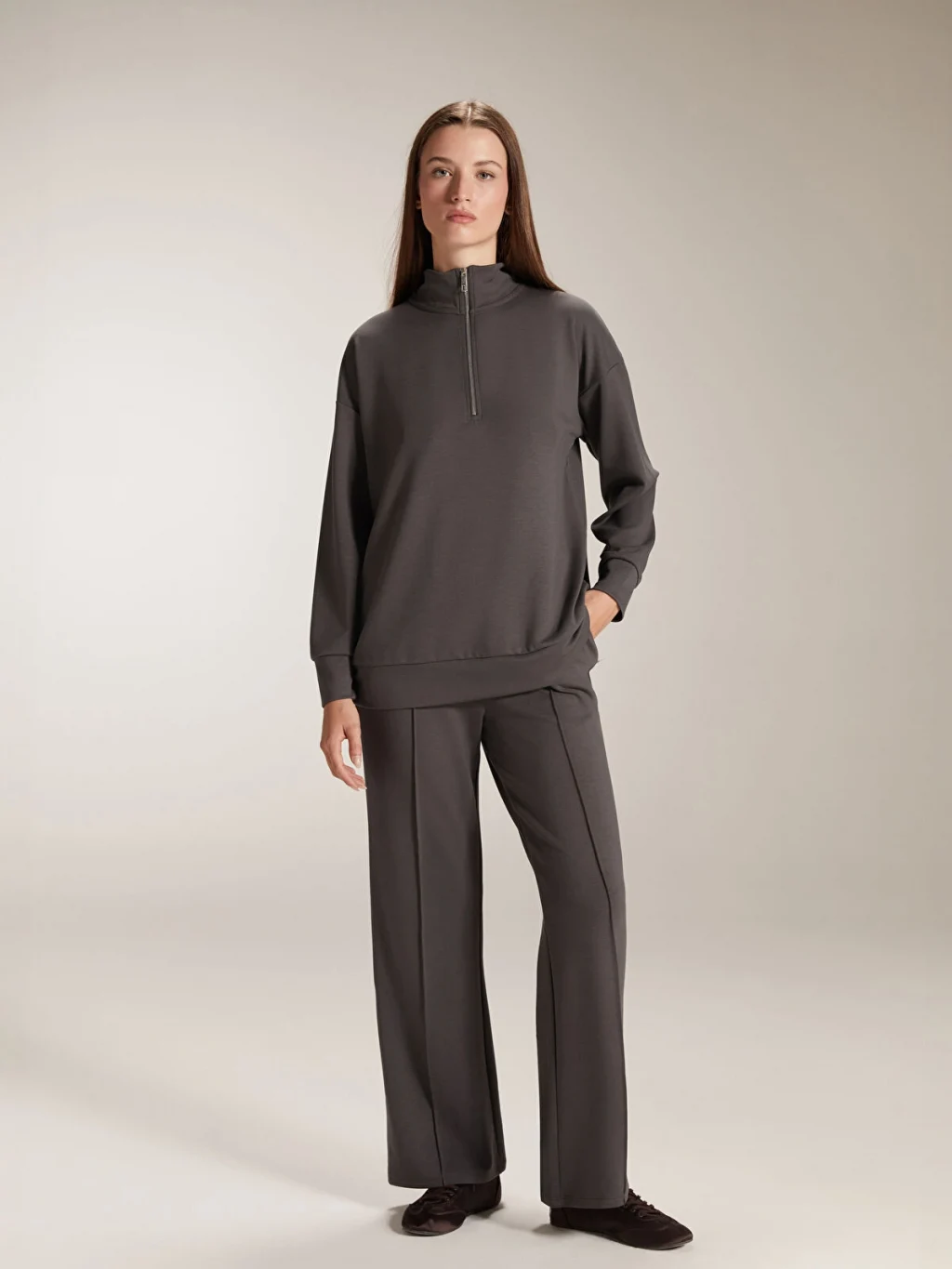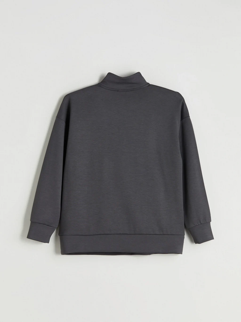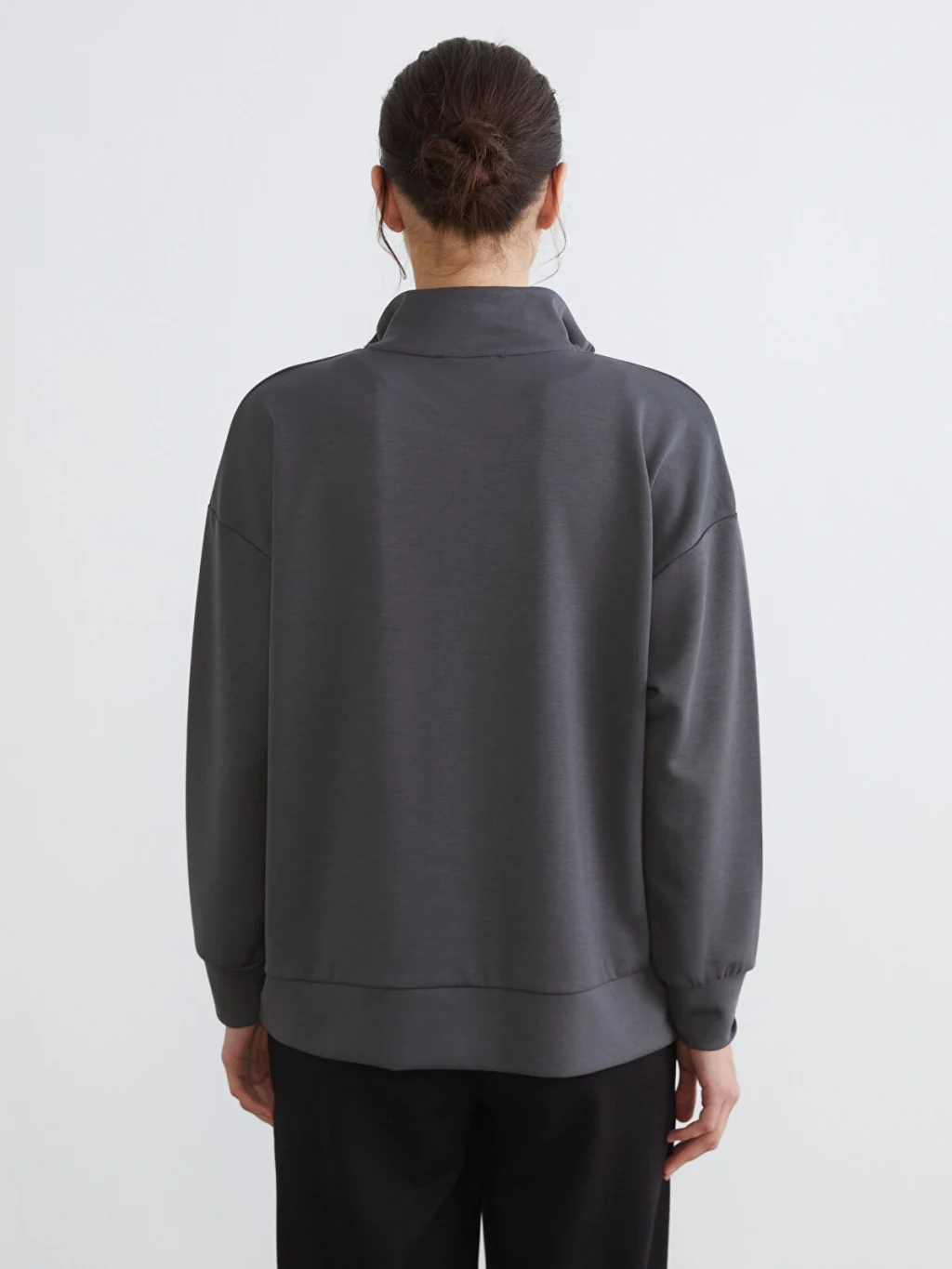 Dik yakalı ve yarım fermuar kapamalı kadın sweatshirt, uzun kolludur. İnce interlok kumaştan üretilmiştir.
