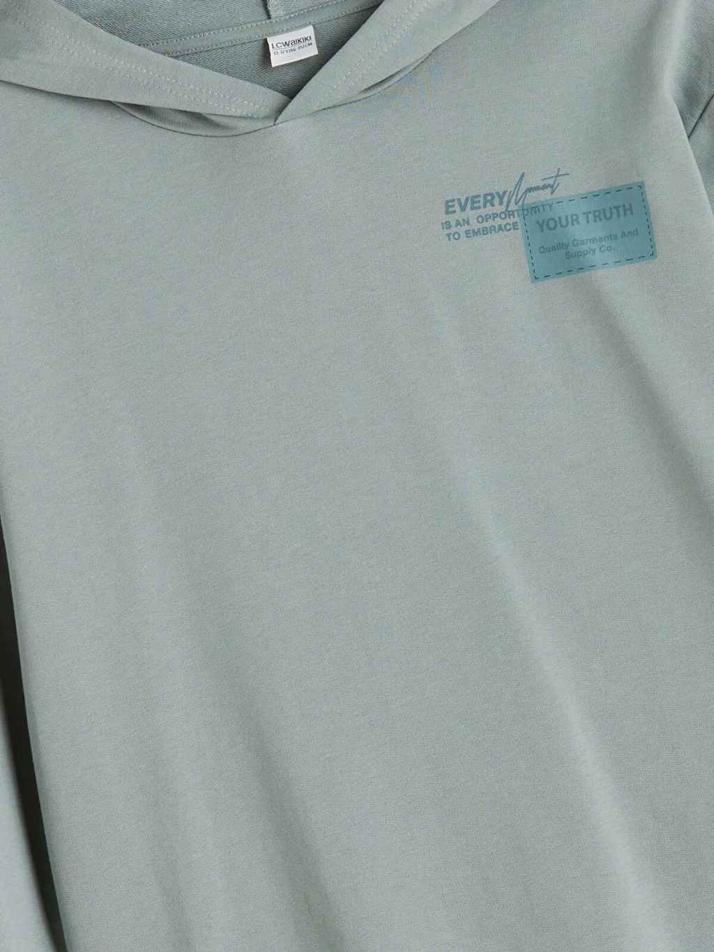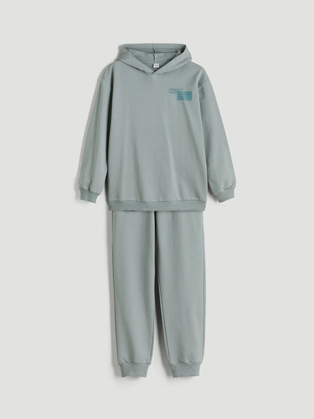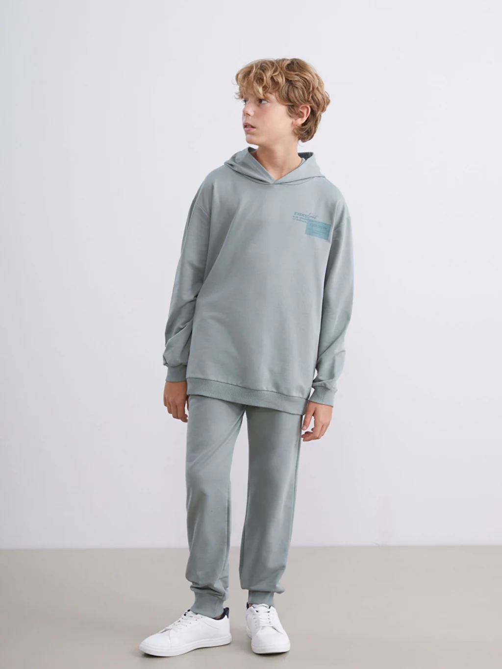 2 iplik kumaştan üretilen erkek çocuk eşofman takımı, kapüşonlu üst ve ribanalı eşofman altından oluşur. Baskılı tasarımlıdır.