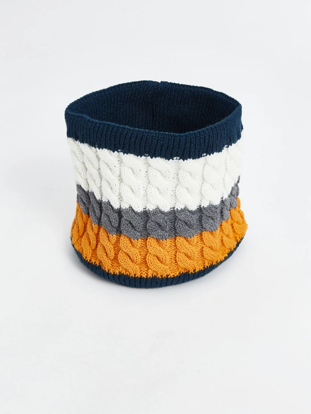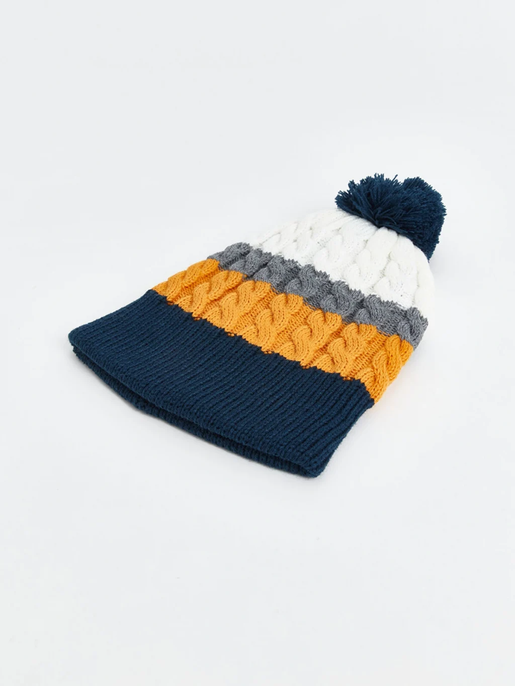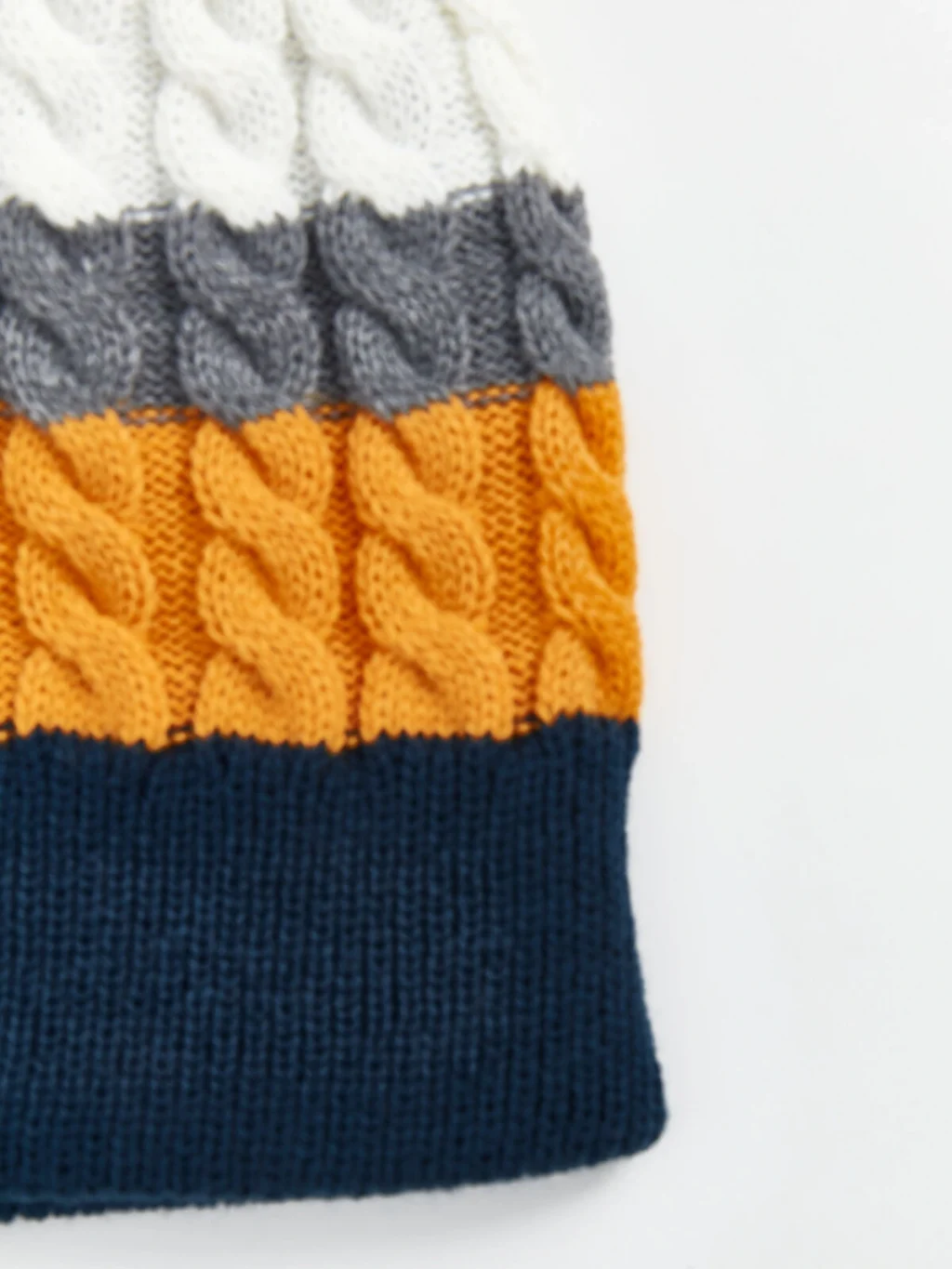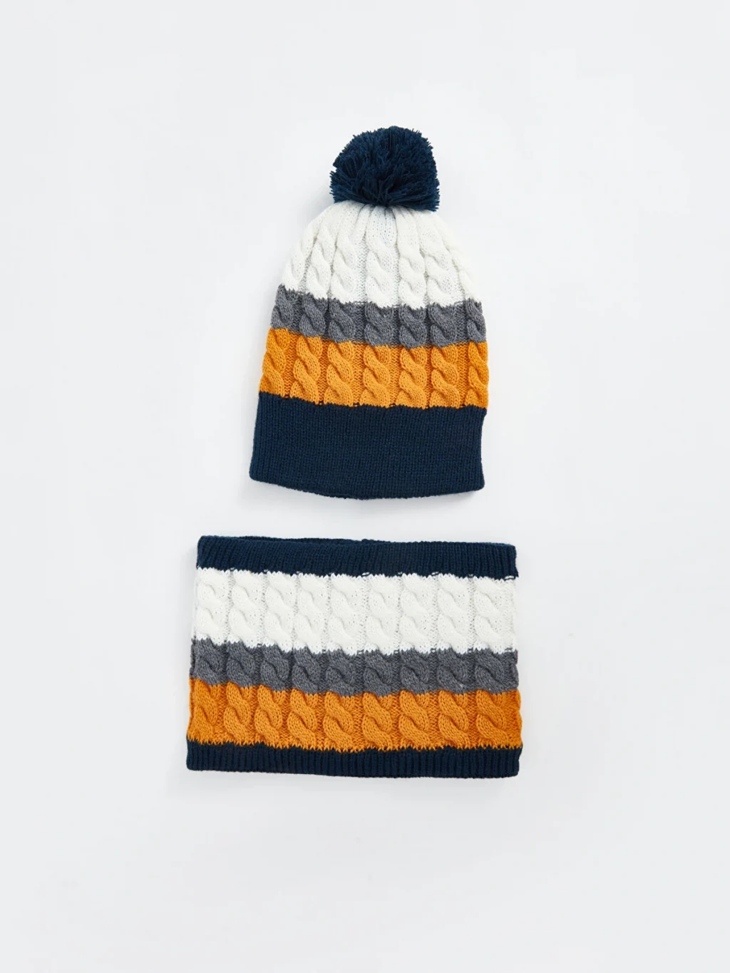Erkek çocuk için ponponlu, saç örgüsü desenli bere ve aynı desene sahip boyunluktan oluşan triko takım.