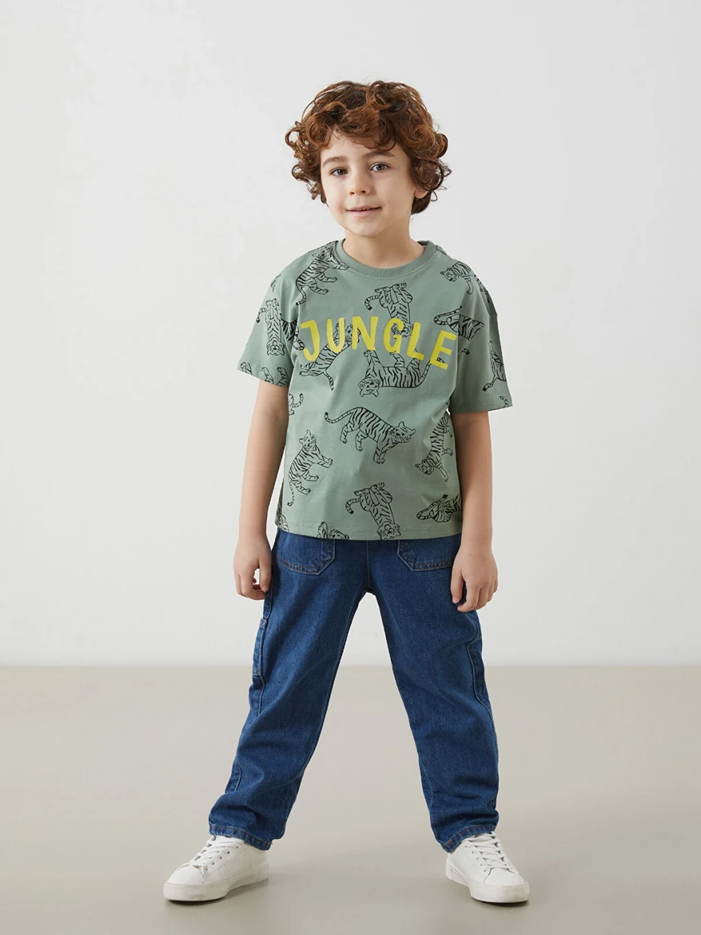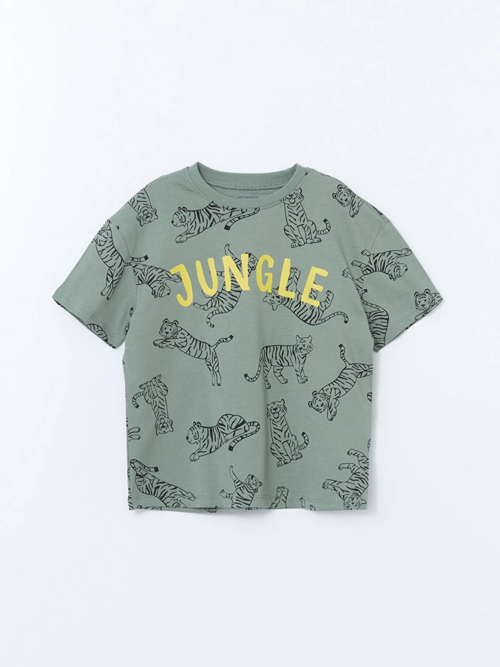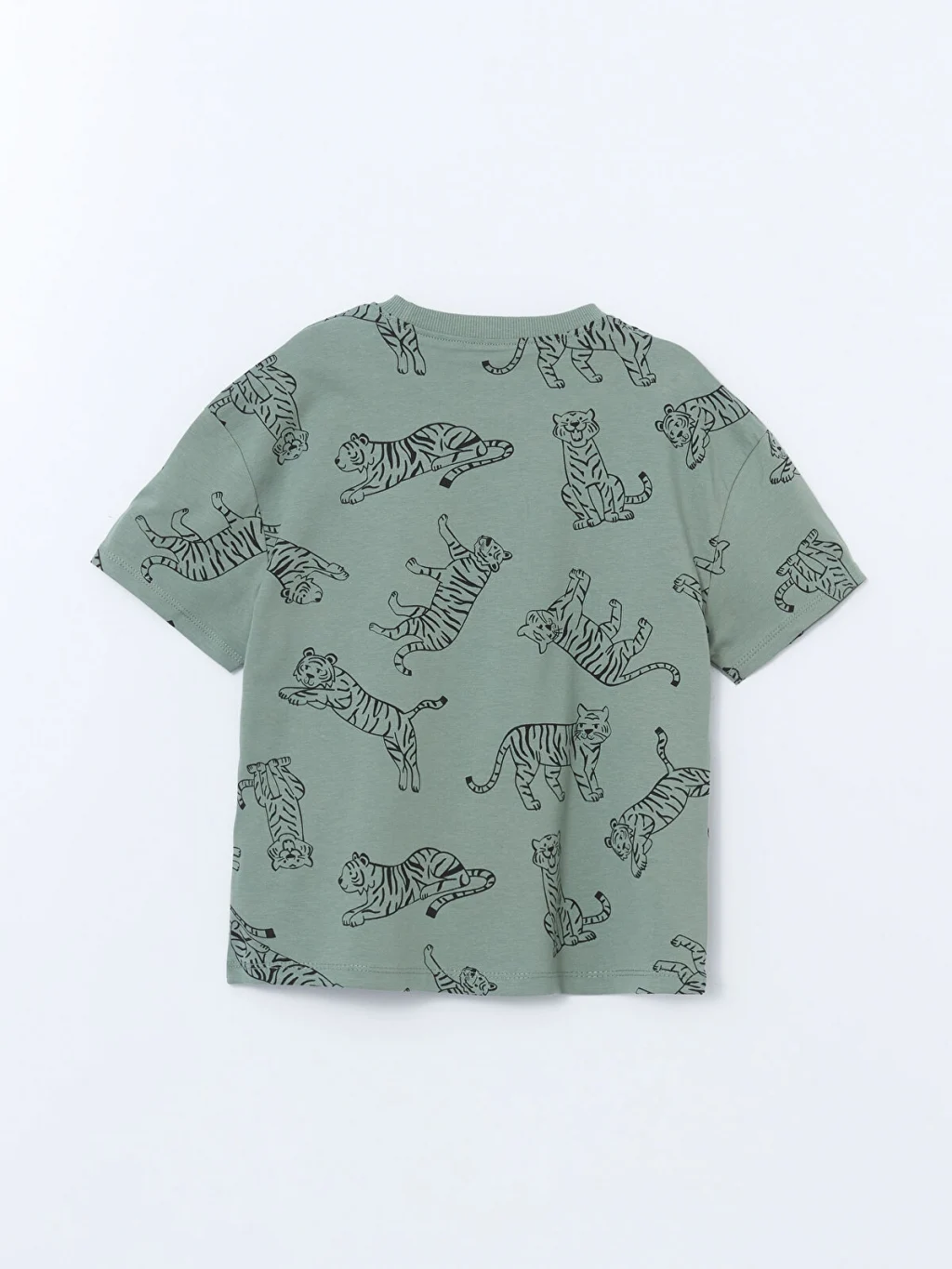 Standart kalıp, bisiklet yaka, kısa kollu erkek çocuk tişört, %100 pamuklu penye kumaştan üretilmiştir. Kaplan desenli ve önü baskılıdır.