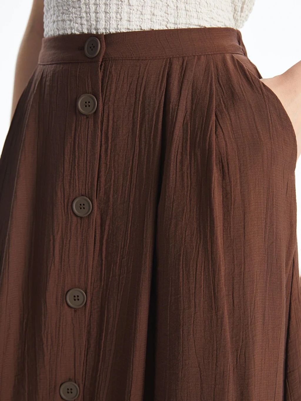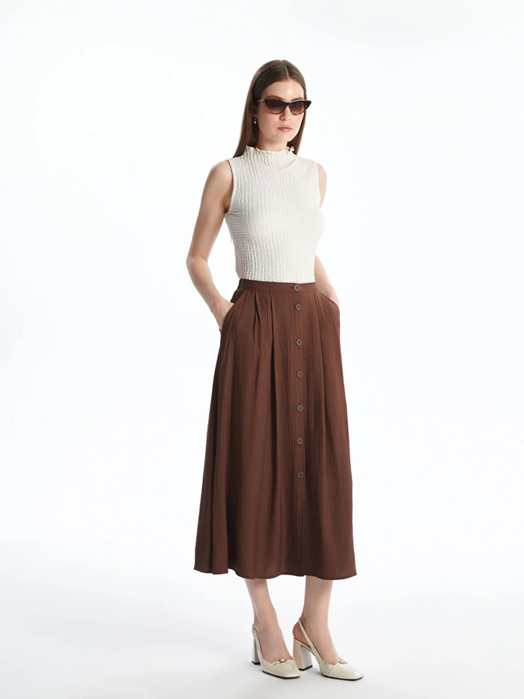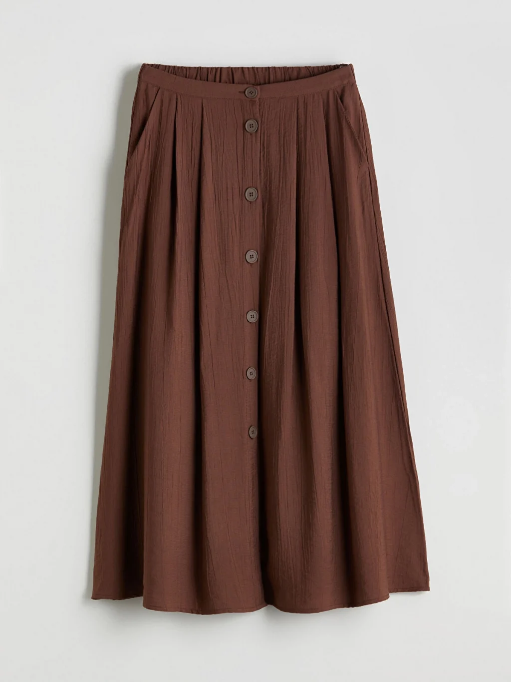 Beli lastikli dokulu pileli etek, krinkle kumaştan üretilmiştir. Önü düğmeli ve iki yandan cepli olarak tasarlanmıştır.